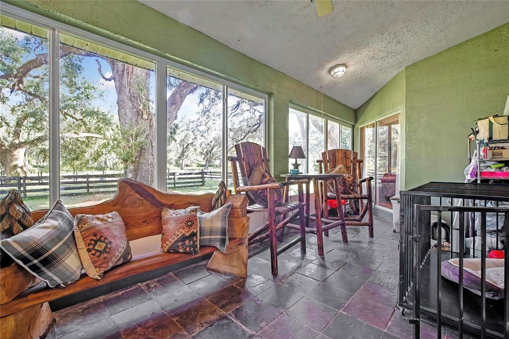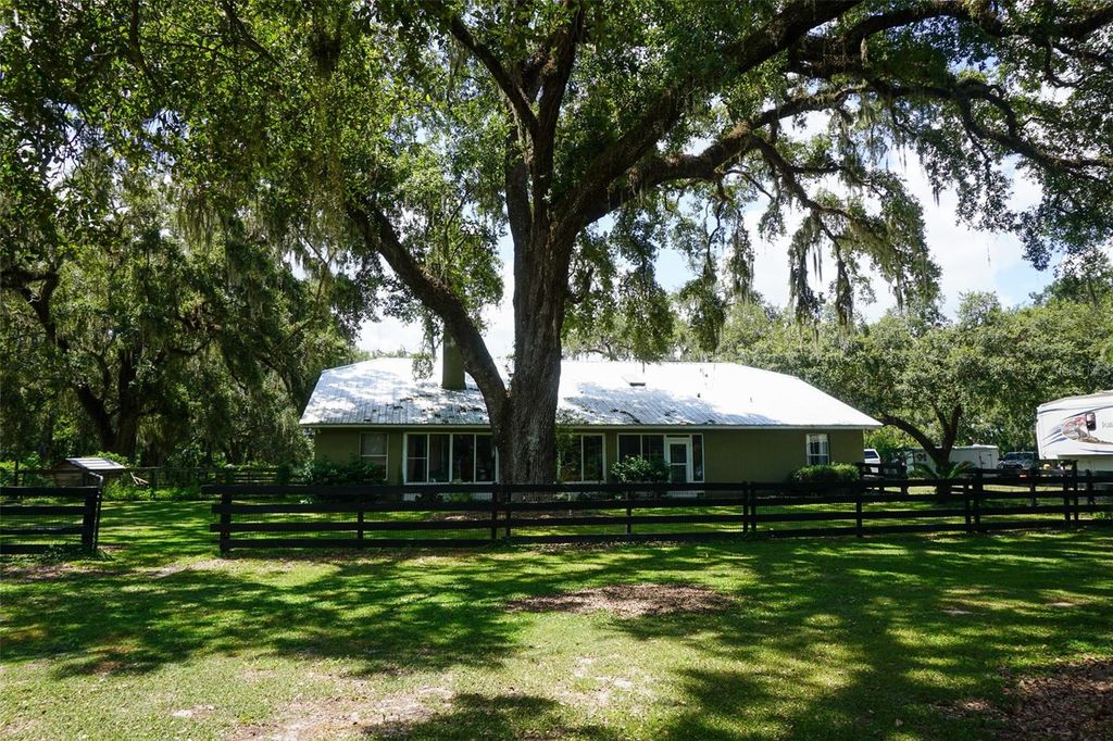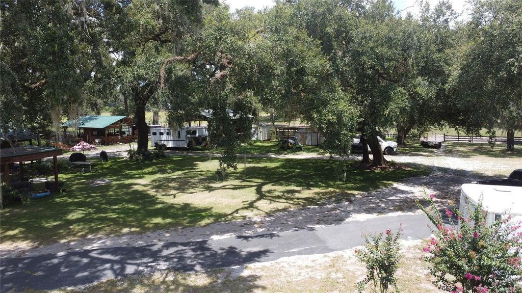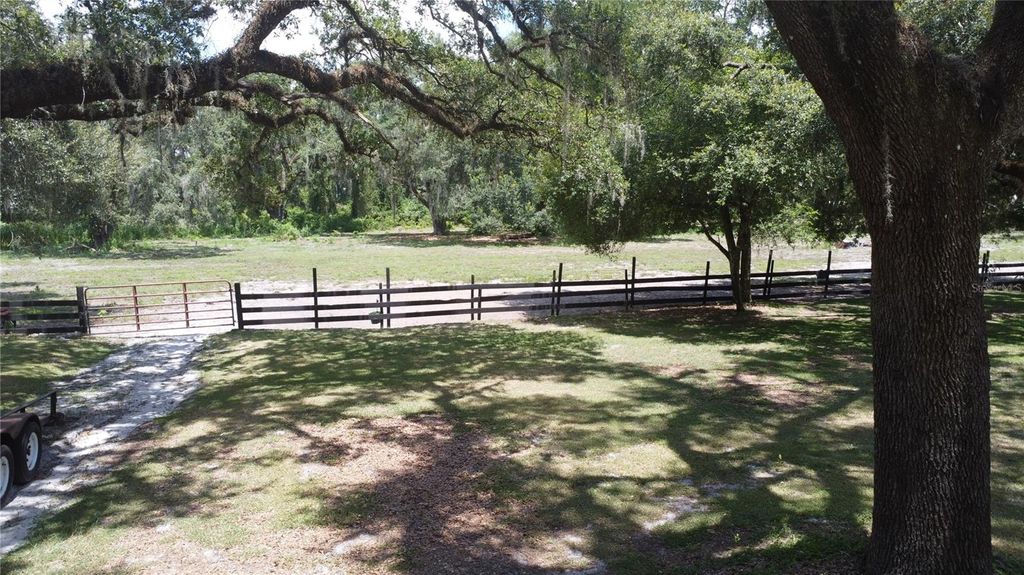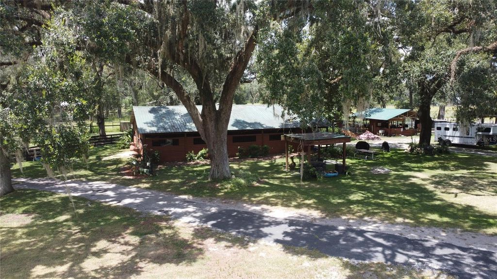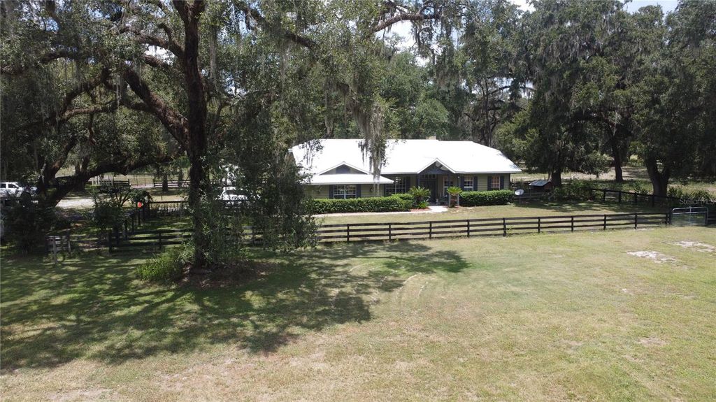 Escape to the country and enjoy the perfect blend of comfort and rural living on this beautiful 10-acre property. Located at the dead end of a paved road, you will be surrounded by majestic live oaks and the peaceful tranquility of quiet country living while still being convenient to town. The inviting 3-bedroom, 2-bathroom concrete block home offers an open concept living and dining room area with 14 ft ceilings and a cozy wood burning fireplace. Bright kitchen with ample storage and granite countertops, a private office right off foyer, and a split bedroom floor plan. The primary suite features a spacious bedroom (14x20), his and her walk-in closets, and large bath with jacuzzi tub. Some of the other key features of this home that will make it rise above the competition include textured concrete exterior siding, a 2018 metal roof, 2018 ac unit, brand new 2025 water heater, and new impact resistant front entry doors. Not to mention this home also has a 2-car garage, fully enclosed sunroom, water filtration system and a 30-amp trailer hookup with concrete pad. Outdoors you'll find level, useable agriculture acreage ideal for gardening, livestock, or simply enjoying the mature landscaping. This property has never flooded and is high and dry. When you first drive through the gated entry you will see the main horse barn. This Barn is 36x60, features 8 -12x12 stalls with rubber mats, separate feed and tack rooms and a wash rack. This barn was built to last- the 6x6 posts have rebar and concrete 6 ft down and overlapped purlins with hurricane straps to withstand Florida's unpredictable weather. The second barn features 4 miniature sized stalls, and a bathroom with outdoor shower. The last barn on the property is 16x40. Perfect for storage of livestock trailers/campers or you could easily wall in and have an enclosed shop. Lastly, there is also an 8x30 concrete dog run- consisting of 4 separate pens. There is also a gazebo with fire pit and a chicken coop. This property is the perfect setup for owning a variety of animals! Less than 5 miles from downtown Bushnell and I-75. Also convenient to the Villages, turnpike, Tampa, Orlando, and Ocala WEC! Your country retreat awaits-motivated sellers! Schedule a showing today!