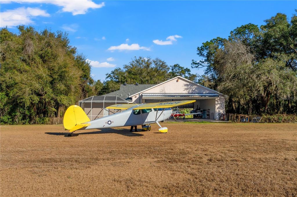 Experience true fly-in living with this exceptional airpark estate positioned directly on a 3,500 foot private grass runway. Ideally located near The Villages and Ocala, the property offers convenient access to shopping, dining, medical, and equestrian amenities while maintaining the charm and privacy of Old Florida surroundings. Lake Weir sits just across the street, offering lakefront dining, world class bass fishing, boating, and waterfront recreation. Mountain bike and Outdoor enthusiasts will appreciate proximity to the Marjorie Harris Carr Cross Florida Greenway and the Santos Trails, both known for exceptional mountain biking and hiking experiences throughout Central Florida. The renowned WORLD EQUESTRIAN CENTER in Ocala is also within easy reach, adding premier equestrian events, fine dining, and year-round entertainment to the lifestyle appeal of this exceptional location. The property itself features an attached approximately 3,000 square foot aircraft hangar, delivering a rare combination of residential comfort and aviation functionality. For buyers seeking a Florida airpark home with direct runway access, this property represents one of the most compelling values currently available. Designed with a desirable split floor plan, the home includes two oversized primary suites, each with generous walk-in closets and en suite baths, ideal for multi-generational living, extended guests, or dual primary accommodations. Upstairs features a large third bedroom that can also function as a secondary living area, media room, or private guest retreat. Tile flooring spans the entire main level for durability and low maintenance, while the open concept living, dining, and kitchen areas create seamless flow for entertaining. The kitchen is thoughtfully appointed with abundant counter space, bar seating, and a large walk-in pantry, making it equally suited for everyday living or hosting after a day in the sky. The attached hangar is equipped with a full bathroom and separate wash sink, offering substantial space for aircraft storage, maintenance, workshop use, or luxury vehicle storage. Direct access to the private grass runway eliminates the need for off-site hangar rentals and delivers the ultimate convenience for aviation enthusiasts. If you have been searching for a fly-in community home near Ocala, a private runway property in Central Florida, or a residence with an integrated aircraft hangar, this opportunity checks every box. Properties that combine this level of aviation infrastructure, functional layout, and strategic location rarely come to market. Schedule your private showing and experience runway-front living at its finest.