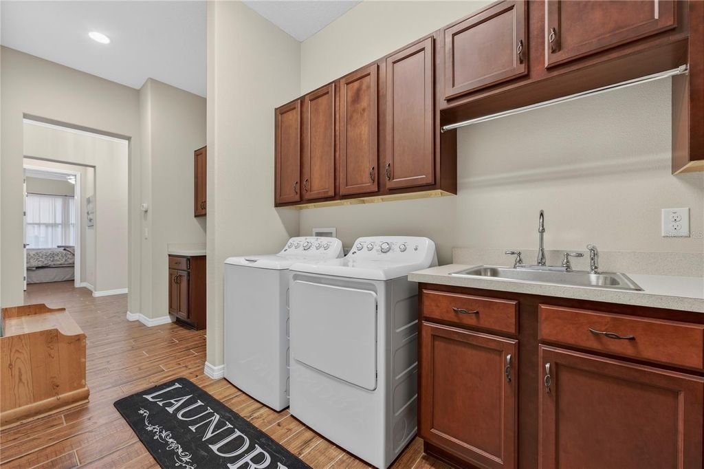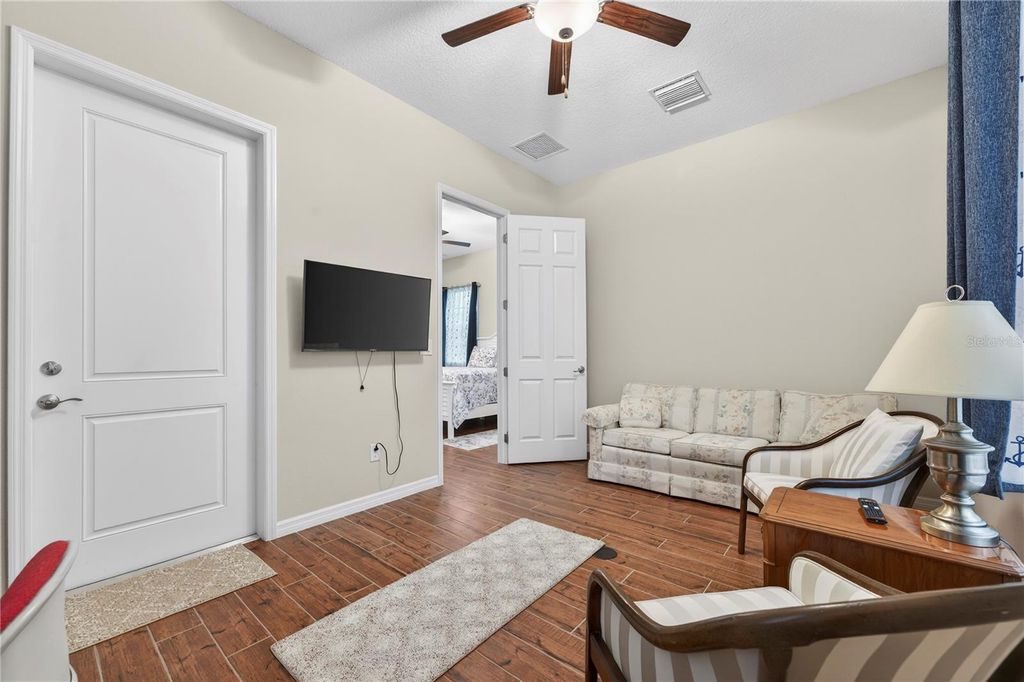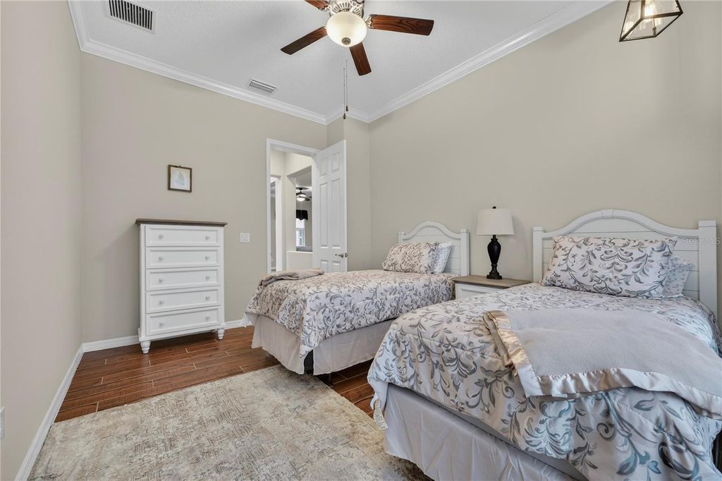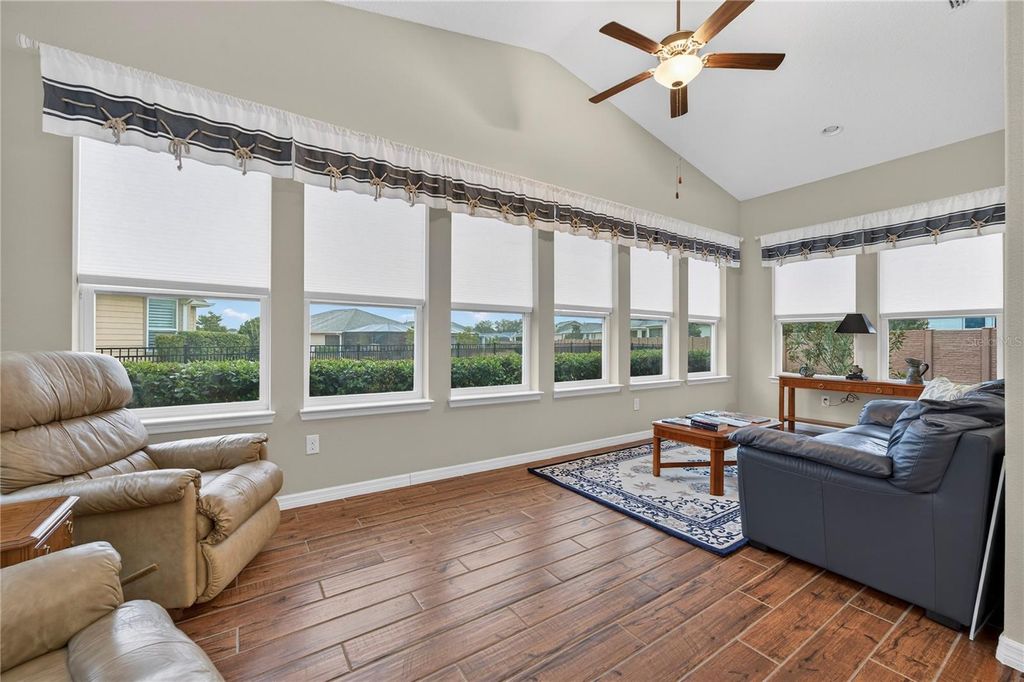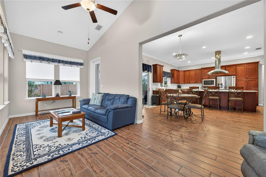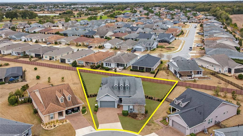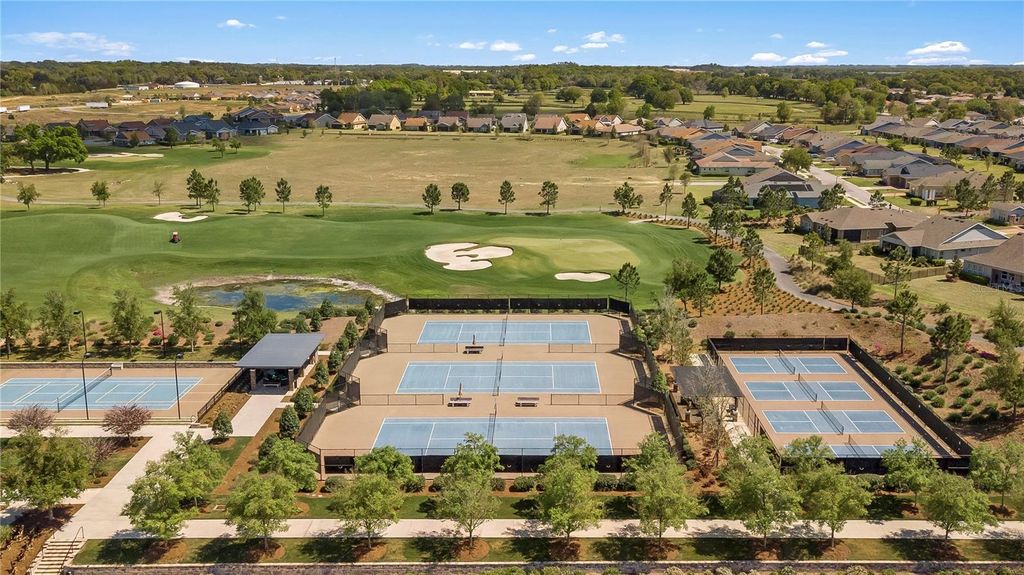 This beautifully maintained Shea built Imagine model is being sold completely turn-key furnished - and yes, that includes a 2019 lithium-battery EZ-GO golf cart that is fully golf-course compliant. Tucked at the end of a quiet cul-de-sac on an oversized 1/3-acre lot, this property offers exceptional privacy and space that's hard to find. The layout was intentionally designed with the kitchen positioned at the back of the great room, creating the perfect flow for indoor/outdoor entertaining while also allowing for expanded cabinetry. Quartz countertops, a natural gas cooktop, and the original electric cooktop (which is also included) give you options. As with all Shea homes, this property features natural gas for cooking, heating, hot water, and the dryer - and for added peace of mind, there is a 22KW Generac generator tied directly into the natural gas line. The spacious great room opens seamlessly into a sunroom featuring vaulted ceilings and walls of double-pane Low-E windows, bringing in beautiful natural light while maintaining energy efficiency. A three-zone A/C system keeps the home comfortable year-round. One of the most desirable upgrades in this model is the hobby room option. With its own private courtyard entrance and direct access to the guest bedroom, this flexible space works beautifully as a home office, private guest retreat, or even a potential third bedroom. Throughout the home, you'll find thoughtful upgrades including crown molding, porcelain tile flooring in every room, 8-foot interior doors, and impressive 10-foot ceilings - details that truly elevate the feel of the home. The extended smart-space laundry room includes a utility sink and an exterior door for added convenience. Outdoor living is just as inviting with an expanded, screened lanai designed for both relaxing evenings and entertaining friends. The back porch features an insulated ceiling, allowing you to comfortably leave furniture in place while keeping it protected from the elements.And it truly is move-in ready. The home is being sold fully furnished - furniture, dishes, utensils - everything stays. Just bring your clothes and toothbrush. Also included: a whole-house water softener. Located within the 55+ section of the community, you're only 10 minutes to the World Equestrian Center, about 6 miles to downtown Ocala, and just minutes from the Reilly Arts Center. The HOA takes care of lawn and landscaping maintenance - mowing, edging, trimming, fertilizing, irrigation maintenance and water, along with high-speed internet and full access to the incredible amenities: indoor and outdoor fitness areas, group classes, 20 miles of walking and biking trails, bocce, horseshoes, tennis, pickleball, fishing dock, kayaking, canoes, and paddleboats. Residents also receive discounts at the community restaurant, golf course, and spa. There are no CDD assessments, and a home warranty is included for added confidence.