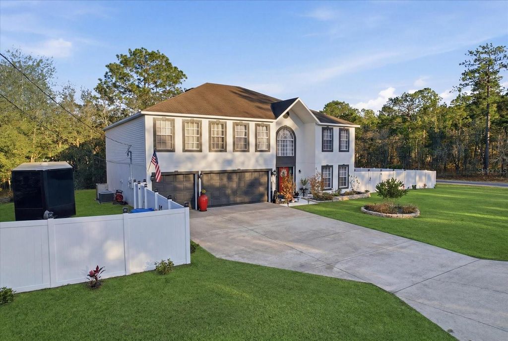 Welcome to 7185 N Farmington Terrace "” a stately two-story home offering over 4,000 square feet of thoughtfully designed living space on a .30-acre lot in Citrus Springs. With its symmetrical façade, arched architectural detail, and striking red front door, this home makes a memorable first impression. Inside, soaring ceilings and an open-to-below design create a bright, spacious feel from the moment you enter. The main level offers multiple living spaces, including a formal living room, dedicated dining area, and a separate family room "” providing flexibility for entertaining or everyday living. The updated kitchen is both stylish and functional, featuring granite countertops, tile backsplash, extended cabinetry, soft-close drawers, dual sinks, a center island, and abundant prep space. A sunny breakfast nook overlooks the backyard, and a mud room just off the garage adds everyday convenience. A downstairs en-suite bedroom offers an ideal setup for guests, extended family, or multi-generational living. Upstairs, the spacious primary suite easily accommodates a sitting area and features oversized walk-in closets and a dual-vanity bath with generous counter space. Additional bedrooms are thoughtfully arranged, several with en-suite access, along with a large upstairs loft/family room "” perfect for a media room, game room, or second gathering space. The pool table conveys, making this entertainment area ready to enjoy from day one. Fresh paint, modern lighting, updated finishes, and a brand-new HVAC system provide both style and peace of mind. Step outside to a covered patio and fully fenced backyard with 6-foot vinyl privacy fencing accented by solar lighting. Multiple gates, including an oversized 12-foot gate, allow easy access for boats, RVs, trailers, and recreational vehicles. There's still ample room to create your dream outdoor oasis or add a future pool. Beyond the property, you'll appreciate the convenience of nearby shopping, dining, and everyday essentials just minutes away. The home is close to Publix, Winn-Dixie, Walgreens, UPS Store, Ace Hardware, local restaurants, fitness studios, and additional retail at the Shoppes of Citrus Hills "” offering both convenience and lifestyle in one desirable location. As an added opportunity, the owner also has an additional adjacent lot available and is offering owner financing "” a rare chance to expand, build, or invest.