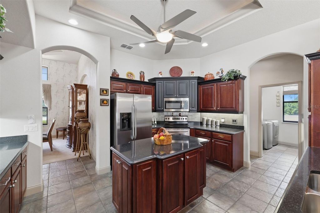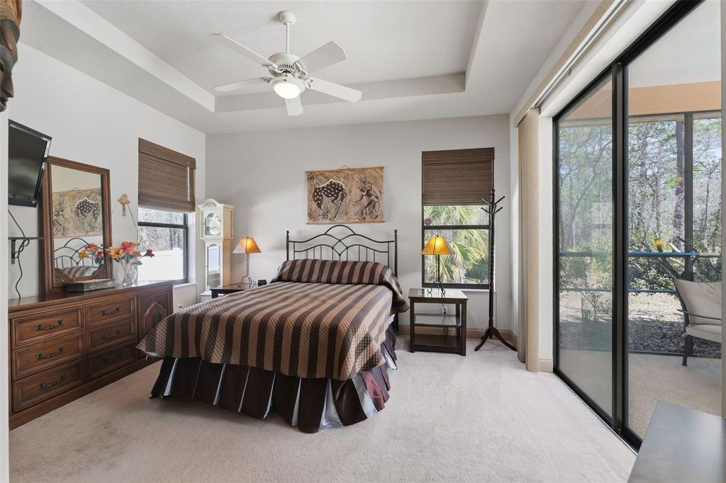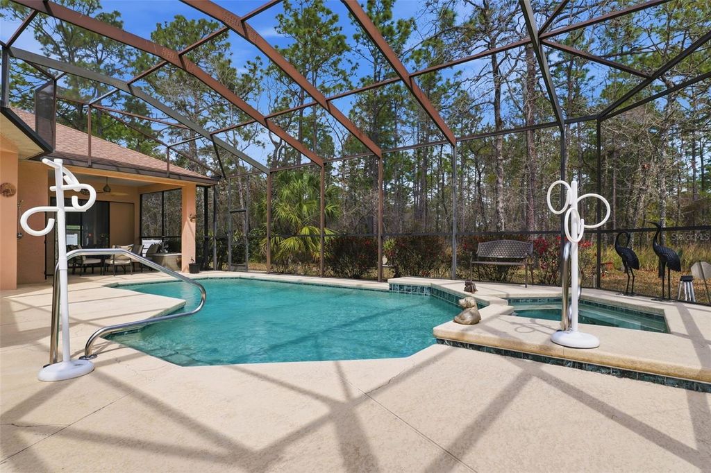 Under contract-accepting backup offers. Situated on a generous 0.27-acre lot within the established Sugarmill Woods community, this 3-bedroom, 2-bath residence with a 3-car garage offers a split plan designed for comfortable Florida living. The covered front entry features a soaring ceiling and space for outdoor seating. Enter through the double French doors into the foyer where stone-look tile flooring continues through the main living areas, complemented by high ceilings and a coat closet. Straight ahead, the living room sits at the center of the home with well-maintained carpet flooring, tray ceiling with crown molding and sliding glass doors that open to the rear patio and pool area, allowing natural light to fill the space. To the left of the foyer, the dining room is highlighted by a rounded column and features a matching tray ceiling, same tile flooring, and a large picture window with a transom above overlooking the landscaped front yard. Moving through the living room, the kitchen features granite countertops, solid wood cabinetry with crown molding, stainless steel appliances including a trash compactor, a center island with cabinet storage below, breakfast bar seating, dual sink, tile backsplash, and built-in wine rack. The nearby breakfast nook showcases a bay window design that frames views of the pool and surrounding landscape. The attached family room offers additional gathering space with carpet flooring, a gas fireplace with decorative tile, built-in entertainment space with shelving, and a sliding glass door leading directly to the screened patio and pool area. The primary bedroom features carpet flooring, a tray ceiling with crown molding, sliding door access to the patio, and an ensuite bathroom with dual walk-in closets. The ensuite bath includes coordinated tile flooring and wall finishes, a soaking tub beneath a window, dual vanities with storage cabinets, a wall-to-wall mirror, built-in shelving, a water closet, and a walk-in shower with a bench. Bedroom 2 includes double entry doors, a tray ceiling, multiple windows, sliding glass doors with direct access to the pool area, carpet flooring, and built-in closet with shelving. A shared bathroom positioned between the bedrooms includes a single vanity and step-in shower. Bedroom 3 features carpet flooring, a tray ceiling, a large centered window, and a built-in closet with shelving. The laundry room near the kitchen includes a window, utility sink with counter space, and multiple overhead and base cabinets for storage, while a nearby hallway provides corridor access to the garage. The garage features two separate doors accommodating a 3-car layout. The rear covered patio and pool area overlooks the wooded landscape behind the property and includes a built-in kitchen with cabinets, refrigerator, sink, grill, and counter space, along with a screened pool that has been well maintained and features an attached spa and outdoor shower. All sliding glass doors leading to this space are pocket doors, creating a seamless transition between indoor and outdoor living. Residents of Sugarmill Woods enjoy a community known for its greenbelt design and optional membership to Sugarmill Woods Country Club and Citrus National Golf Club. Amenities include golf, tennis, pickleball, fitness facilities, dining, and social activities. Located along Florida's Nature Coast, the area is minutes from the Gulf of Mexico and nearby spring-fed rivers offering opportunities for boating, fishing, kayaking, and wildlife viewing.