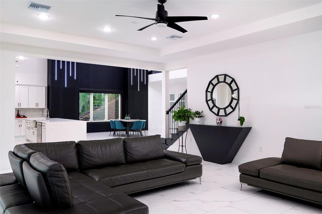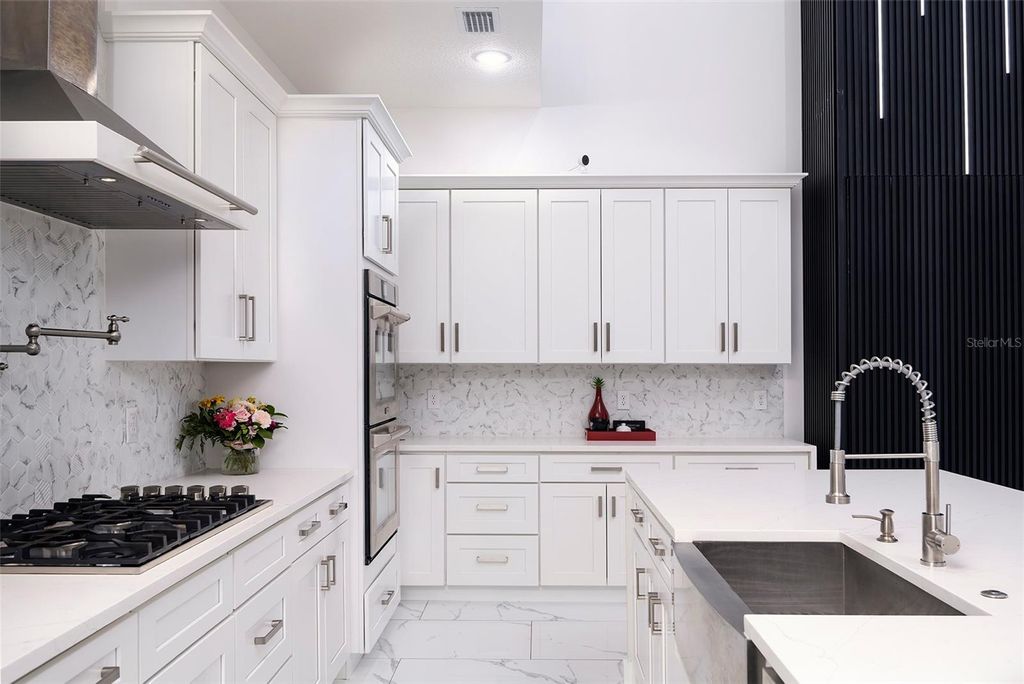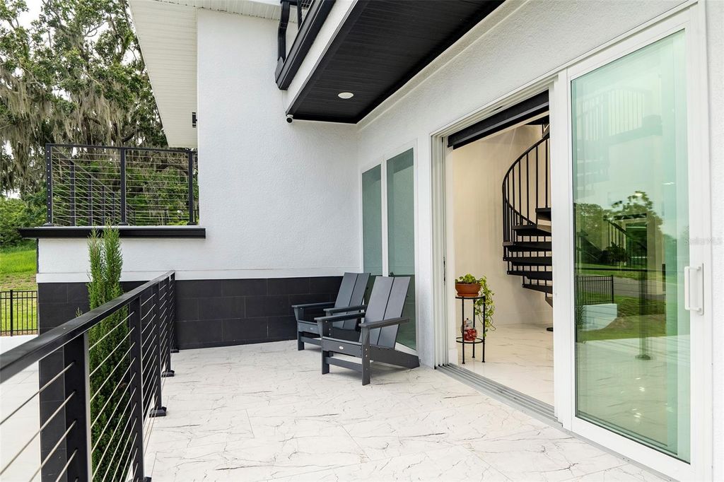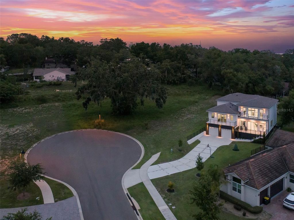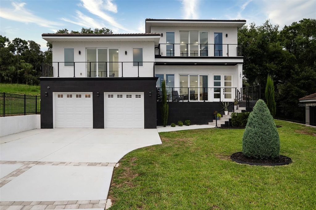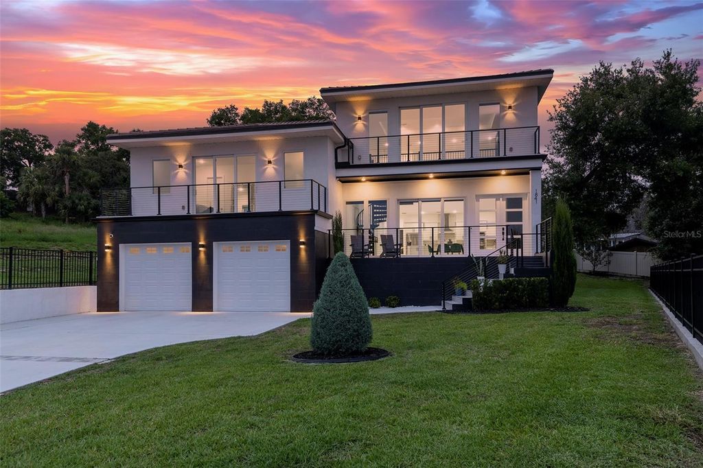 Meticulously designed contemporary residence nestled in the gated enclave of The Moorings of Clermont. Situated on a unique oversized lot on a quiet cul-de-sac boasting the most impressive lake views and sunsets. This private enclave only has 15 developable estately lots located off South Lakeshore Drive adjacent to the impressive Lake Minnehana. This burgeoning city is located just 18 miles to Disney World or about an hour to Tampa. This home presents a rare opportunity for those interested in superior contemporary living boasting 22-foot high ceilings, 5 ensuite bedrooms, 5.5 bathrooms, a massive 657 square feet two-car garage, 3,859 square feet of interior living space and over 6,039 square feet of total space! Home features a breathtaking slice of paradise nestled among other prestigious homes full of Spanish Moss tress and walking distance to The Moorings clubhouse on the Lake. Home has room to add a pool in the backyard! Property offers its occupants seamless indoor and outdoor living spaces with breathtaking lake views from nearly every room. This entertainer's and boater's dream home comes with a recently installed private boat lift. Detailed and thoughtfully designed home with many recent custom upgrades by the sellers! Interior features include extensive modern finishes, eat-in kitchen, and airy coastal vibes throughout. Exterior features complete hurricane impact windows and doors including the garage door, multiple balconies, spacious front porch, large covered patio in the facing the backyard, elongated decorative driveway that can fit many vehicles. Gorgeous nostalgic spiral staircase leads up to a fine indoor and outdoor seating area with breathtaking panaramic lake views. Interior features quartz counters, designer custom cabinetry, walk-in closets, ZLINE stainless-steel appliances and six-burner gas stovetop complete with extending pot filler, laundry room with washer and dryer. Full alarm system with six (6) cameras, Nest thermostats, custom double pantry, custom entertainment walls and accents walls throughout with LED lighting, tankless hot water system, electrical power shades, Porcelain floors throughout interior and exterior living areas and bathrooms, luxury vinyl in primary master suite, and carpet in additional bedrooms. Seller recently installed a 4,000lb boat lift that is included in sale. ***Seller is also selling separately a 2024 Yamaha AR195 (19.5ft) supercharged jet boat with 7k in stereo system upgrades, navigation and fish finder. Boat has very few hours used on it.*** Minutes to downtown, entertainment, shops, restaurants and more! Sale includes a limited home warranty until 08/29/28.