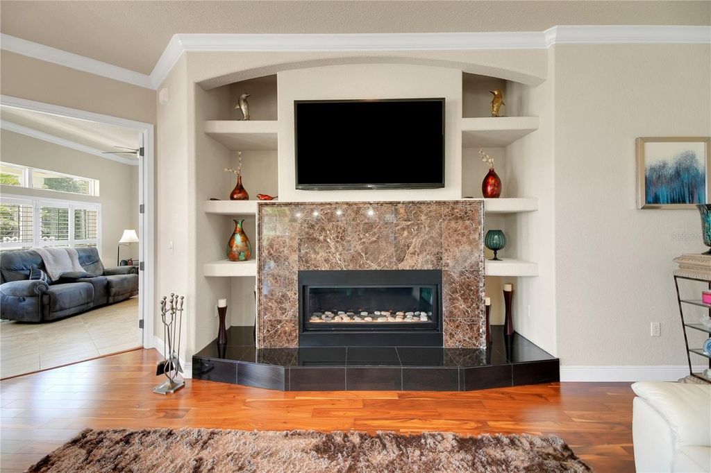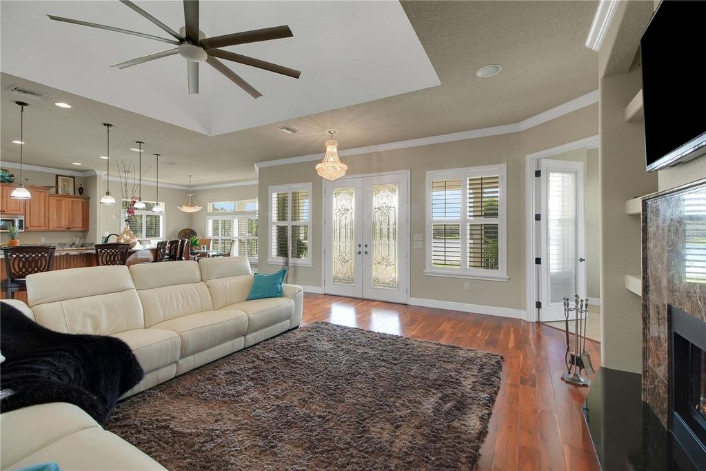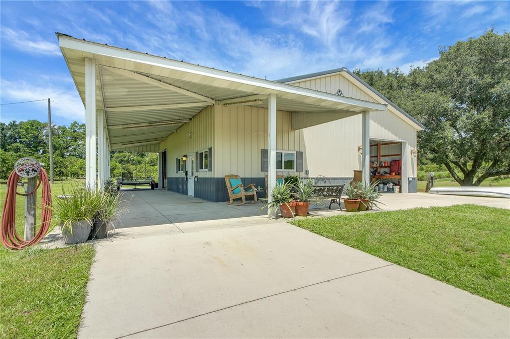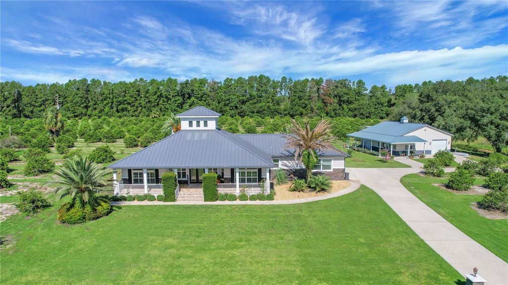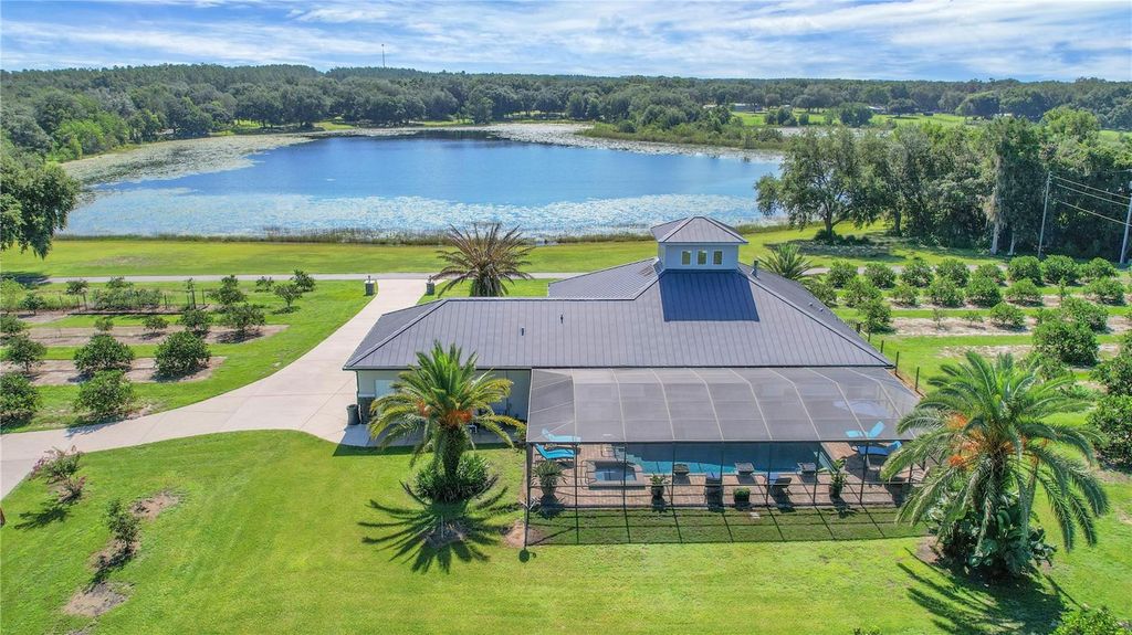 Step into luxury and tranquility with this stunning lakeview pool home nestled on 13.74 acres, built in 2015 and exterior freshly painted in 2024. The main house offers 3 spacious bedrooms and 2 bathrooms plus there is an additional 1 bed 1 bath guest quarters with kitchen plus living room! Southern Living at its finest when you are greeted by this expansive (55 x 14) Veranda with pavers overlooking your almost 100 feet of lake waterfront! From the moment you enter, you'll notice the rich hardwood floors flowing through the living and dining areas, complemented by crown molding and plantation shutters that add elegance throughout much of the home. The chef's kitchen is a showstopper, featuring beautiful hickory cabinets, granite countertops, stainless steel appliances, a center island, breakfast bar, and a walk-in pantry"”perfect for everyday living and entertaining. The primary suite is a serene retreat with double-door entry, diagonally laid tile flooring, and abundant natural light. The ensuite bath includes a double vanity with granite, a soaking tub, and a walk-in shower with a built-in seat. Enjoy convenience with an inside laundry room offering ample storage, counter space, and a utility sink. Step outside to your private oasis"”a 7.6 foot deep saltwater pool with a hot tub, all surrounded by pavers that extend into a covered lanai. Surround sound is installed throughout most of the home and continues into the pool area for the perfect entertaining experience. A durable commercial-grade metal roof and gutters offer long-term peace of mind. Guests will love the separate, tiled guest house which includes a bedroom, bathroom with walk in shower, living room, kitchen and 54 X 13 covered porch"”"” ideal for extended stays or potential rental income. The Living Room Fireplace, the pool heater, the fire pit and the grill are all supported by a 250 gal GAS propane tank. New pool pump installed March 2026. Attached is a spacious Morton Barn with an RV-height door 12'6 plus 2 electric 10 ft doors providing incredible storage or workshop potential. Currently there are over 950+ orange trees on property that have been harvested yearly by the owner until recently so they are now harvested by an outside company. If someone does not want the orange trees then some or all could be removed. A peaceful koi pond adds to the serene atmosphere, making this property feel like a private retreat"”yet it's just 15 minutes from shopping, restaurants, medical facilities, and The Villages.