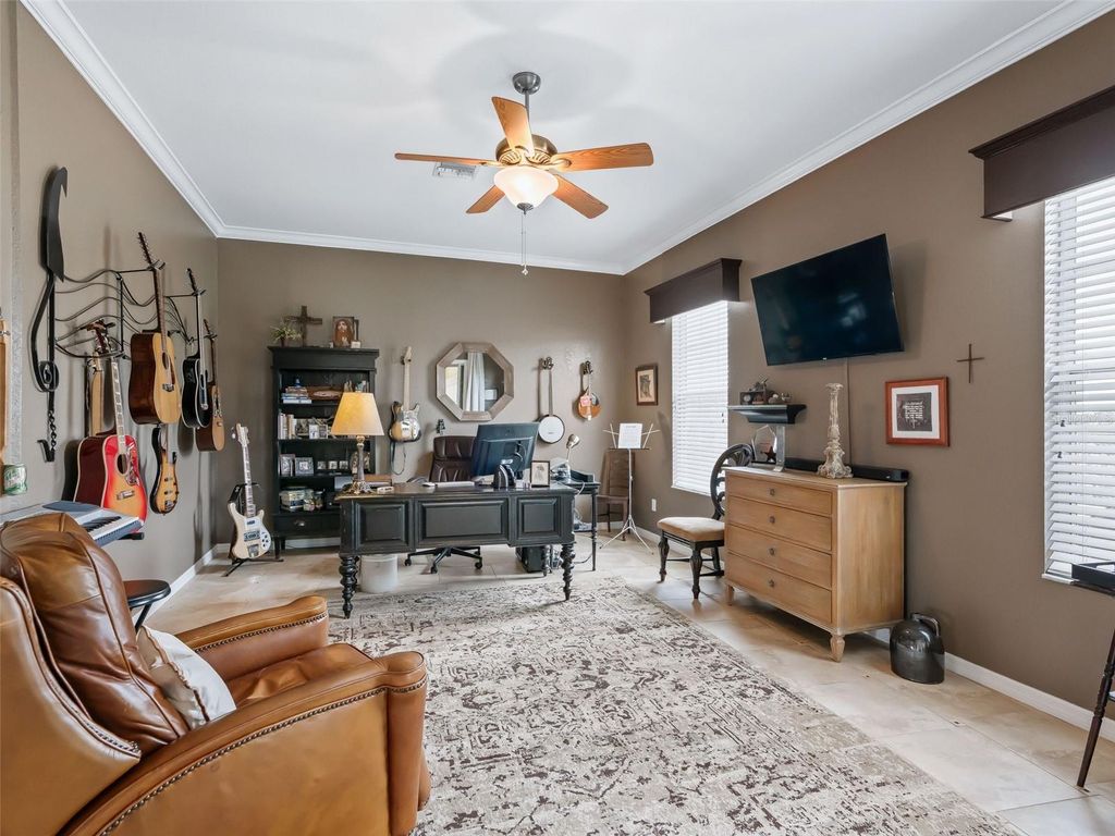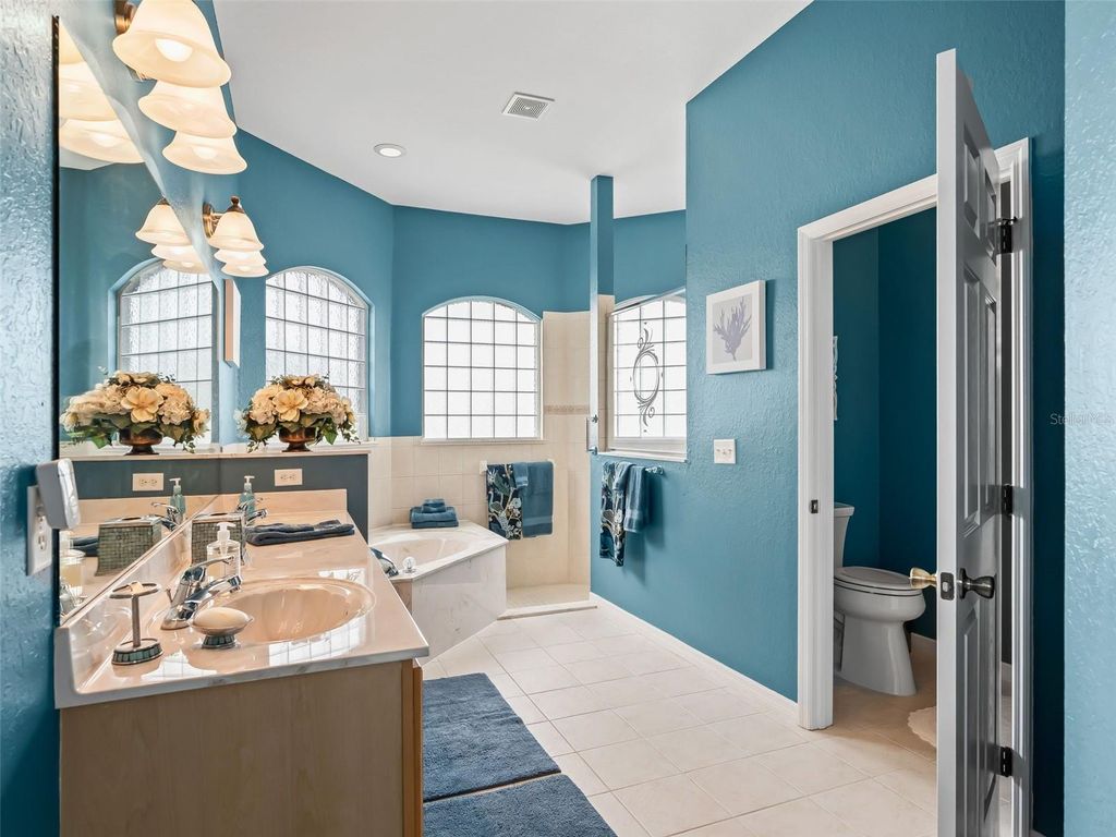 STEP INTO YOUR NEW LUXURY LIFESTYLE! HOA FEE JUST $152./MO. Consider this CUSTOM HOME with a FENCED IN YARD, LARGE, OPEN, split floor plan, on a semi private lot, with direct access to WALKING TRAILS, in an active Florida community offering many activities to choose from. This EXPANDED SPRUCE MODEL in the MEADOWS neighborhood was perfectly customized by adding the glassed in Florida Room (additional 640 SF), see PA for info., that boasts approx. 2,645 SF of heated and cooled living and ENTERTAINMENT SPACES! From the moment you view the property and all the outside features, to the moment you step inside to experience all the indoor features you will know YOU ARE HOME. THIS IS IT! This AMAZING HOME with REAR PRIVACY and a TWO CAR+ GOLF CAR GARAGE with storage and an extended driveway for all your parking needs is just perfect. This beautiful recently updated home has features that will truly captivate you! Outstanding details include a Freshly painted interior and exterior, 10' ceilings throughout, crown molding, wood laminate and impressive inlaid ceramic tile flooring. The customized chef's kitchen offers a center island, solid surface counters, reverse osmosis water filtration system, tile backsplash, under cabinet lighting, walk in pantry and extensive, recently added custom cabinetry for even more storage! The luxurious primary suite includes a custom walk-in closet with a window, and the large primary bath ensuite offers a large soaking tub, spacious double sink vanity, a roman walk-in shower, a private watercloset w/ a closet, as well as another large walk in closet, all designed with beauty and an abundance of natural light. It cannot be expressed enough how luxurious this HOME is on a PREMIUM LOT in Stonecrest, where you Step outside to a spacious wraparound large patio with a remote controlled Sun Setter, with wind sensor retractable awning, a fenced yard, and peaceful views with the morning sun or the perfect romantic dinner. Major Updates include: NEW ROOF (2023), 2016 glass enclosed lanai, and a split Mitsubishi HVAC UNIT(2023). And many additional improvements since 2023 (see feature list). Today could be the BEST DAY OF THE REST OF YOUR LIFE! If you're searching for a home in a private, gated, golf community, look no further"”you've found your dream lifestyle at Stonecrest. Nestled in the heart of Central Florida, Stonecrest is a deed-restricted, active adult golf community that offers the perfect blend of luxury, convenience,and recreation. Imagine waking up every morning in a community designed for those who cherish an active lifestyle, where golf cart access takes you to nearby shopping and more. At Stonecrest, you'll have access to an array of world-class amenities, including four community pools, one of which is a serene indoor pool"”along with a spa and a fully equipped fitness center. Whether you're looking to stay fit, relax, or meet new friends, you'll find it all here. With over 90 clubs to join, you'll never run out of opportunities to explore your passions and hobbies. The clubhouse is a hub of social activity, featuring a popular, casual dining restaurant where you can enjoy great food and even better company. For the golf enthusiast, Stonecrest boasts 18 holes of championship golf, providing a challenging and scenic experience. The fun doesn't stop there"”enjoy lighted pickleball courts, softball, and so much more. Welcome to Stonecrest, where every day feels like a vacation.