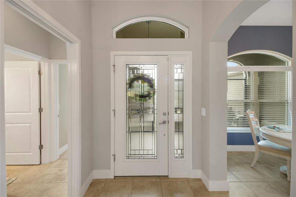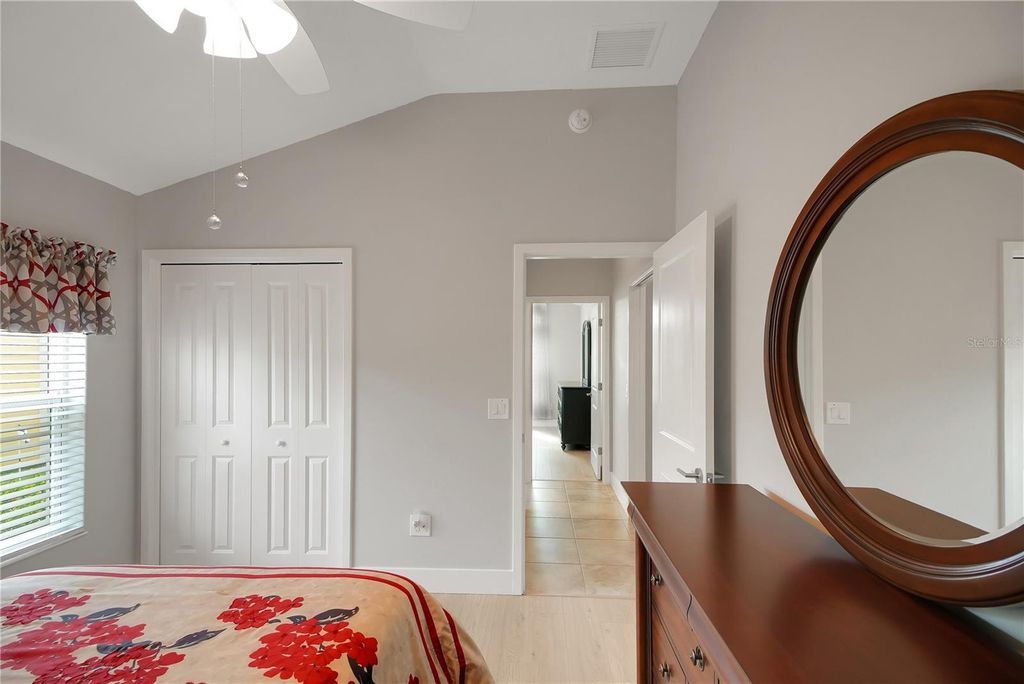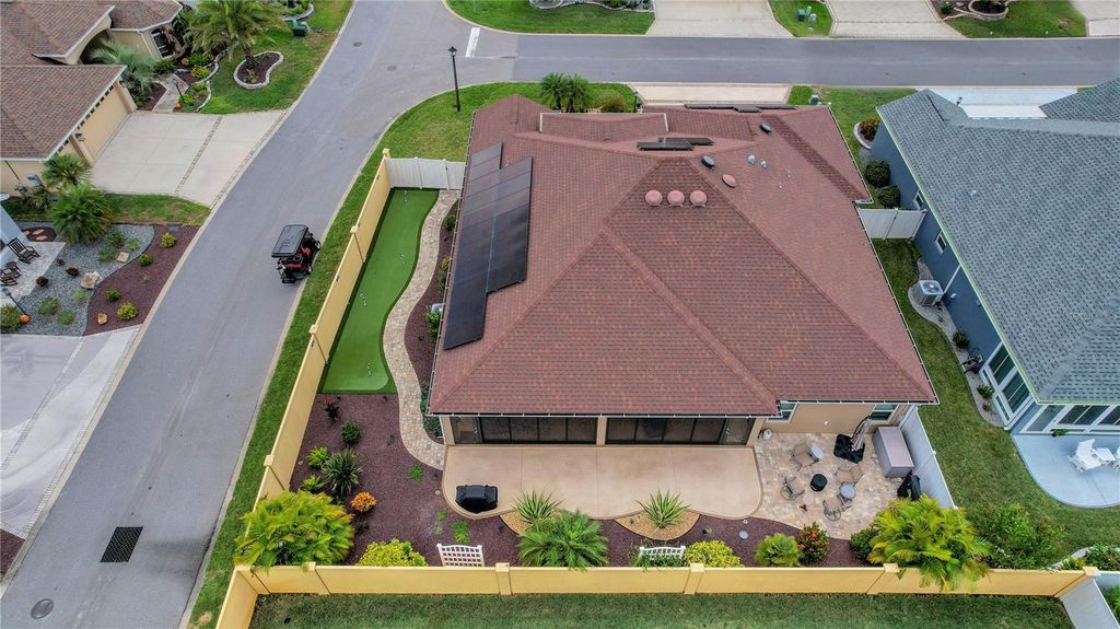Under contract-accepting backup offers. Welcome to this lovely 2019 built 4 bedroom 3 bathroom 3 car garage (29'4" x 22'9") home with upgrades galore in the Village of Monarch Grove. This home features an OUTDOOR PUTTING GREEN, solar panels (PAID OFF), whole house water filtration system as well as MAGIC STAIRS, an elevator storage lift in the garage and 2 solar fans & added shelving/flooring in the attic. Step inside to see beautiful tile floors in the main areas and premium laminate flooring in the bedrooms. The kitchen is a chef's dream with dark wood cabinets, gas stove, white quartz countertops, stainless steel appliances, island, breakfast bar, breakfast nook, and a cabinet pantry. The spacious primary suite offers a coffered ceiling, 2 walk-in closets, an en suite bathroom with two separate vanities, a Roman shower, and a water closet. The inside laundry room offers tons of storage and a utility sink. All three guest bedrooms offer tall ceilings and closets for storage. In addition, One guest bedroom has a Murphy bed with attached fold-down desk for your family and friends. The massive FL room (38' x 9'6") with Mini-split is perfect for entertaining especially with the sliding doors that can be stacked so that you have a full view. The fully fenced backyard gives privacy while the patio area adds a great space to enjoy the beautiful outdoors while the screened front porch is a great place to enjoy your morning coffee. Located within easy reach of restaurants, shopping, and all the amenities The Villages has to offer, this beautiful home truly combines style, function, and location in one exceptional package.