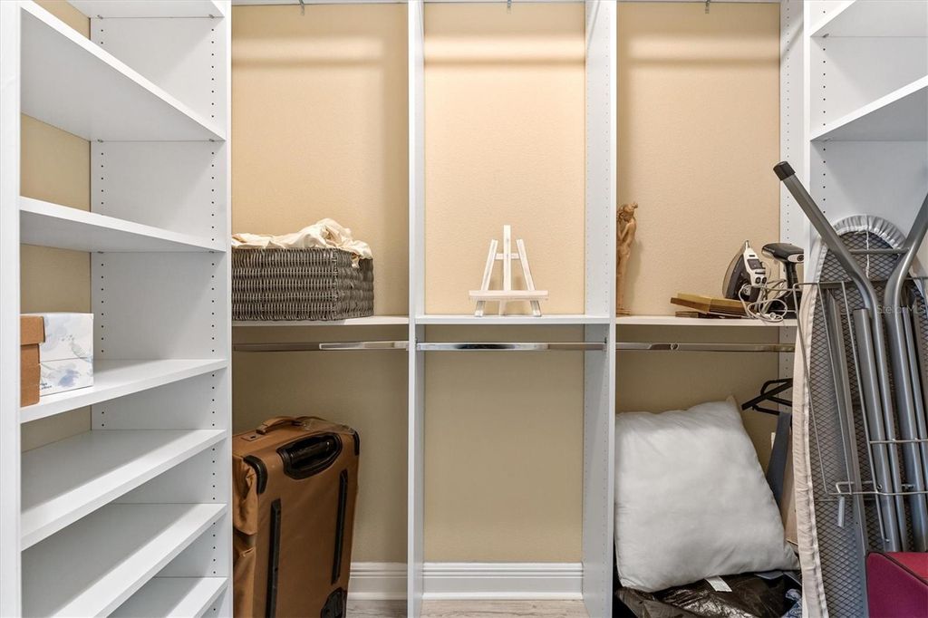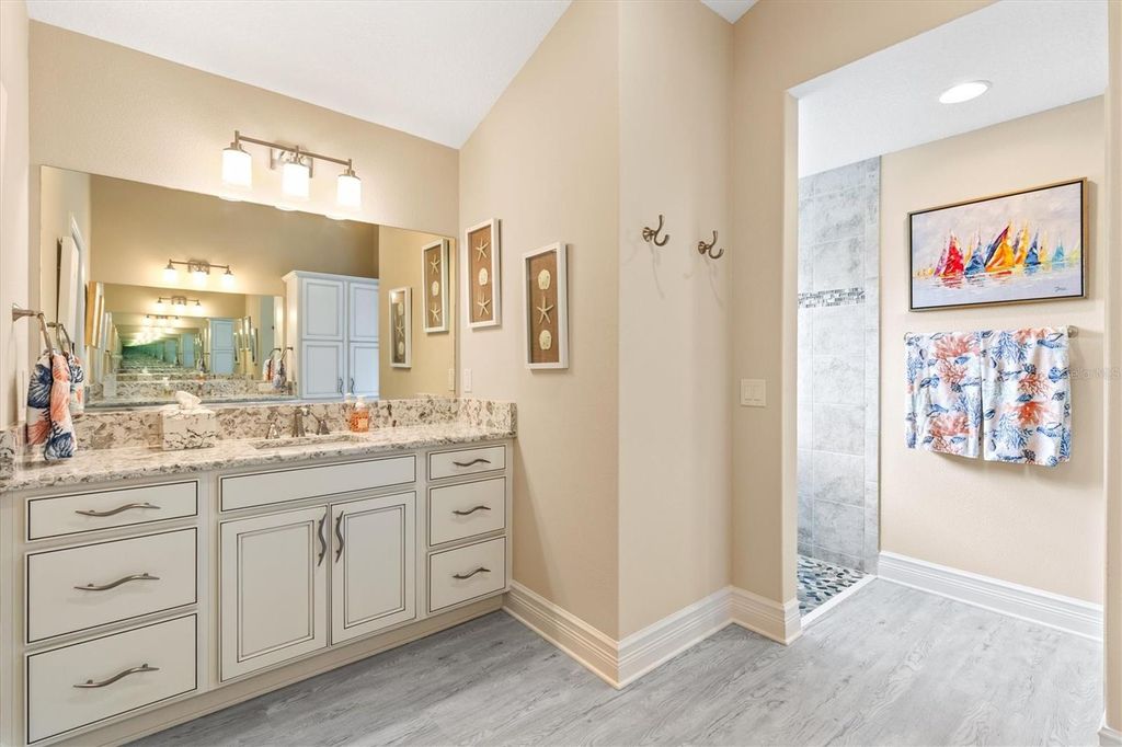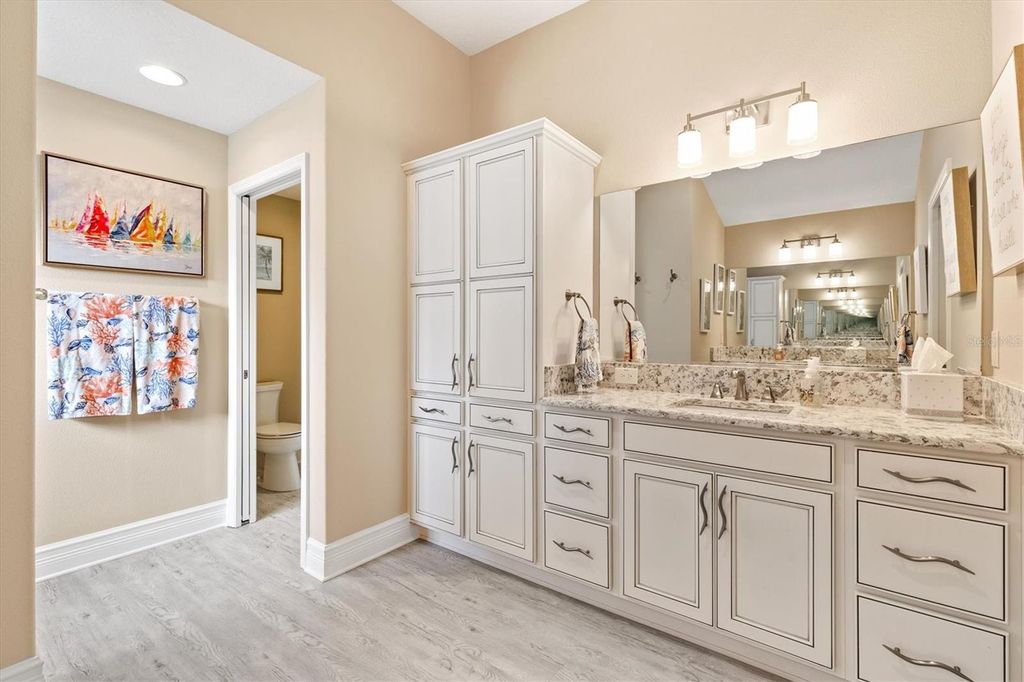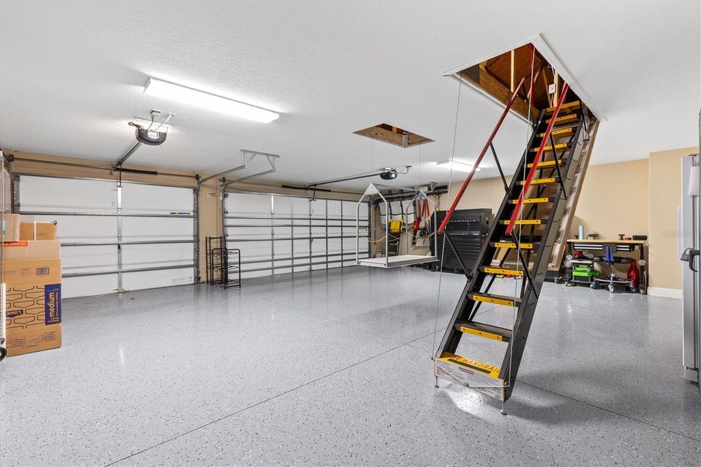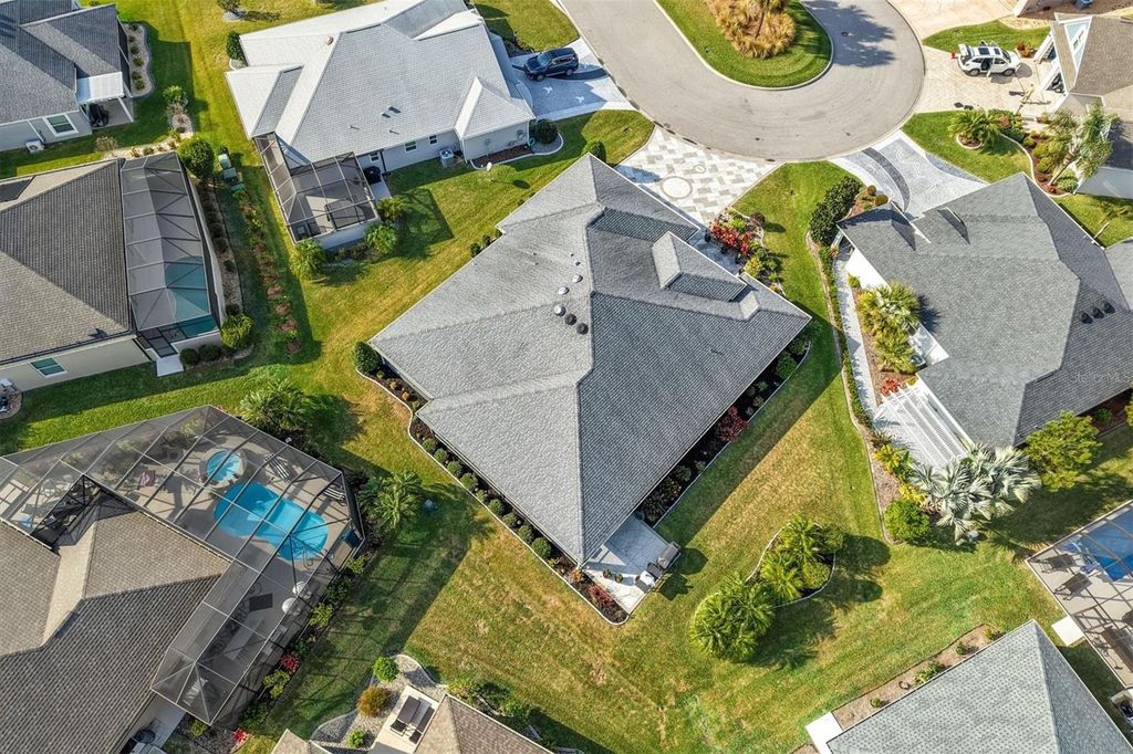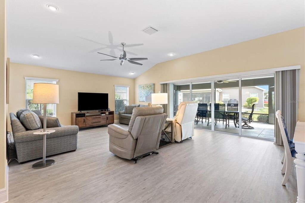 Under contract-accepting backup offers. Custom Extended Woodside "¢ Oversized Cul de Sac Lot "¢ ROOM FOR LARGE POOL with T&D Diagram "¢ 39 Foot Screened Lanai with Motorized Shades "¢ 3 Car Climate Controlled Garage "¢ Near Eastport, Middleton, Brownwood, and Sawgrass Grove. This BETTER THAN NEW, Exceptionally Customized and Extended Woodside Model sits on a large CUL-DE-SAC LOT in the Village of McClure in The Villages, Florida and offers a rare combination of scale, upgrades, outdoor living, and future pool potential. From the moment you arrive, professionally landscaped grounds, stamped concrete details, and an expanded front patio establish a high level of craftsmanship throughout the property. The interior was freshly painted in 2025 and features NEW LUXURY VINYL PLANK FLOORING throughout with six-inch baseboards for a clean and modern finish. The open concept design centers around a quartz kitchen island with double sided cabinetry, electrical outlets on both sides, farmhouse sink with sprayer faucet, soap dispenser, garbage disposal with air switch, and a full-service workspace that overlooks the main living area. The kitchen also includes 42-INCH CABINETRY, tiled backsplash, sliding pull out shelves, and KitchenAid appliances including a GAS RANGE with pot filler, DOUBLE OVENS, dishwasher, and refrigerator. The Primary Suite includes a tray ceiling, dual custom built in closets, and an ensuite with split vanities, Roman style tiled shower with pebble flooring, and a private water closet with pocket door. The guest wing includes two bedrooms with built-in closets, one with a tray ceiling and one with vaulted ceilings, separated by a bath with tiled walk-in shower, bench, niche, and transom window. A fourth bedroom currently serves as an office and includes sliding doors to the lanai, a custom closet, and direct access to a third full bath with walk in shower. The laundry room includes tall pantry cabinetry with pull-outs, over the washer & dryer cabinet storage, and direct garage access, and additional closets throughout the home support organized storage. Outdoor living is anchored by telescoping sliding doors opening to a thirty-nine-foot screened lanai with no see um screens, raised concrete transitions, and electronic privacy and weather shades by Shade Brothers. The backyard is oversized and private with room for a 44x18 pool and a diagram by T&D Pools is included to show the possibilities. The 882 square foot epoxy coated THREE CAR GARAGE is fully climate controlled with a mini split system and includes insulated doors, attic lift with Majic Stairs, added decking and insulation, three wall mounted storage racks, added electrical outlets, and a refrigerator and upright freezer that convey as is. Additional systems include a tankless water heater, whole house water filtration, Nova softener, Ecobee thermostat with sensors, six-inch gutters, lightning rods, irrigation system with misters, stone landscape edging, Sherwin Williams Rain Shield exterior paint with ten year warranty, soffit holiday outlets, Simply Safe alarm system with cameras and sensors, and a Bluetooth porch light speaker. The location provides convenient access to Eastport Town Square, Downtown Middleton, Brownwood Paddock Square, Sawgrass Grove, Magnolia Plaza, and nearby championship golf with regional access to Orlando and Florida's beaches.