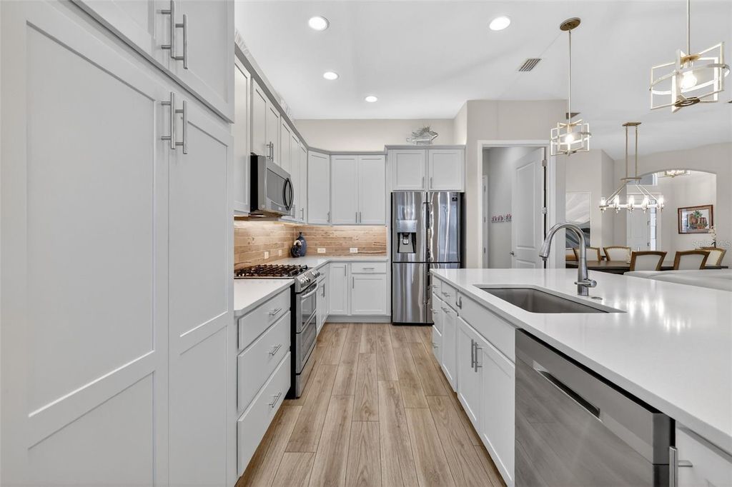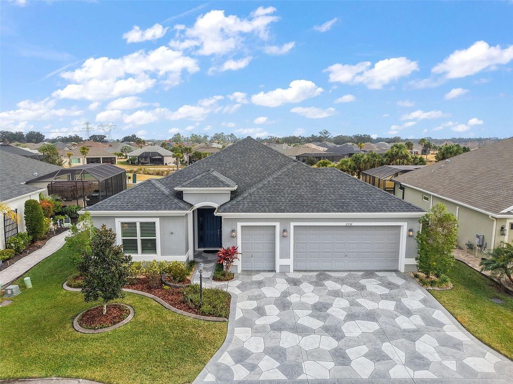 OVERLOOK MAGNIFICENT GOLF FRONT VIEWS in this EXQUISITE, TURNKEY w/ GOLF CART 3/2 DESIGNER IRIS-10 with HOT TUB and EXPANSIVE 671sf TWO CAR + GOLF CART GARAGE set on an OVERSIZED LOT with ROOM FOR A POOL (see pool sketch in attachments) in the highly desirable Village of Marsh Bend! IDEALLY SITUATED on the 7th hole of the Lowlands Golf Course, just blocks from Edna's on the Green and close to Brownwood Paddock Square and the NEW Eastport Square featuring live nightly entertainment! Built in 2020, this nearly NEW home offers LOW-MAINTENANCE peace of mind with MODERN DESIGN! DECORATIVELY PAINTED walk and driveways, CURBED landscaping beds, and a large transom and artistically etched side lit entry welcome you in to a GENEROUS foyer. This ELEGANT OPEN CONCEPT home boasts UPSCALE FINISHES THROUGHOUT including 10-foot HIGH ceilings; 8-foot doors; LUXURY VINYL PLANK flooring (no carpet); CONTEMPORARY lighting and ceiling fans; PLANTATION SHUTTERS; ENHANCED baseboards and trim; and CUSTOM closets. The GOURMET chef's kitchen showcases GORGEOUS ALABASTER SHAKER cabinetry with 42" upper cabinets; QUARTZ countertops; DOUBLE built-in PANTRY; PULL-OUTS; UNDER and OVER-cabinet lighting; TILE backsplash, STAINLESS appliances; GAS cooking; MASSIVE CENTER ISLAND with DOUBLE-SIDED gray cabinetry, EAT-IN seating with recessed toe kick LIGHTING; and an adjacent DINETTE area for casual dining. From either the living room or dinette DOUBLE sets of sliding glass doors invite you to RELAX and UNWIND in the SPACIOUS lanai featuring a PRIVATE HOT TUB and showcasing SWEEPING GOLF-FRONT VIEWS! Whether enjoying your morning coffee or hosting evening gatherings, this FABULOUS space offers seamless indoor-outdoor living with plenty of room for seating and dining, all while taking in the PEACEFUL PICTURESQUE LUSH FAIRWAYS and OPEN SKIES! Back inside, the private owner's suite features an arched entry bedroom with a beautifully appointed en suite bath with a CUSTOM WALK-IN closet; ALABASTER cabinetry; DUAL sink vanity with QUARTZ top; STUNNING corner WALK-IN shower with frameless glass and mosaic pebble TILE flooring; built in LINEN closet; and separate water closet. The guest wing, tucked behind a POCKET DOOR at the front of the home, includes two generously sized bedrooms with VOLUME ceilings and CUSTOM-shelved closets. The second bath offers an ALABASTER SHAKER vanity with QUARTZ top, TILED tub and shower combination, and a hall LINEN closet. An INTERIOR LAUNDRY ROOM boasts a BUILT-IN folding table/desk, additional cabinetry, and a high-capacity washer and dryer. Completing the home is an EXPANDED 671sf garage showcasing EPOXIED floors, HIGH ceilings, UTILITY SINK, and PLENTY of room for two cars, two golf carts, and extra storage! DON'T MISS YOUR OPPORTUNITY to make this INCREDIBLE HOME YOUR OWN! The Village of Marsh Bend is CONVENIENTLY LOCATED near Brownwood Paddock Square and the NEW Eastport town center; Ednas' on The Green with daily entertainment, food & drinks; close to numerous golf courses including Lowlands, Loblolly, Longleaf, Red Fox, Gray Fox, Marsh View Pitch and Putt, Fenney Putt and Play, and Southern Oaks Championship Course; Everglades Regional Recreation Complex; Cattail and Water Lily Recreation Centers; Hogeye Walking and Biking Trails; Magnolia Plaza and CR 44 with abundant shopping, dining, banking, and more! PLEASE WATCH OUR WALKTHROUGH VIDEO of this LUXURIOUS TURNKEY GOLF FRONT HOME and SCHEDULE YOUR PRIVATE SHOWING or VIRTUAL TOUR TODAY!