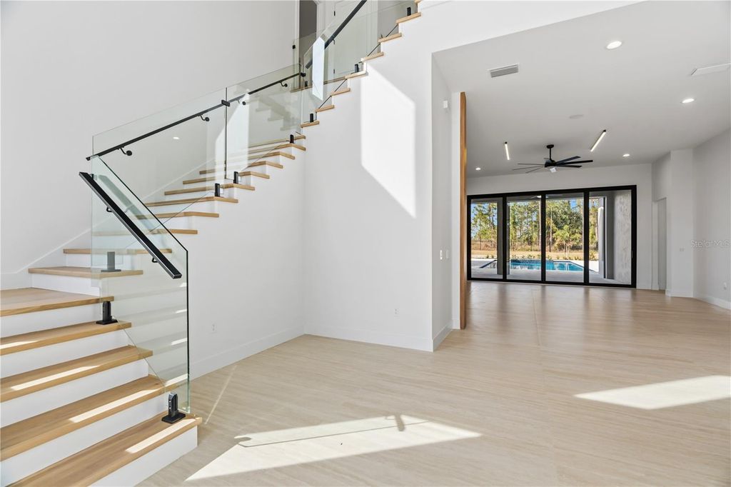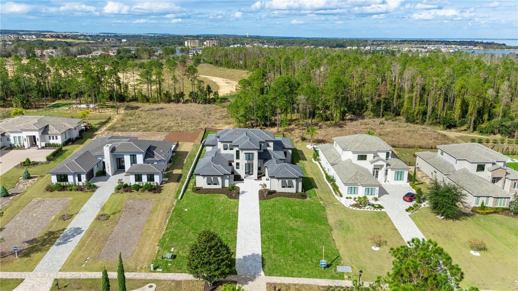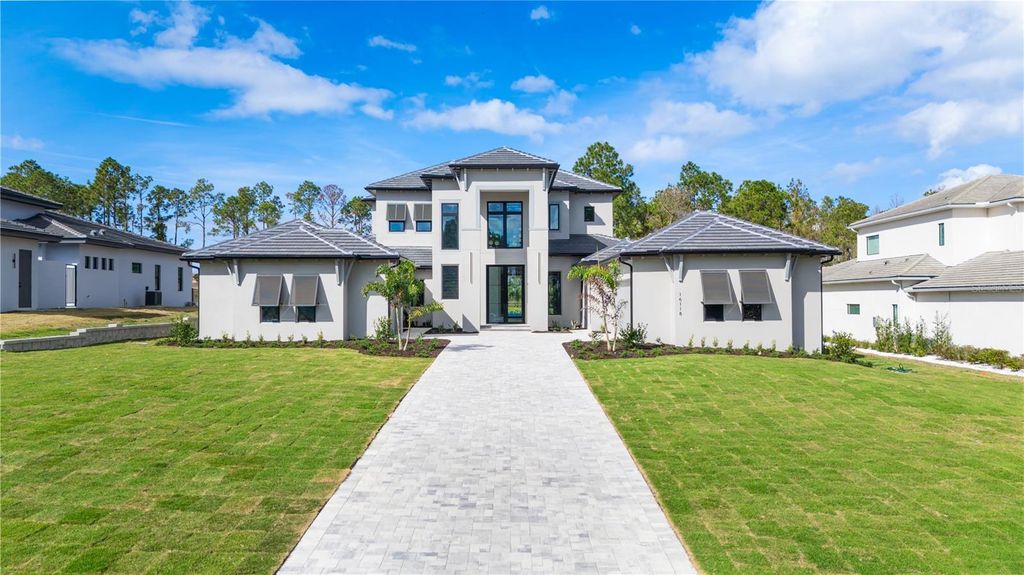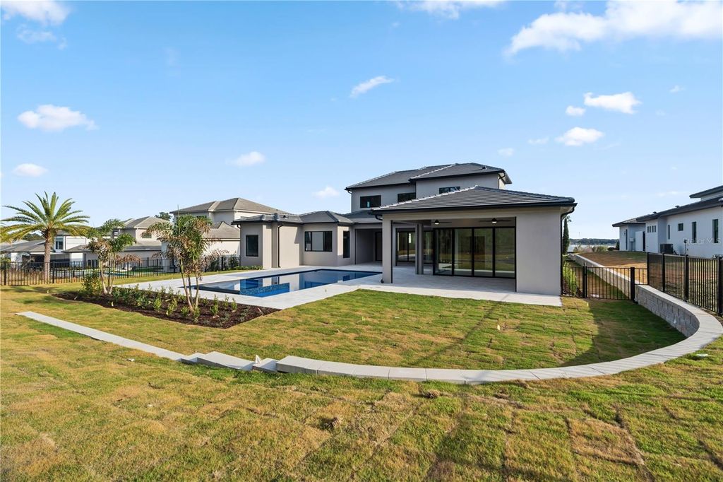 Move-In Ready * New Construction * this striking two-story custom residence on Lot 220 in Bella Collina by Delpupo Unique Homes delivers a bold architectural presence paired with thoughtful, modern livability. From the moment you enter, a dramatic two-story foyer sets the tone, anchored by a statement staircase featuring sleek glass-panel railings that draw the eye upward and flood the home with natural light. The main living level is designed for both everyday comfort and elevated entertaining. An expansive open floor plan connects the living room, dining space, and chef's kitchen, where a generous island, abundant cabinetry, and seamless flow create the heart of the home. Oversized 10-foot sliding glass doors - including mitered sliders in the game room - open wide to the outdoor living area, blurring the line between indoors and out. The first-floor primary suite is a true retreat, offering privacy and flexibility with an adjoining bonus room ideal for a home gym, study, or quiet lounge. Also on the main level is a second bedroom, thoughtfully positioned with a Jack-and-Jill bath shared with a versatile third bedroom or office. A large, well-appointed laundry room adds convenience with extensive cabinetry, a utility sink, and a secondary refrigerator. Upstairs, three additional bedroom suites each feature their own en-suite baths and walk-in closets, complemented by a spacious loft that provides the perfect setting for a media lounge or additional gathering space. Outdoor living is nothing short of exceptional. The backyard showcases a resort-style pool and spa, a fully equipped summer kitchen, and motorized screens enclosing the entire lanai - creating a year-round extension of the home. Smart home features and multi-room audio enhance comfort and functionality throughout select living spaces. Residents of Bella Collina enjoy a private, guard-gated lifestyle centered around a Sir Nick Faldo-designed championship golf course, a Tuscan-inspired clubhouse with fine and casual dining, a full-service spa, state-of-the-art fitness center, tennis and pickleball courts, and an active social calendar. Conveniently located just west of Orlando, Bella Collina offers the perfect balance of privacy, luxury, and accessibility. Developer will defer the $40,000 Sports Membership deposit at closing, offering immediate value and enhanced access to the community's premier amenities. This completed residence is ready for immediate move-in and an exceptional Bella Collina lifestyle.
