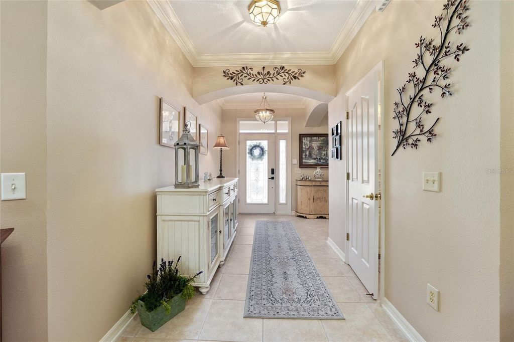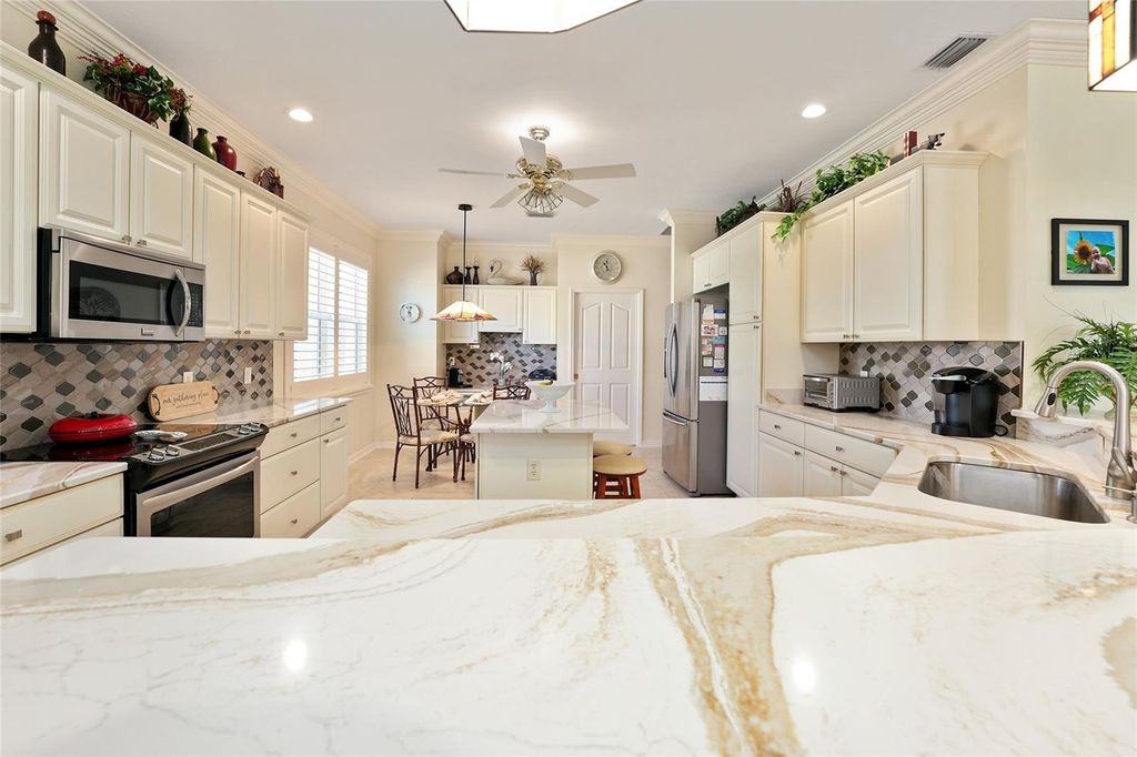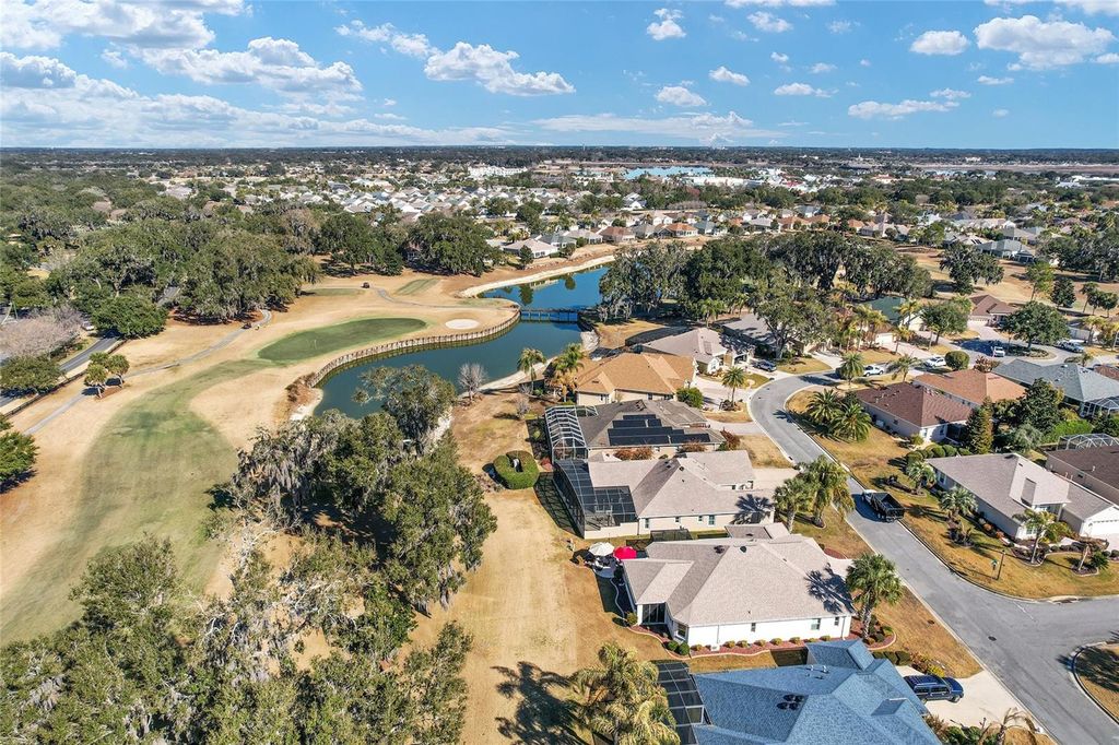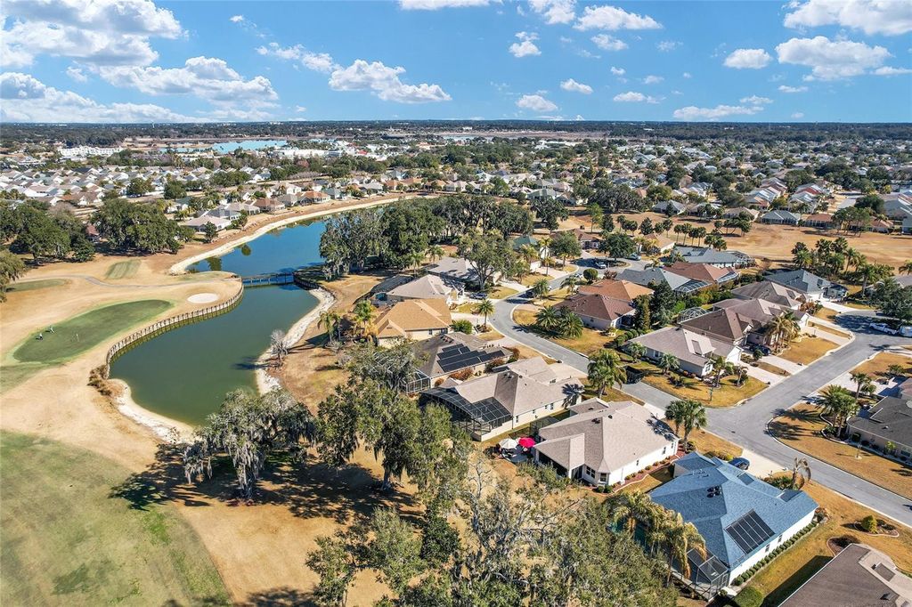 Prime Golf Course Frontage Living in the VILLAGE OF VIRGINIA TRACE! Nestled in the highly desirable Village of Virginia Trace, this exceptional GOLF COURSE FRONTAGE (MALLORY'S CHAMPIONSHIP COURSE (VIRGINIA with no golf cart path in your back yard)) home offers the perfect blend of location, lifestyle, and luxury. Just a short walk, bike ride, or golf cart trip brings you to Lake Sumter Landing, widely regarded as the most popular of The Villages' town squares, where dining, shopping, movies, and nightly live entertainment are always close at hand. Virginia Trace is surrounded by the scenic Mallory Hill Golf Course, creating a peaceful and picturesque setting while still being centrally located. The nearby Canal Street Recreation Center makes hosting visiting family effortless. This is carefree Villages living at its best. Offering OVER 2,500 SQUARE FEET, this 3-bedroom, 2.5-bath designer BRIDGEPORT model is thoughtfully designed and extensively upgraded. The interior features TILE FLOORING throughout the main living areas, LAMINATE FLOORING in the bedrooms, CROWN MOLDING throughout, NO POPCORN CEILINGS, and UV WINDOW TINTING for enhanced comfort and efficiency. PLANTATION SHUTTERS add a refined touch to the kitchen window, office window, and guest bedroom window. The kitchen is truly a standout, featuring CAMBRIA QUARTZ countertops, an upgraded backsplash, kitchen ISLAND, built-in DESK, and exceptional storage with TOP-AND-BOTTOM PULL-OUT SHELVING (even the pantry)"”beautifully designed for both everyday living and entertaining. The primary suite provides a private retreat with a WALK-IN CLOSET and a spa-like ensuite bath highlighted by a ROMAN SHOWER. All three bathrooms have been upgraded with NEW SINKS AND FAUCETS, creating a cohesive and polished look throughout the home. One of the most remarkable features of this property is the 448 sq. ft. GLASSED-IN LANAI, designed with EXPANSIVE PICTURE AQUARIUM-LIKE GLASS that fills the space with natural light and stunning views (exterior remote shade for privacy) "”you truly won't want to leave this room. A dedicated MINI-SPLIT SYSTEM (2022) allows for year-round enjoyment, while STACKING SLIDERS open to an architectural design concrete patio,and a HOT TUB under a BIRDCAGE, ideal for relaxing or entertaining outdoors. Both the main garage and GOLF CART GARAGE feature epoxy coated floors, pull-down ATTIC STAIRS, and ample storage space. The ELECTRIC GARAGE SCREEN is conveniently located on the main garage. Additional thoughtful details include a stunning front door, RETRACTABLE SCREEN at front door, a retractable screen door from the garage to the laundry room, a POCKET DOOR from the kitchen into the laundry room, SOLAR TUBES, and SOLAR ATTIC FAN. Major updates provide peace of mind, including a NEW ROOF (2024), HVAC (2022), LANAI MINI-SPLIT system (2022). Outside, the home is framed by a beautifully manicured lawn, decorative ROCK BEDS, and CONCRETE CURBING that enhance its curb appeal. With its unbeatable proximity to Lake Sumter Landing, golf course setting, and unforgettable AQUARIUM-LIKE GLASS lanai, this home offers a rare opportunity to enjoy the very best of Villages living in one of its most sought-after neighborhoods. GAS IN THE AREA.