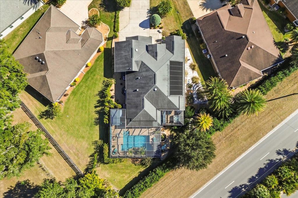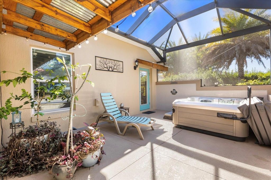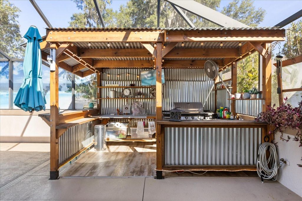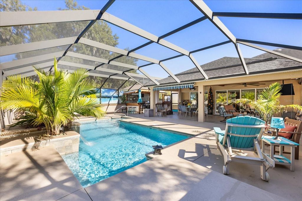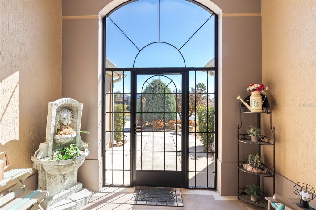 Rare privacy meets "Florida Coastal" luxury in this exquisitely upgraded, stretched Lantana model situated on a sprawling .30-acre homesite in the sought-after Village of Collier. Offering a secluded sanctuary with no rear neighbors and professional privacy screening, this property is a masterclass in indoor-outdoor living. The massive, screened lanai is an entertainer's dream, featuring porcelain tile flooring, retractable solar screens, a designer beach-style bar and barbecue area, and a heated designer pool with a waterfall and app-based controls. Inside, the home has been meticulously updated with high-end designer finishes. The heart of the home is the stunning kitchen remodel completed last year, which features extended cabinetry and granite countertops, freshly painted cabinetry, a custom copper range hood and copper sink, and a wine refrigerator. This space is further elevated by custom-installed recessed lighting, complemented by upgraded designer ceiling fans and lighting fixtures throughout the entire home. Architectural elegance abounds with crown molding, solar tubes, and automated shades in the living area. The primary suite is a true retreat with lanai access, automatic blackout shades, and a private three-person hot tub, while the spa-like bath features a Roman shower, soaking tub, and bidet. Practicality is not overlooked, with a two-car garage, two golf-cart bays, a remote-controlled golf-cart screen, and an expansive attic for storage. Modern essentials include a 2025 HVAC motor, breakage film on all windows, and integrated smart-home systems for climate (Ecobee), irrigation (Hydrawise), and pool operation (OmniLogic). Located just minutes from Brownwood Paddock Square, this home offers the perfect balance of resort-style seclusion and Villages convenience.
