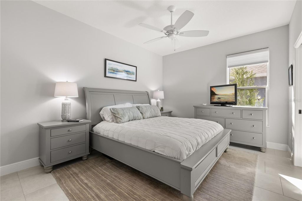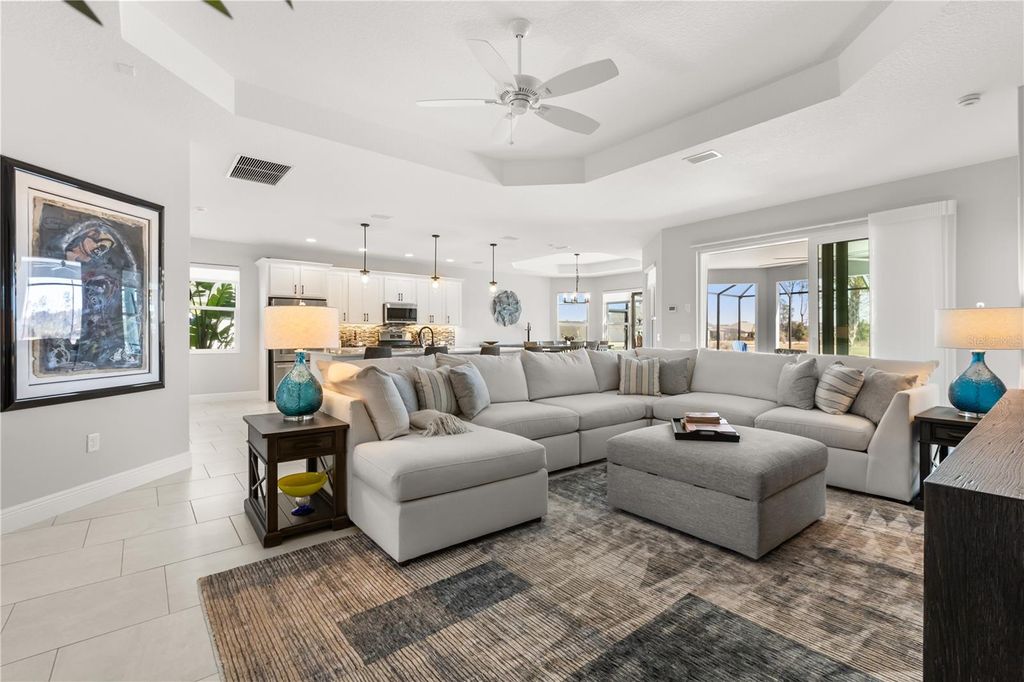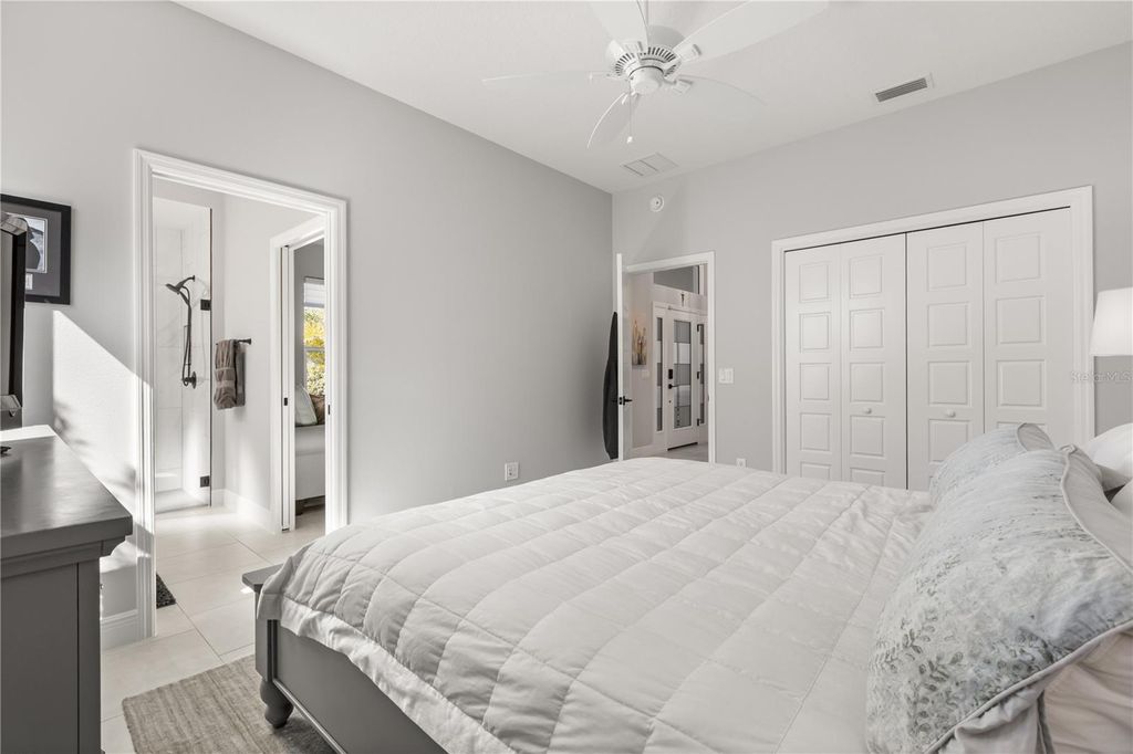 Ideally positioned to capture tranquil double pond views, this expanded Bridgeport model offers refined Florida living in a thoughtfully designed three-bedroom, 2.5-bath layout. Ceramic tile flows throughout the home, enhancing the open and spacious living areas, and the property includes a golf cart with only 150 miles, adding immediate lifestyle value. The kitchen features a large center island with storage on both sides, stainless steel appliances and a gas range, along with a dedicated built-in desk with storage, ideal for organization, a morning coffee station or an elegant beverage bar for entertaining. The owner's retreat includes two walk-in closets and an en suite with double sinks and a Roman-style shower. The front bedroom enjoys peaceful pond views, making it an ideal setting for a home office or guest room with a calming outlook. Outdoor living is the highlight, featuring an expanded lanai with a pool and hot tub overlooking the serene pond with breathtaking views, creating a private resort-style setting. Additional features include a climate-controlled garage, pull-down attic stairs for added storage, a generator, ADT alarm system, Nova water system (just updated) and a laundry room with sink and additional cabinetry. A rare opportunity to enjoy comfort, privacy and elevated lifestyle in The Villages.