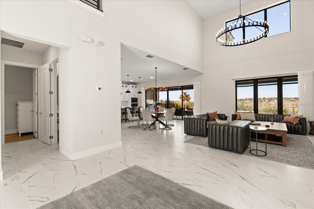 Enjoy sweeping views of the golf course and rolling hills from this custom residence by Davila Homes, ideally located within the guard-gated community of Bella Collina. The home welcomes you with a grand entry, soaring ceilings, and expansive windows that fill the interior with natural light. The open-concept design flows seamlessly through the kitchen, dining area, and great room, where a striking fireplace anchors the living space and creates an inviting environment for both everyday living and entertaining. A private guest bedroom on the main level offers comfort and flexibility, while upstairs the primary suite serves as a true retreat. This space features an oversized custom walk-in closet, spa-inspired bath with dual vanities, and a private balcony showcasing beautiful golf course views. Two additional ensuite bedrooms and a conveniently located laundry room complete the second level. Outdoor living is a highlight of this home. The resort-style pool with sun deck overlooks the golf course, providing a stunning backdrop for relaxation and gatherings. An oversized covered lanai with outdoor kitchen and ample seating areas makes it easy to enjoy Florida living year-round. Residents of Bella Collina enjoy a guard-gated setting and access to world-class amenities including a Nick Faldo-designed championship golf course, tennis and pickleball, spa and fitness center, dining, and a vibrant calendar of social events. Developer will defer $40,000 Sports Membership Deposit at Closing.