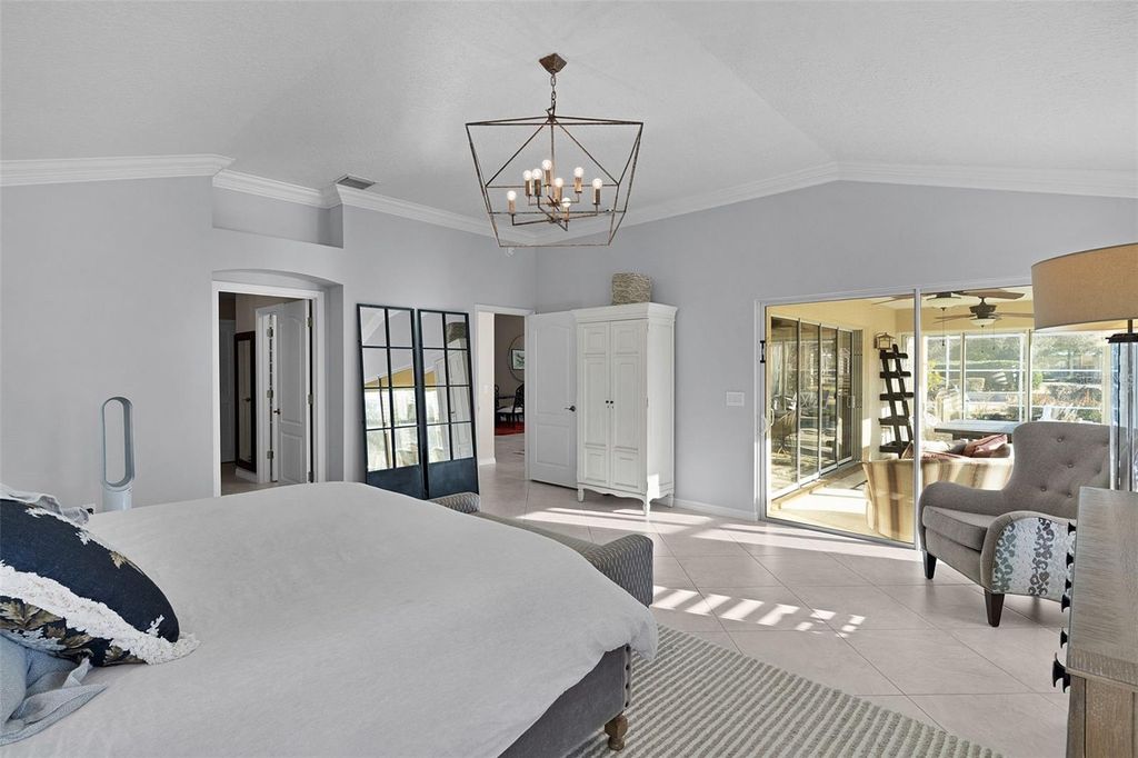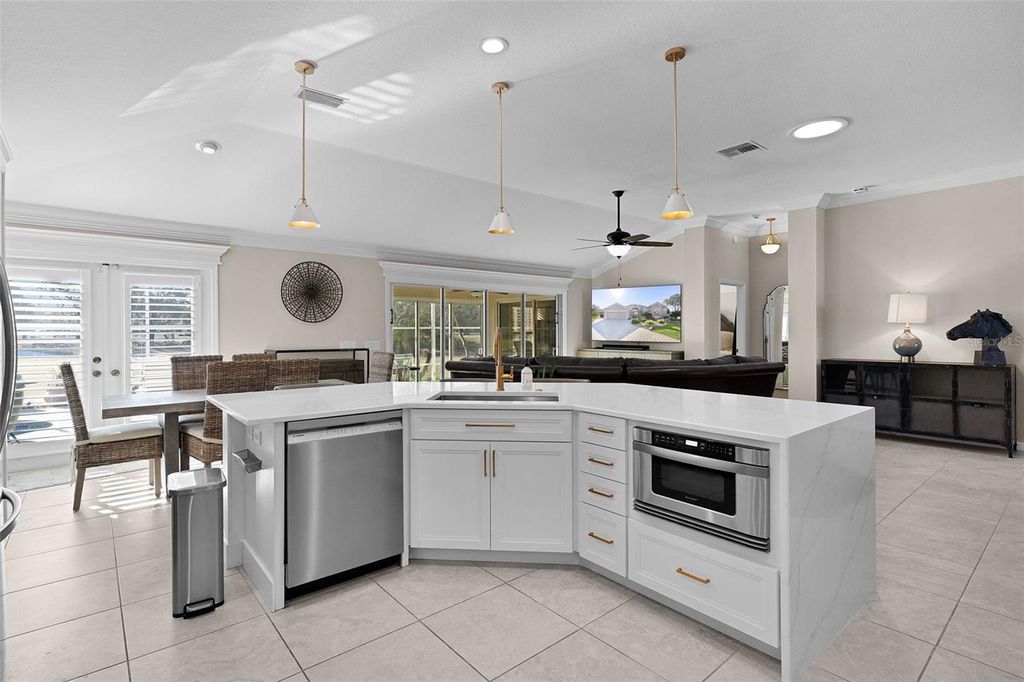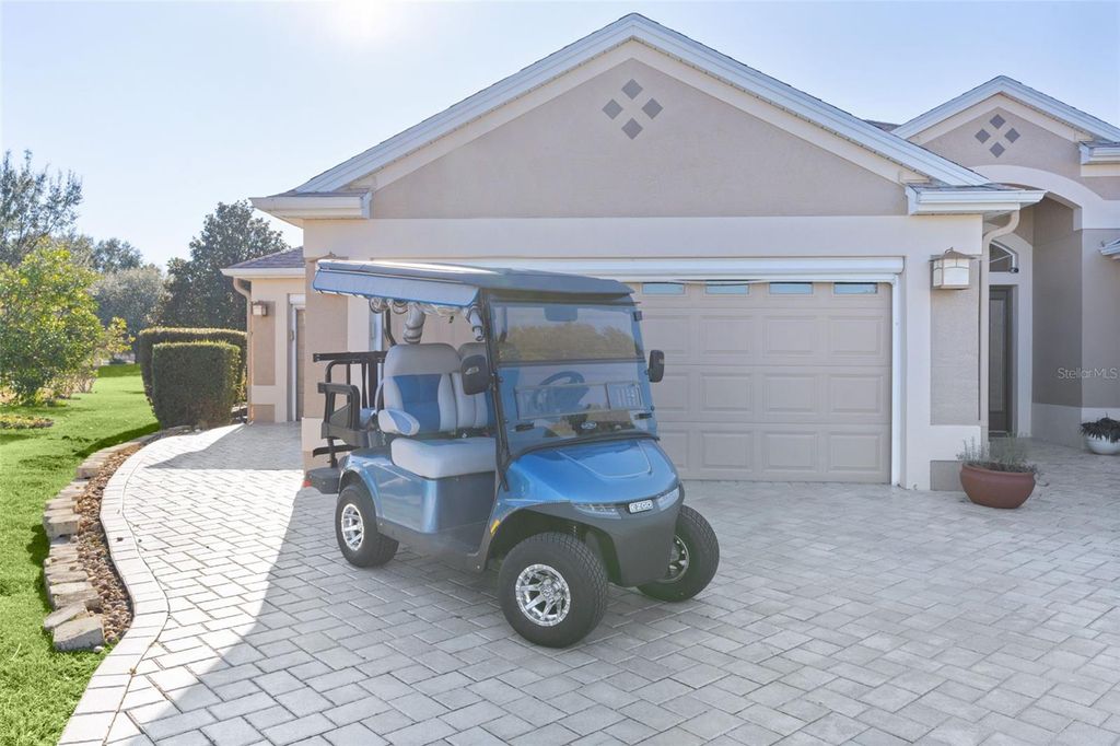 ~WOW, A $75,000 PRICE REDUCTION~ ~NO BOND~ ~POOL HOME~ ~GOLF COURSE VIEW~ ~2017 ROOF~ ~1 YEAR HOME WARRANTY INCLUDED~ ~2018 HOT WATER HEATER~ ~2013 HVAC~ ~CERAMIC TILE THROUGHOUT~ ~GOLF CART GARAGE~ ~ELECTRIC EZ GO GOLF CART INCLUDED~ ~NOVA WATER FILTRATION SYSTEM~ Welcome to this CUSTOMIZED, EXPANDED LANTANA nestled on a quiet CUL-DE-SAC in the Village of POLO RIDGE, offering gorgeous GOLF COURSE VIEWS, mature landscaping, and that coveted Villages lifestyle. From the moment you walk up the BRICK PAVER driveway and enter the home, you'll be greeted by soaring VAULTED CEILINGS, CROWN MOLDING, CORNICES and CERAMIC tile flooring throughout the entire home, creating a bright, cohesive, and elegant feel. The living and dining rooms are flooded with light due to the PLANTATION SHUTTERS, a SOLAR TUBE, plus SLIDERS in the living room that seamlessly connect indoor and outdoor living. The chef's kitchen is a showstopper with QUARTZ countertops and backsplash, under- and over-cabinet lighting, recessed lighting, a 2nd SOLAR TUBE, pendant lighting, an EAT-IN AREA, and FRENCH DOORS leading directly to the pool"”perfect for entertaining. The spacious primary suite offers HIGH VAULTED ceilings, PLANTATION SHUTTERS, 2 CUSTOMIZED OVERSIZED WALK-IN CLOSETS, and a slider to the birdcage and 2nd lanai. The luxurious primary bath features a TILED WALK-IN SHOWER with bench and GLASS DOORS, DOUBLE sinks, separate commode, SOLAR TUBE, GRANITE countertops, and built-in shelving. Guests will love the thoughtful layout, including a 2nd bedroom with PLANTATION SHUTTERS, ceiling fan, and DEEP BUILT-IN CLOSET, a guest bath with tiled tub/shower combo, linen closet, and QUARTZ countertops, and a 3rd bedroom with PLANTATION SHUTTERS, ceiling fan, DEEP BUILT-IN CLOSET, and built-in shelving. A half bath with SOLAR TUBE and QUARTZ countertops adds extra convenience. The 4th bedroom is incredibly versatile, featuring a MURPHY BED, ceiling fan, and recessed lighting ideal as a den, office, or guest space. The INDOOR LAUNDRY ROOM includes a laundry tub and LG stacked washer and dryer. Step outside to multiple outdoor living areas: a CERAMIC tiled lanai with 2 ceiling fans, TELESCOPING SLIDERS, and the 84'7"x40'5" BIRDCAGE, plus a secondary GLASS-ENCLOSED LANAI with ceramic tile, sliders, and 2 ceiling fans. The outdoor oasis continues with a HEATED, SALTWATER POOL with a NEW PUMP, FRESH PAINT, CHATTAHOOCHEE RIVER ROCK FLOORING, an UPGRADED SPRINKLER SYSTEM, and a FULLY EQUIPPED OUTDOOR KITCHEN featuring tile countertops and backsplash, block construction, sink, hood, and a mini fridge"”all overlooking the 9th HOLE OF THE HAWKS BAY GOLF COURSE. This beautifully maintained home features a 2-CAR GARAGE plus a GOLF CART GARAGE with a separate entrance (both with ELECTRIC SCREENS). This location is just a short walk to the Polo Fields and a short ride golf cart ride to Spanish Springs or Lake Sumter Landing. Also, you will be right across the street from the Saddlebrook Rec Center and Softball Complex and right down the street from the Glenview Country Club. Shopping, dining and medical are all right at your fingertips with the Southern Trace Shopping Center right down CR 466! The perfect house in the perfect location!
