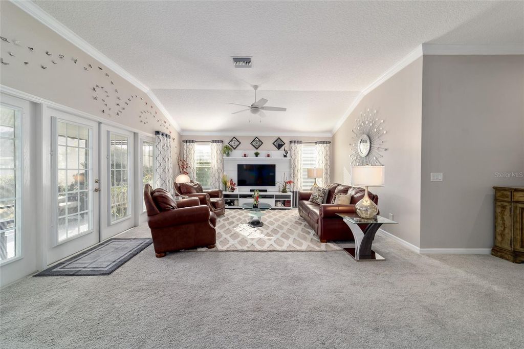 Welcome to 1194 McDonough Place "” a beautifully maintained 4-bedroom, 2-bath Putnam model offering approximately 2,028 square feet of thoughtfully designed living space in the heart of The Villages. With flexible living areas, a private screened lanai framed by privacy hedges, and a rare 2-car plus golf cart garage, this home delivers the perfect blend of modern comfort and relaxed Florida living. Step inside to a light-filled living room with soft neutral tones and an effortless open flow. Large windows and sliding patio doors invite in natural light, creating a warm and welcoming space ideal for both quiet evenings and lively gatherings. The adjoining dining area is perfectly positioned for everyday meals or special occasions, accented by a decorative chandelier that adds just the right touch of style. The kitchen is truly the heart of the home. Rich espresso cabinetry pairs beautifully with light countertops and stainless-steel appliances, including a French-door refrigerator, dishwasher, and smooth-top electric range. An oversized peninsula with bar seating offers the perfect spot for morning coffee or casual entertaining. Recessed lighting, above-cabinet accents, and thoughtful design details give the space a polished yet inviting feel, all seamlessly connected to the main living areas. The spacious primary suite easily accommodates a king-size bed and features a generous walk-in closet. The en-suite bath is designed for comfort and function with dual vanities, espresso cabinetry, porcelain tile flooring, a private water closet, and a beautifully tiled Roman-style walk-in shower. A desirable split-bedroom layout places the primary suite on its own private side of the home. Guests enjoy a separate wing with a comfortable bedroom, spacious closet, and full bath featuring a neutral tiled tub surround. In addition to the primary and guest rooms, the home includes a dedicated craft room"”ideal for hobbies or creative projects"”and a versatile den/flex space perfect for a home office, reading room, or cozy media retreat. Together, these spaces provide true four-bedroom flexibility to fit your needs. Step outside to your private screened lanai "” a peaceful retreat surrounded by mature privacy hedges. Whether sipping your morning coffee or relaxing in the evening breeze, this outdoor living space offers year-round enjoyment and exceptional seclusion. A charming covered front porch adds curb appeal and another inviting place to unwind and enjoy the neighborhood. One of the standout features is the highly desirable 2-car plus golf cart garage offering 739 sq ft of versatile space. With ample room for vehicles, a dedicated golf cart bay, and additional storage for tools or hobbies, it's perfectly suited for the active lifestyle The Villages is known for. Built in 2017, this move-in ready home offers contemporary finishes, abundant natural light, and access to world-class amenities "” including golf, recreation centers, dining, shopping, and a vibrant social scene "” all just moments away. This is Florida living at its best.