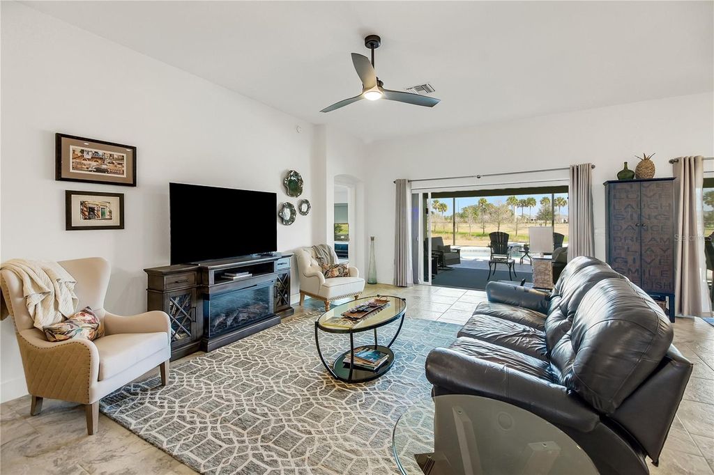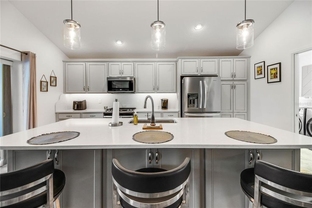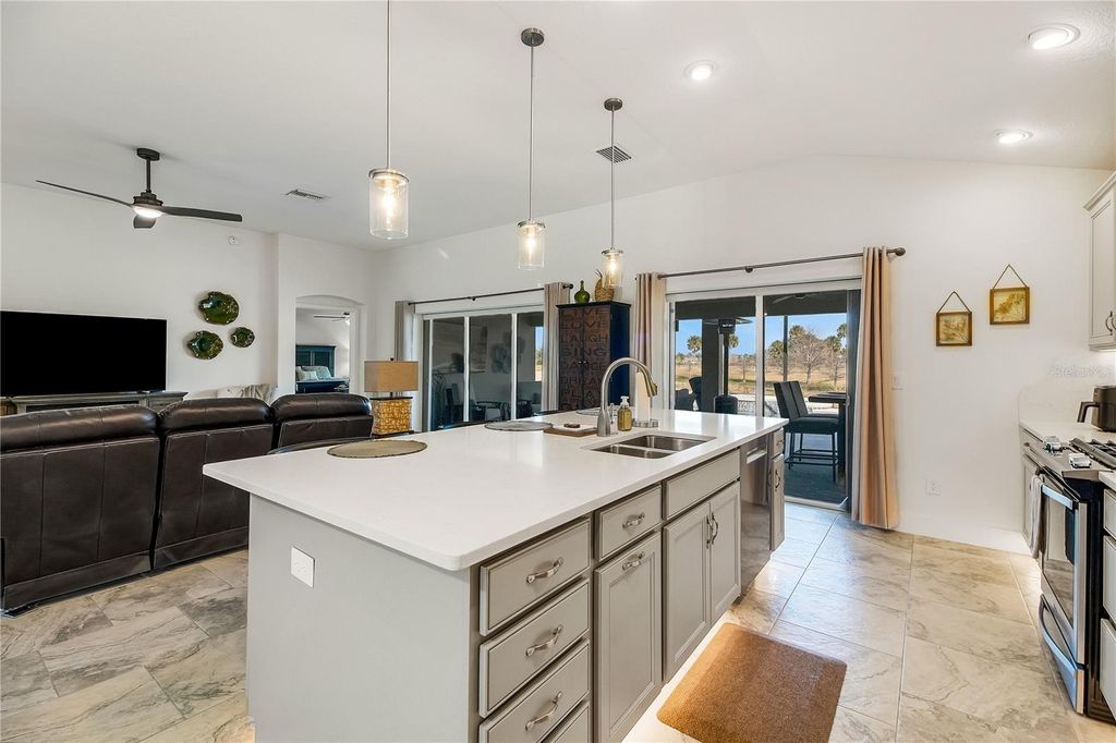 Rare find - Stretched Indigo Designer model with pool and water view home! Welcome to this gorgeous 3 bedroom 3 bathroom 2 car + golf cart garage POOL home in The Village of McClure. Step inside and see sleek tile flooring, tall ceilings, and a bright and open floor plan - no carpet! The chef's kitchen offers quartz countertops with matching backsplash, stainless steel appliances, gas range, island with breakfast bar and beautiful cabinets. The spacious primary bedroom has luxury vinyl flooring, tray ceiling, large walk-in closet and professionally installed black-out shades with remote. The ensuite offers dual sinks, a large walk-in Roman shower, toilet closet, and framed mirrors. Each guest bedroom has its own private bathroom. The beautiful lanai is a great place to relax and enjoy Florida living by the sparkling, solar heated pool with water feature. The Village of McClure itself is in the heart of some of The Villages newest recreational fun such as putt & plays, pitch & putts, executive & championship GOLF courses, many neighborhood & Village rec centers (tennis, dog parks, archery range, billiards, etc.), as well as dining & live, nightly music options (Sawgrass Grove, Edna's on the Green, Fenney Grill, BROWNWOOD town square & more).