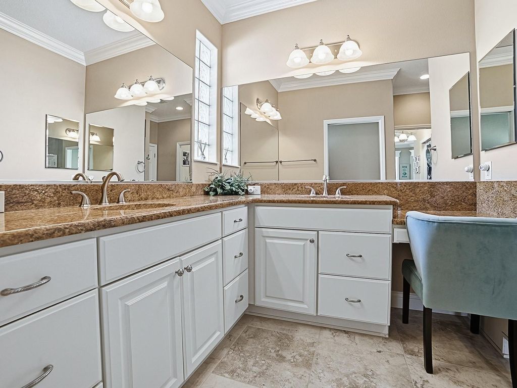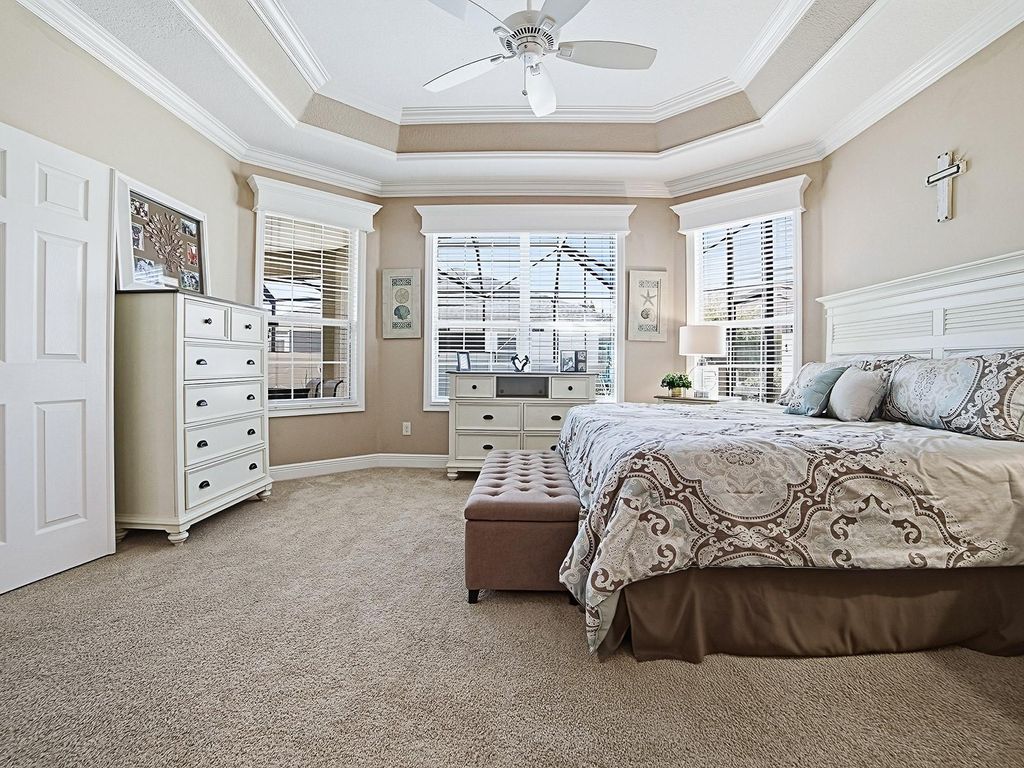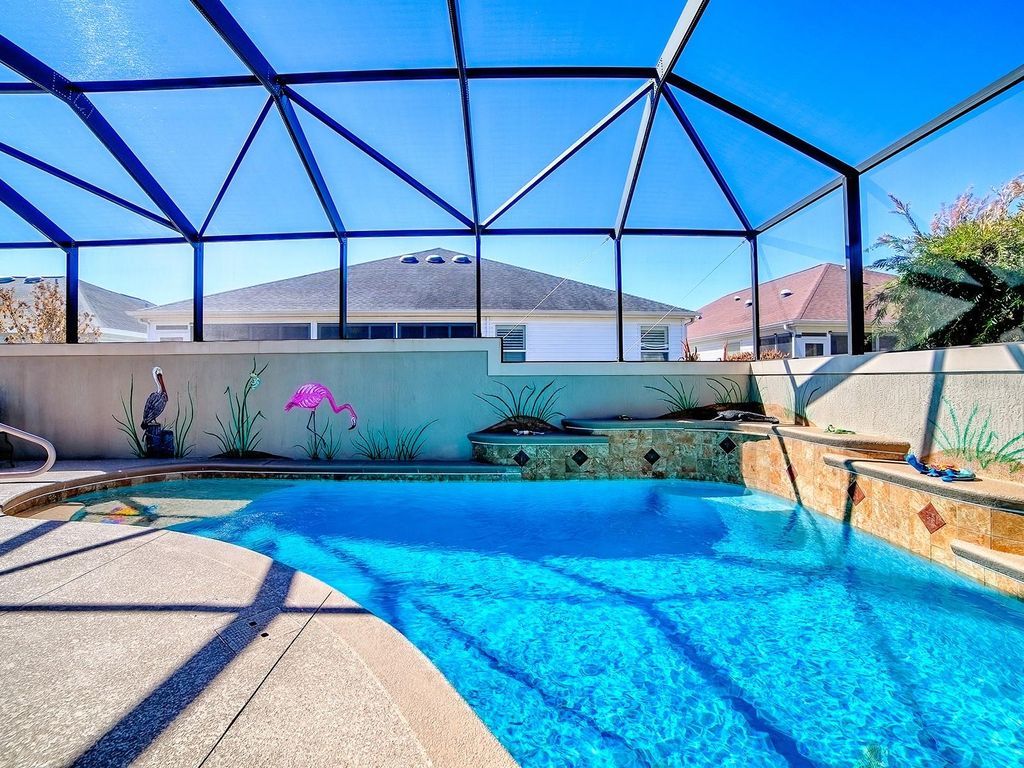 FABULOUS POOL HOME - STRETCHED 3 Bdrm/2.5 Bath BRIDGEPORT with EXPANDED (34 X 47) COVERED LANAI & POOL AREA! Comfort, Style and Location all come together effortlessly in this Designer Home located on a cul-de-sac lot in The Village of Dunedin! GREAT CURB APPEAL - CUSTOM LANDSCAPING, PAVER WALK & DRIVEWAY! A Covered Vestibule & Upgraded Entry Door with Leaded-Glass Sidelites and Transom Window welcome you in to the Spacious Foyer. This 2,351 Sq ft home offers many upgrades and high-end finishes: Acacia Engineered Hardwood Flooring in Living & Dining Rooms, CROWN MOLDING throughout, Custom Window Cornices, Added Recessed Lighting, Central Vac System, Stereo System with Built-in Speakers in Living Room & Lanai, Gutters, Energy Barrier and Solar Fans, etc.. The Large Kitchen is a Dream featuring White Stacked Cabinets w/ Pullouts, Granite Countertops & Complementary Tile Backsplash, Stainless Appliances, Built-in Pantry, a Center Island and Breakfast Bar, Desk area, and an adjacent Dining Area with a bayed wall of windows making this space Light & Bright. The Living Room features a Tray Ceiling with accent lighting and added recessed lighting, Acacia Engineered Hardwood Floors which seamlessly flow into the Dining area. From the Living Room, through sliding glass doors, you will find a SPECTACULAR Covered Lanai with Remote Motorized Screened Walls, Built-in Stereo Speakers, Mounted TV, all overlooking the Patio and HEATED SALT WATER POOL with SUN-DECK POOL ENTRY / LOUNGING LEDGE, Water Fall & Fountain Features. The Birdcage has liquid lights on all cross beams and there is an outdoor shower for added convenience. The Spacious Primary Suite offers cozy warm carpeting, a Tray Ceiling, his-and her Walk-in Closets, Dual Sinks, and a ROMAN walk-in Tiled Shower. Two additional bedrooms both with built-in closets and cozy carpet are conveniently located near the front of the home ensuring plenty of PRIVACY for guests. Between the bedrooms there is a Jack-and-Jill Bath with a good-sized vanity and Tiled Tub/Shower. There is an additional guest 'half' bath located between the foyer and living room. An interior Laundry Room with Tile Floors, Sink and Cabinets sits between the Kitchen and Garage. The Garage is 425 Sq Ft with an Extra High overhead entry accommodating larger SUV parking. THIS HOME IS A TRUE GEM! The Village of Dunedin is nestled between the fun and friendliness found just east of Brownwood Paddock Square. Whether it's golf, recreation, shopping or dining that you desire, it's all available! You'll enjoy quick access to either Buena Vista or Morse Boulevard too, for those days that your adventures take you beyond all the amenities you already enjoy!
