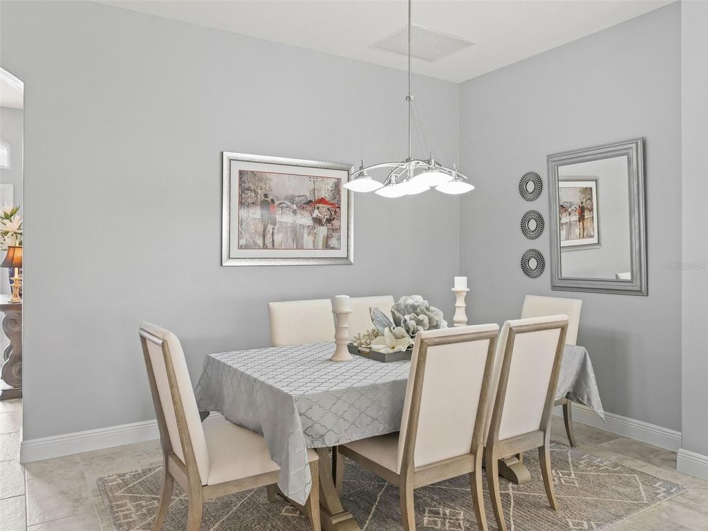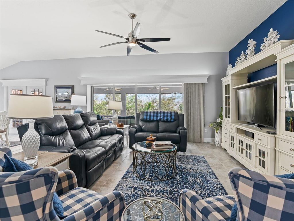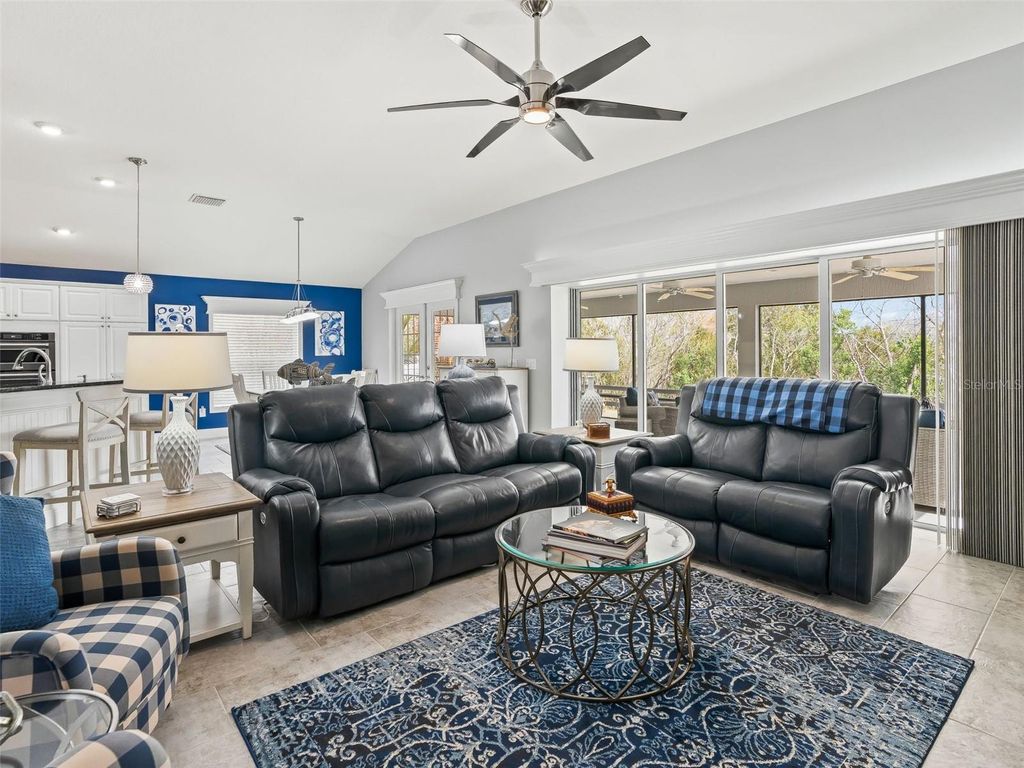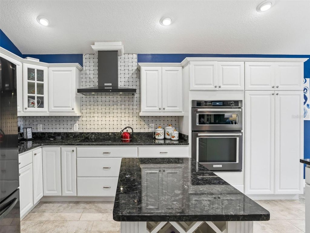 LUXURY HOME WITH VIEW OF PRESERVE! Experience refined Florida living in this beautifully appointed Laurel Oak 5 model offering 2,300+- sq ft of living space and 3,666 sq ft under roof, perfectly positioned with a tranquil view in the highly desirable Village of Osceola Hills. From the moment you arrive, the curb appeal shines with stone accents, upgraded tropical landscaping beds, a painted driveway and walkway, and a leaded glass entry with sliding screen complemented by a Ring doorbell camera. The spacious 2-car plus golf cart garage adds both convenience and functionality. Inside, the home showcases high ceilings throughout, gorgeous elongated ceramic tile and carpet flooring, plantation shutters, granite countertops, and elegant wood cornices in the great room. The open layout offers a spacious great room and dining room combination, ideal for entertaining and everyday living. The kitchen is designed for both style and practicality, featuring a center island with dedicated wine storage, separate eating area, a large breakfast bar with gorgeous pendant lighting and custom paneling, beautiful granite counter tops, stone backsplash, a solar tube for natural light, a double pantry, and an appliance package including a wall oven and customized range hood. The primary suite is a true retreat with high ceilings and a spa-like en suite featuring tower cabinetry, dual square sinks, walk-in shower with double showerheads, and a generous walk-in closet. Guests will appreciate the private guest wing with two bedrooms"”one featuring a tray ceiling and bay window"”and a second full bathroom. Enjoy Florida's indoor-outdoor lifestyle through quadruple sliding glass doors plus a set of French doors leading to the screened lanai overlooking the peaceful Preserve"”the perfect setting for relaxing or entertaining. Additional highlights include an indoor laundry room with built-in desk, extra cabinetry, and utility sink. Ideally located in one of The Villages' most sought-after areas, this exceptional home combines luxury, comfort, and a prime location.