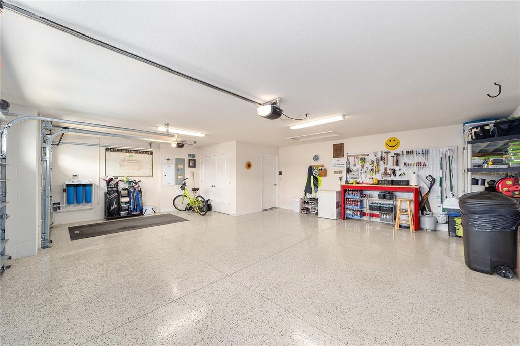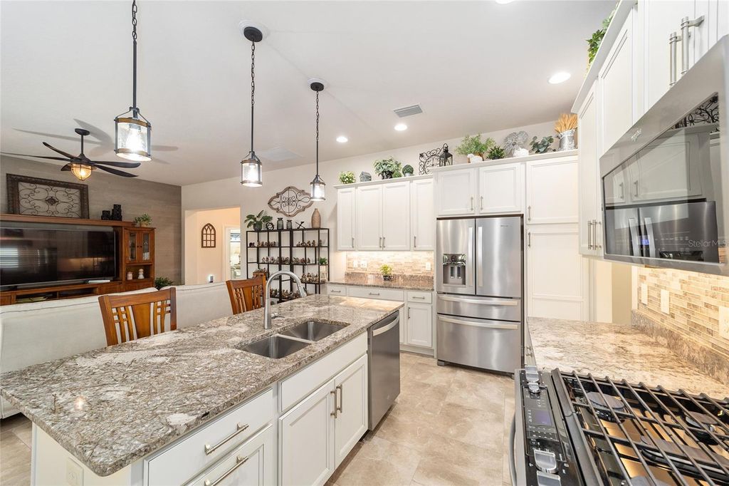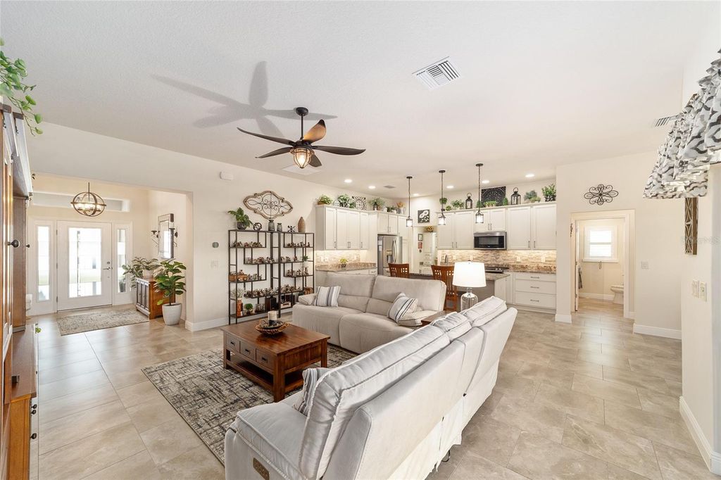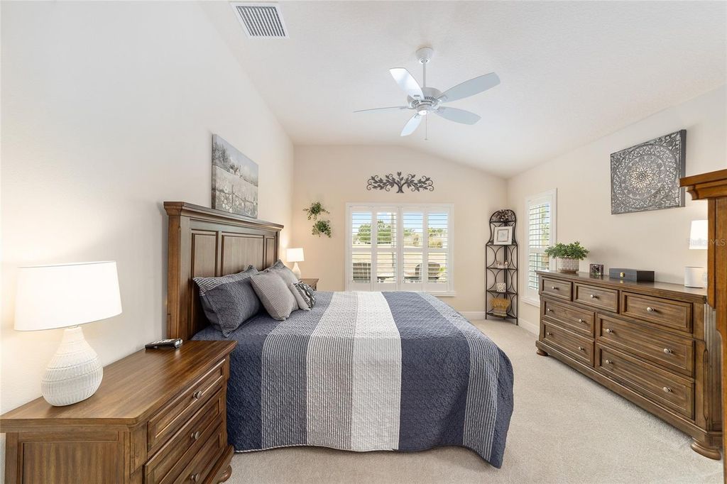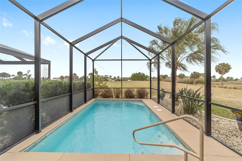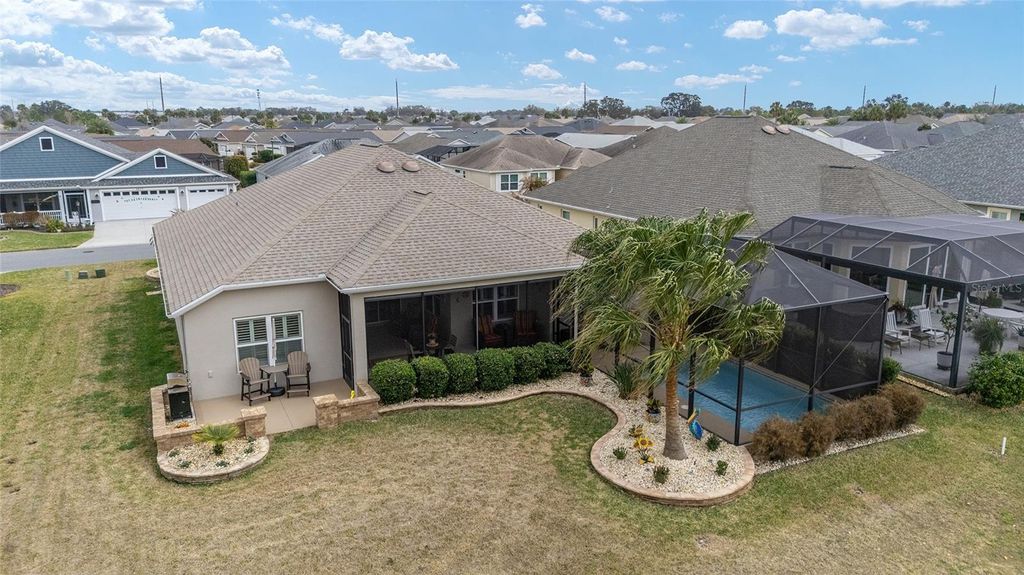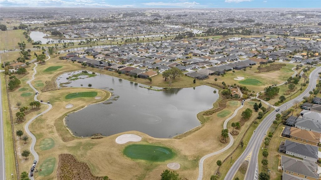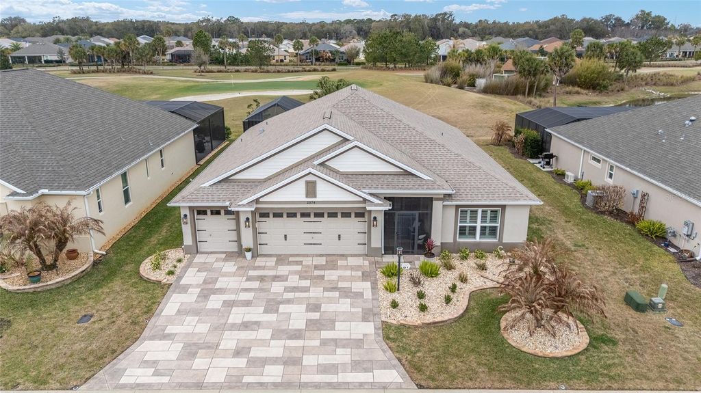 ~2019 ROOF/HVAC/HOT WATER HEATER~ ~HEATED SALTWATER POOL~ ~GOLF COURSE / WATER VIEW~ ~GOLF CART GARAGE~ Welcome to this exceptional LINDEN model in the desirable Village of MCCLURE, perfectly positioned on the 3rd green of the Loblolly Golf Course with stunning GOLF COURSE and WATER VIEWS. Surrounded by beautiful, mature landscaping and enhanced by a STAMPED CONCRETE DRIVEWAY, this home offers outstanding curb appeal and an unbeatable setting. Walk through the FRONT SCREENED-IN PORCH through a beautiful LEADED GLASS DOOR and step inside to a grand entry with HIGH VAULTED ceilings, CERAMIC tile flooring, and UPGRADED LIGHTING. The living room continues the open feel with CERAMIC tiles and an UPGRADED CEILING FAN, while the dining room features CERAMIC tiles, PLANTATION SHUTTERS and soaring 10' ceilings"”perfect for entertaining. The kitchen is beautifully appointed with GRANITE countertops, STAINLESS-STEEL appliances, TILE BACKSPLASH, CERAMIC tile flooring, a CLOSET PANTRY, and a center ISLAND designed for both functionality and style. The INSIDE LAUNDRY ROOM includes CERAMIC tile flooring, a utility sink, cabinetry, shelving, Whirlpool appliances, and a convenient BUILT-IN OFFICE AREA. The primary suite is a true retreat with plush carpeting, PLANTATION SHUTTERS, HIGH VAULTED ceilings, ceiling fan, and a CUSTOM OVERSIZED WALK-IN CLOSET. The luxurious ensuite bath offers a TILED ROMAN SHOWER, dual sinks, HIGH GRANITE countertops, a private commode area, and abundant cabinetry. 2 guest bedrooms provide comfortable accommodation, each featuring carpet, PLANTATION SHUTTERS, ceiling fans, and built-in closets. One guest room boasts a HIGH TRAY CEILING, adding architectural interest. The guest baths include CERAMIC tile, one with a tiled walk-in shower and HIGH GRANITE countertops, and the other with a tiled tub/shower combination, linen closet, and HIGH GRANITE countertops. Outdoor living shines with an L-SHAPED, SCREENED-IN LANAI featuring textured concrete flooring with blinds, 3 ceiling fans, and an outdoor grilling area surrounded with a lovely BRICK WALL. The lanai opens to a screened BIRDCAGE ENCLOSURE where you can enjoy the HEATED, SALTWATER POOL while taking in the breathtaking GOLF COURSE and WATER VIEWS. Additional exterior upgrades include new SOLAR LIGHTING for enhanced ambiance. The spacious 2-car plus GOLF CART GARAGE features EPOXY FLOORING, a workbench, and attic stairs for added storage. There is a SECO SURGE PROTECTOR on the meter, termite & pest protection for peace of mind. Furniture and artwork can be available separately. This remarkable home combines luxury, functionality, and spectacular views in one of The Villages' premier locations. Minutes from Magnolia Plaza with shopping and dining. Close to the Willow Tree Rec Center and the Everglades Rec Center. This home is centered between Fenney, Sawgrass, Eastport and Brownwood, making everything a golf cart ride away!