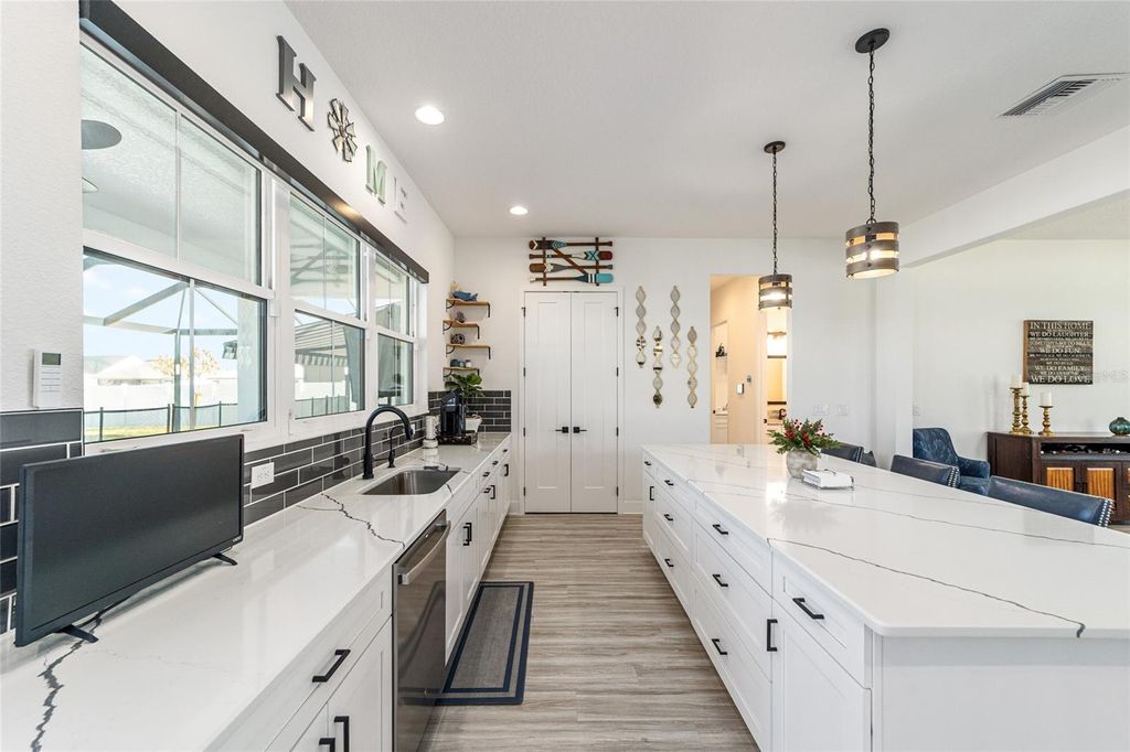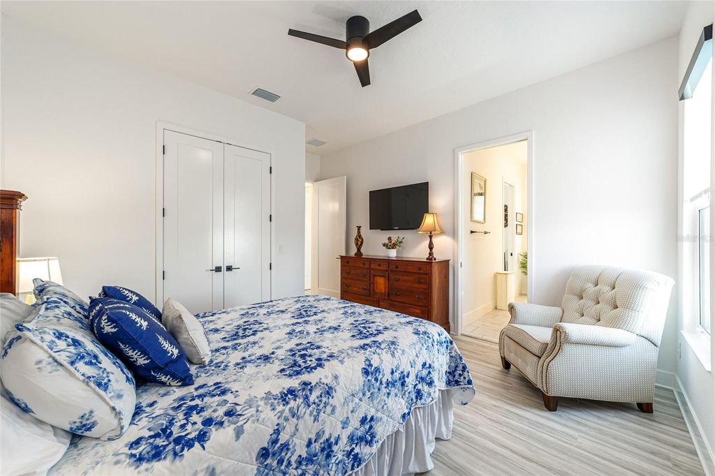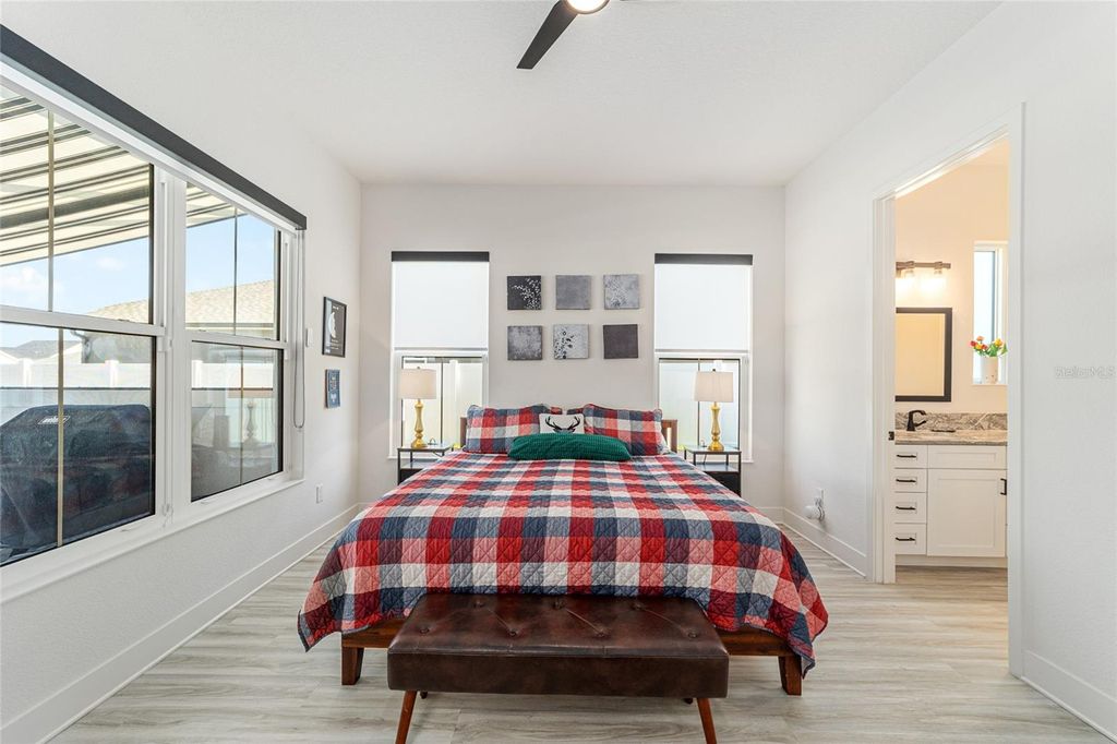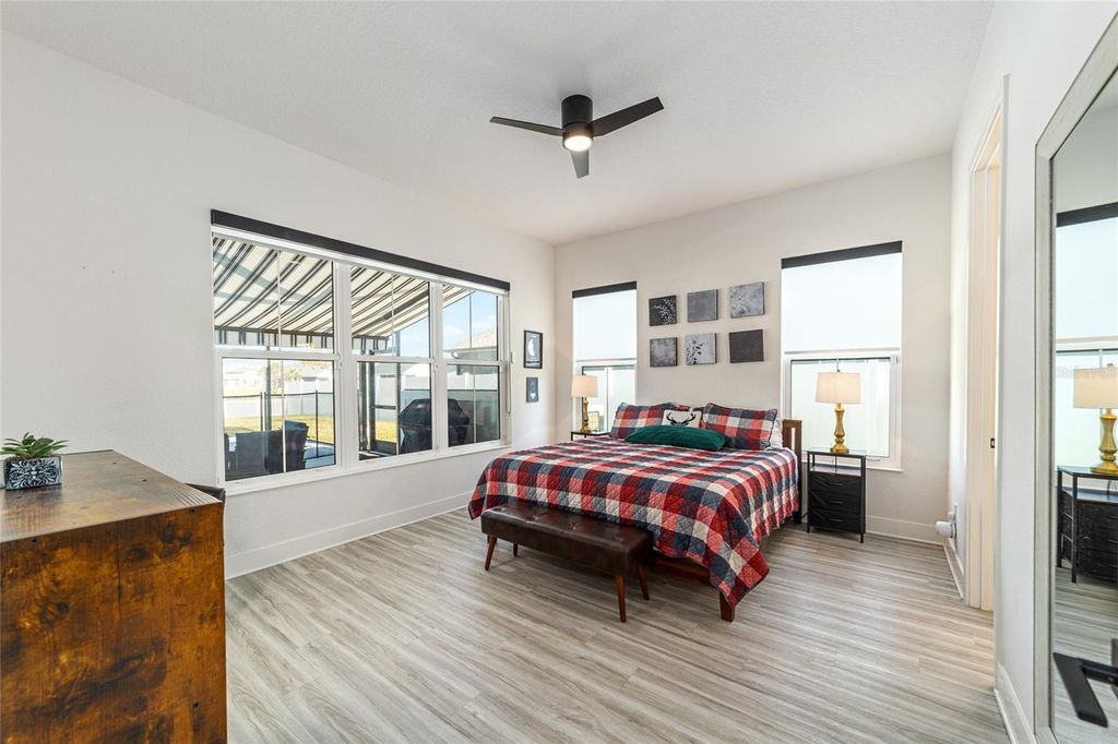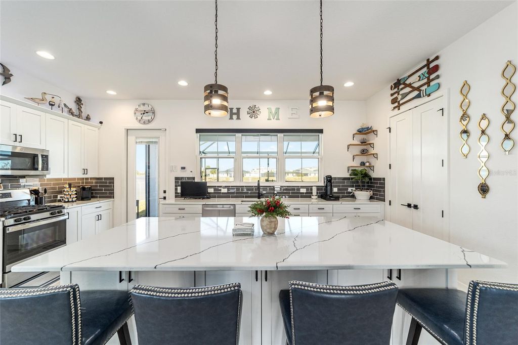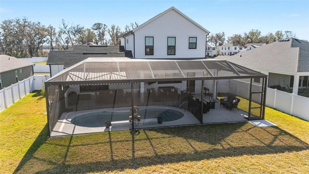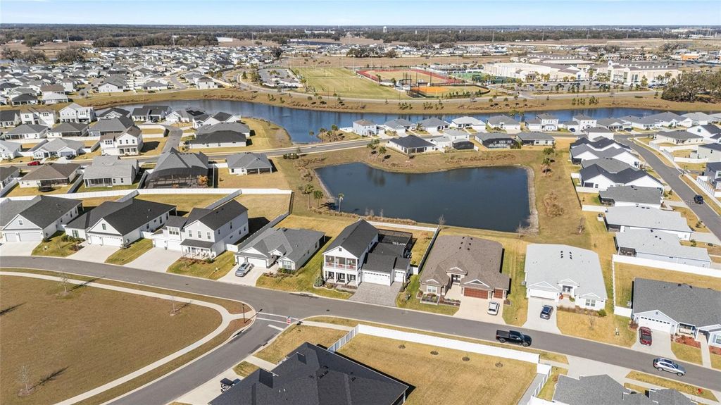 ~$11,500 PRICE REDUCTION~ ~WATER VIEW~ ~HEATED SALTWATER POOL~ ~GOLF CART GARAGE~ ~10' CEILINGS~ ~GOLF CART/CAR OPTION~ ~2023 ROOF/HVAC/HOT WATER HEATER~ Welcome to this stunning DOUBLE PLAY model in the Village of MIDDLETON in The Villages--Exceptional 2-story POOL home offering WATER VIEWS, upscale finishes, impressive upgrades throughout. Situated on beautifully landscaped grounds with BRICK PAVER DRIVEWAY and WALKWAYS, this home delivers outstanding curb appeal and resort-style living. 10' ceilings throughout the home enhance an open airy feel while LUXURY PLANK FLOORING spans the entire living space except for upstairs baths. The living room showcases UPGRADED LIGHTING, ceiling fan, custom 3-way ELECTRIC FIRELPLACE with striking TV entertainment wall featuring decorative backsplash and recessed lighting. The dining room also features upgraded lighting, creating an elegant space for gatherings. The gourmet kitchen is beautifully appointed with UPGRADED CABINETRY, QUARTZ countertops, STAINLESS-STEEL appliances, TILE BACKSPLASH, and a large CENTER ISLAND"”perfect for cooking and entertaining. Conveniently located on the main floor, the primary suite offers high ceilings, ceiling fan, FITTED WINDOW SHADES, CUSTOM CLOSET SHELVING in a walk-in closet. The luxurious ensuite bath features LVP, a TILED WALK-IN SHOWER, private commode area, UPGRADED CABINETRY, and QUARTZ countertops. Upstairs are 4 bedrooms, each pair connected by a JACK & JILL BATH providing flexibility for family and visitors. Every bedroom includes high ceilings, a ceiling fan, LVP flooring and built-in closet. Baths sport ceramic tile floors, QUARTZ countertops, UPGRADED CABINETRY. One bath offers a tile tub/shower combo while the other has a tiled walk-in shower. The front bedroom, currently used as an office, opens to a screened balcony and houses a MURPHY BED. Additional interior highlights include a main-floor HALF BATH with upgraded finishes, an INSIDE LAUNDRY ROOM with CLEANSTART Rainsoft no-detergent laundry system plus luxury utility sink, custom frosted glass FRENCH DOORS, motion-sensor stairway lighting with carpet runner, ELECTRIC WINDOW SHADE controls, RETRACTABLE BALCONY SCREEN, air purification systems, Air Masters in both AC units, and an Eaton whole-house SURGE PROTECTOR. Outdoor living is equally impressive with a SCREENED BIRDCAGE / LANAI featuring an LED-equipped AWNING over a portion of the space and a sparkling 15-x 30 HEATED SALTWATER POOL with safety gate. The yard is enhanced by custom landscaping, whole-house GUTTERS, irrigation flow filter, RainSoft water softening system, reverse osmosis water system, and mango and lime fruit trees. Spacious 2-car garage plus GOLF CART GARAGE features an insulated door, attic stairs, and 2 SOLAR ATTIC FANS for added efficiency. From second floor find another access to attic space. Unique programmable JELLYFISH lighting surrounds house. Paid off ADT security system with cameras included. This extraordinary home combines space, luxury, and thoughtful upgrades in one of The Villages newest FAMILY communities. At full price, buyer will also receive 2025 Denago Rover XL electric 4-forward seat golf cart with 600 miles. Don't miss the opportunity to experience exceptional Florida living at its finest! You're near THE VILLAGES CHARTER SCHOOLS, Shallow Creek and Woodlands Championship Golf Courses, Eastport live entertainment, shopping, restaurants, very convenient!