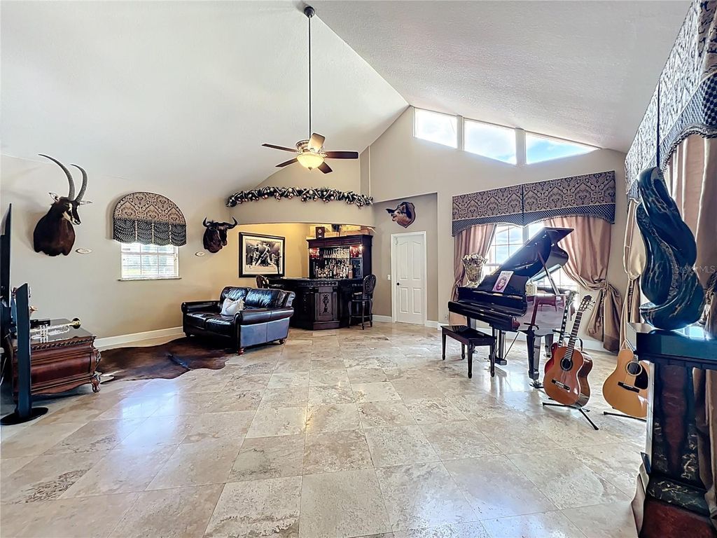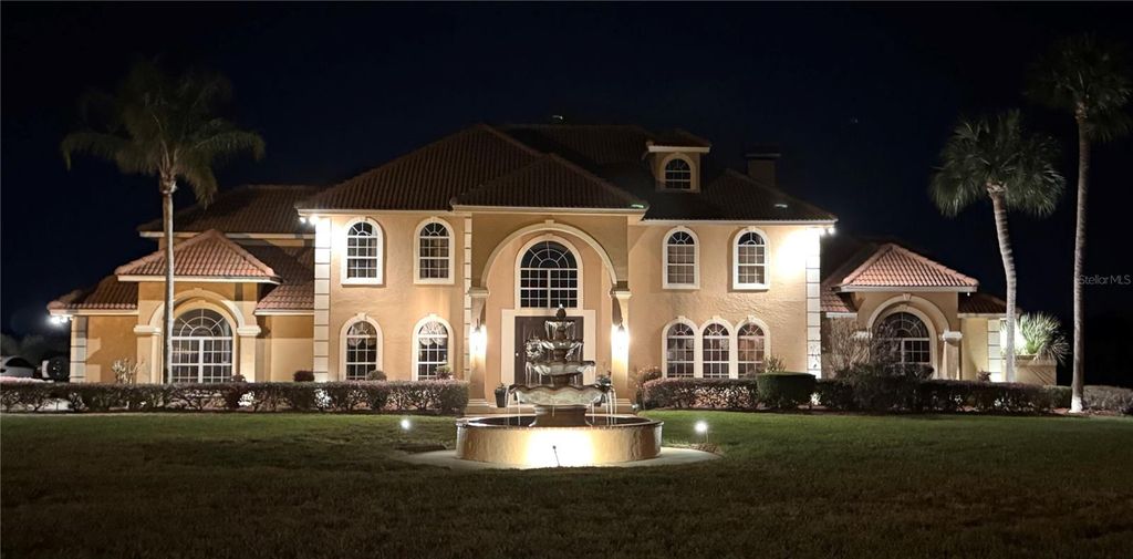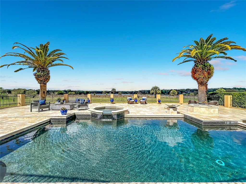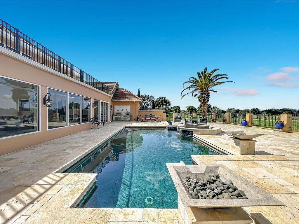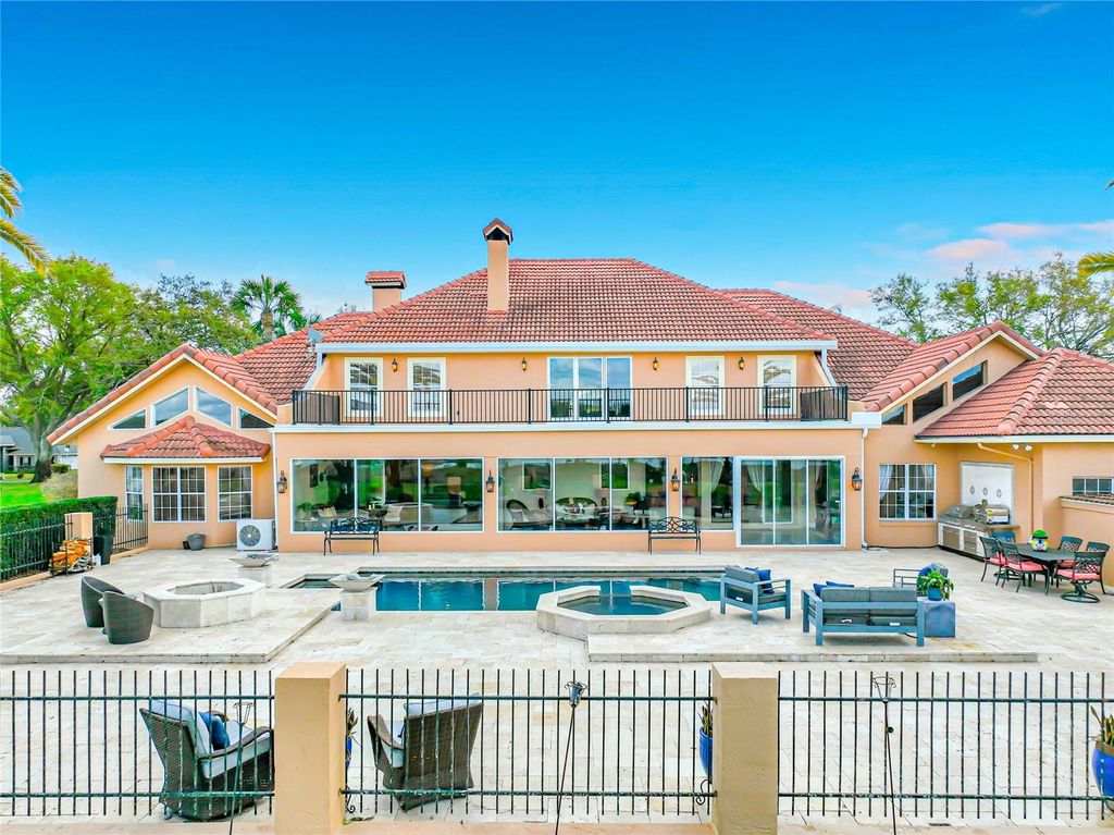 Experience Spanish-style architecture in this commanding Crooked Lake estate offering over 6,600 square feet of living space, this custom-built home is gracefully positioned on more than one acre with breathtaking panoramic lake views. Designed with exceptional craftsmanship and intricate details throughout, this private retreat offers the charm of small-town living while remaining just minutes from boutique shopping, dining, and major roadways. A dramatic entryway welcomes you with soaring vaulted ceilings and a custom wrought-iron staircase, creating an unforgettable first impression. At the heart of the home, the stunning custom marble kitchen features a large state-of-the-art island with double breakfast bar seating, high-end appliances, a wine cooler, and a spacious walk-in pantry"”perfectly designed for both everyday living and grand entertaining. The kitchen flows seamlessly into the family room, where a cast stone wood-burning fireplace creates a warm focal point while sliding glass doors open to views of the expansive Florida room. Blending indoor and outdoor living, the air-conditioned Florida room features wall-to-wall windows that fill the space with natural light while overlooking the luxurious pool area. Designed for elevated entertaining, the outdoor space offers a resort-style experience with an oversized pool, summer kitchen, fire pit, and beautiful travertine surroundings, all set against peaceful lake views. The grand room with expansive vaulted ceilings provides additional space for leisure and entertainment, featuring a wet bar with a second wine cooler and abundant natural light. Located in the east wing of the home, the spacious owner's suite showcases cathedral ceilings, generous proportions, a beautifully remodeled private bathroom, and large his-and-hers walk-in closets. Upstairs, you'll find five additional bedrooms, two newly remodeled full bathrooms, and a spacious library area. Oversized trifold doors open to a spectacular 900-square-foot balcony overlooking the lush pool area and expansive backyard, offering stunning views and additional space to relax. This remarkable residence is located in an exclusive 25-home community featuring a private boat dock and boat ramp"”providing lake access in one of the area's most conveniently located neighborhoods.