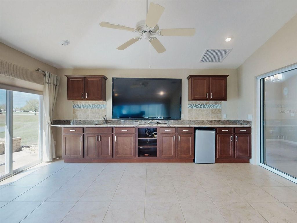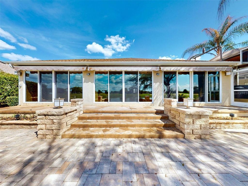 WATER & CHAMPIONSHIP GOLF COURSE VIEWS! EXPANDED LANTANA DESIGNER HOME located on the Jacaranda Championship Golf Course in the Village of St. Charles. 4 bedroom, 2 bath, 2 Car + Golf Cart Garage, Huge Glass Enclosed Lanai, Side Birdcage with Hot Tub, Large Tiered Stamped Concrete & Paver Back Patio, all create wonderful resort-style living in The Villages, Florida. The stamped concrete driveway & entry, hardscapes, along with the outdoor water feature create a very welcoming first impression. Inside, you will find an OPEN, LIGHT & BRIGHT Floorplan with Volume Ceilings & Plantation Shutters. The Kitchen features handsome & rich cabinetry, granite countertops, backsplash, stainless steel appliances, breakfast bar & breakfast nook, and an adjacent BUTLERS PANTRY with a sink and a surplus of storage. The split bedroom design ensures privacy for your guests. The Primary Suite offers a door leading out to the Bird Cage/Hot Tub, walk-in closet and an ensuite bath with dual vanities, a Walk-in Tiled Shower, and a separate water closet. . The Guest Bedrooms are in the front of the home and the guest bath provides a tiled tub/shower combination. The fourth bedroom is located at the back of the home, has built-ins making for a perfect office and offers a view! Indoor/Outdoor living and entertaining + the Views take Center Stage in this Lovely Home! Additional highlights for peace of mind: NEW ROOF (2025), HVAC (2020). Perfectly located within The Villages, this home is approximately 1 mile to SeaBreeze Sports Pool & Recreation Center and a short golf cart ride to dining, shopping, golf clubhouses, and community amenities. This Water & Championship Golf View Residence in the Village of St. Charles combines comfort and function with breathtaking sunset views and resort-style outdoor living just waiting for a new owner. Nearby Amenities: "¢ Cane Garden Championship Golf Club - Golf Front, Jacaranda Course "¢ Seabreeze Sports Pool & Recreation Center - Approx. 1.0 mile "¢ Cane Garden Country Club Restaurant - Approx. 1.3 miles "¢ Lake Sumter Landing Town Square - Approx. 3.5 miles "¢ Colony Plaza Shopping Center - Approx. 2.5 miles "¢ Buena Vista Blvd access - Approx. 0.6 miles