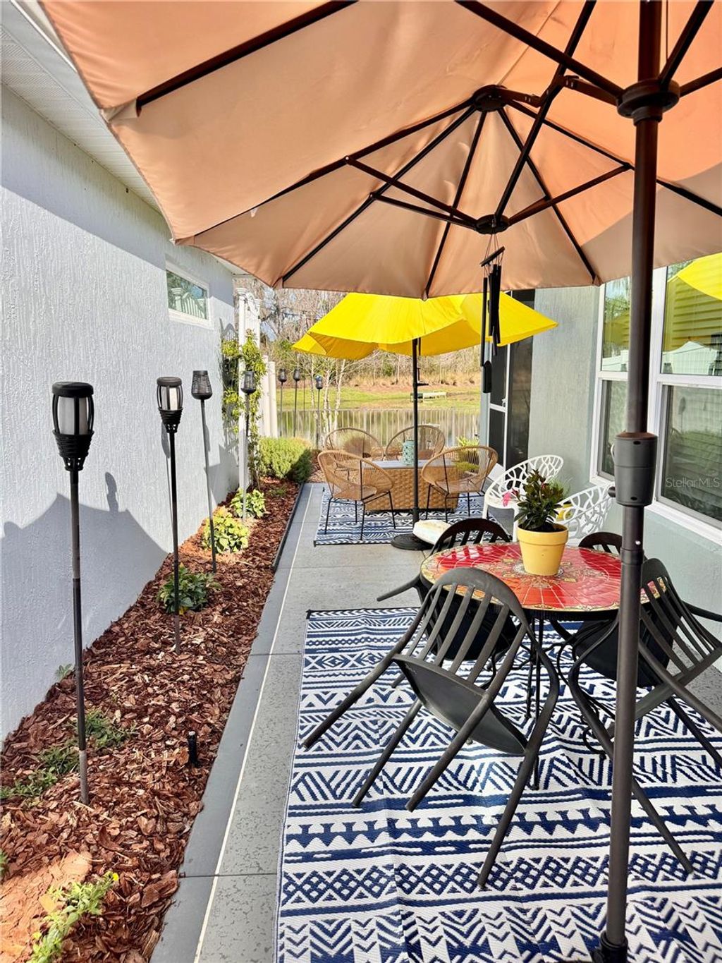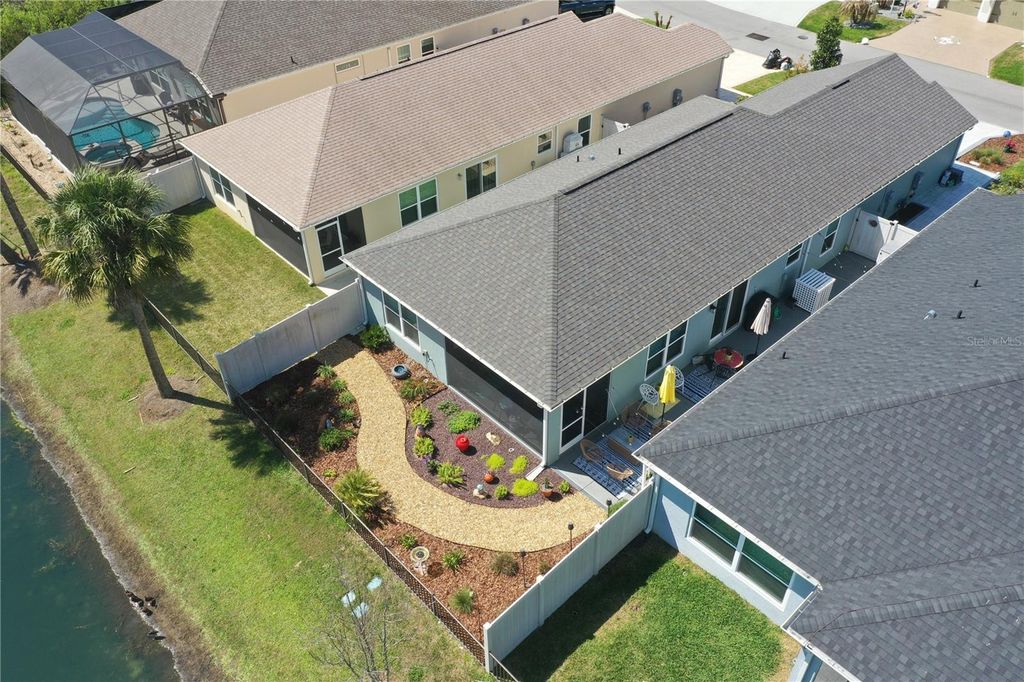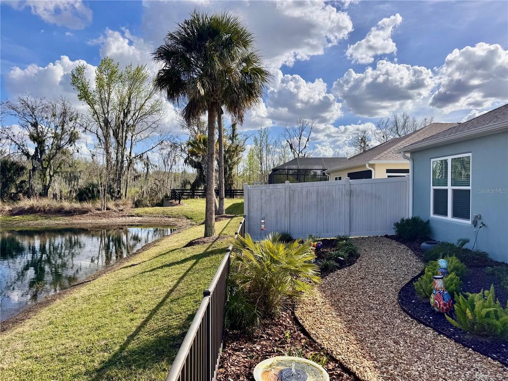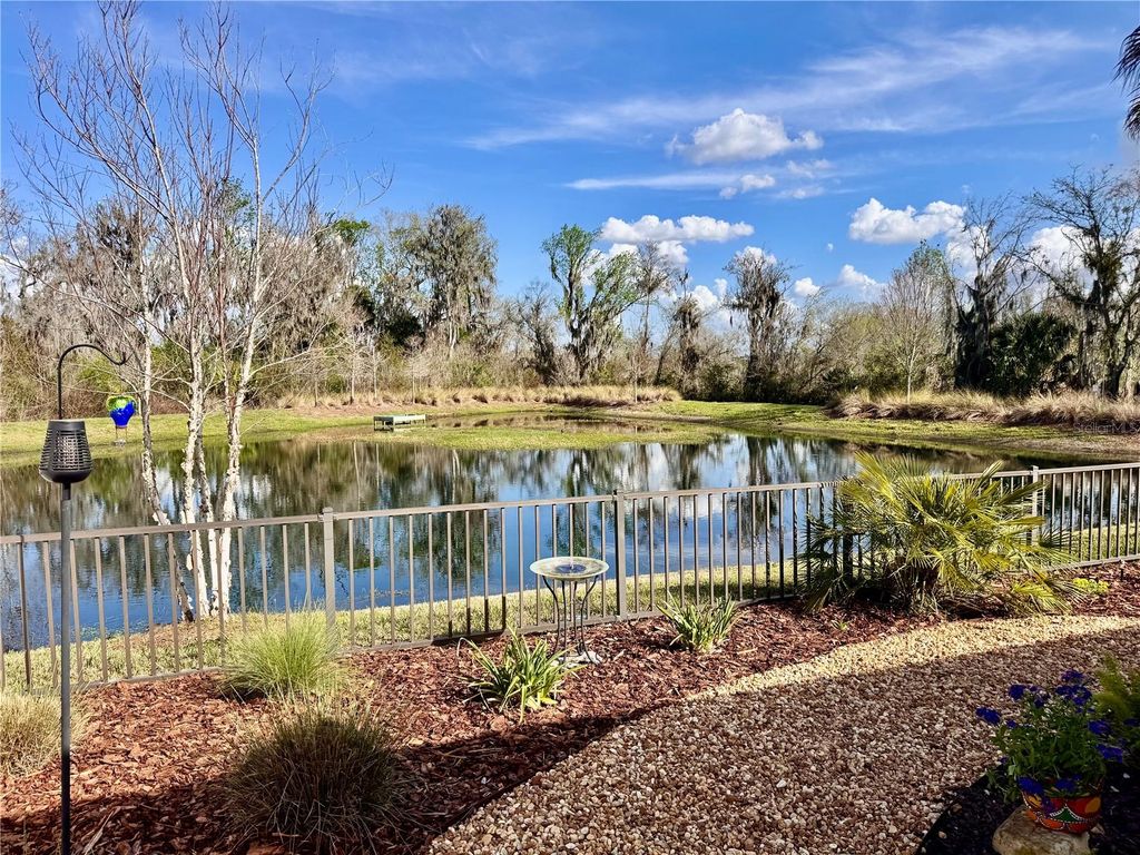 Welcome to 4193 Silvana Way, where beautiful design and PEACEFUL WATERFRONT VIEWS come together to create a home that feels like a PRIVATE RETREAT in the heart of The Villages. From the moment you arrive, the charming coastal color palette, STAMPED DESIGNER DRIVEWAY & WALKS , and inviting SCREENED-IN front entry set the tone for the relaxed Florida lifestyle waiting inside.Step through the door and you're greeted by an open, light-filled floor plan with warm luxury flooring throughout-no carpet, soaring ceilings, and a beautifully designed kitchen that naturally becomes the heart of the home. The spacious breakfast bar , white cabinetry, QUARTZ COUNTERS THROUGHOUT, stainless appliances, and stylish lighting create a space that feels both elegant and welcoming "” perfect for casual mornings, gathering with friends, or hosting memorable dinners.The living and dining areas flow effortlessly together, allowing the stunning backyard setting to take center stage. Large sliding doors lead to a PICTURE WINDOW screened LANAI designed for enhanced viewing,and year-round enjoyment, where comfortable seating invites you to relax and take in the peaceful water views. Just beyond, the thoughtfully landscaped backyard creates a private outdoor oasis with WINDING STONE PATHS, colorful plantings, and a patio space perfect for evening gatherings under café lights.The primary suite offers a SERENE ESCAPE with a beautifully updated bathroom featuring DUAL SINKS, modern finishes, SEPARATE WATER CLOSET with a built in Cabinet, and a spacious walk-in shower that feels fresh and spa-like.A GUEST BEDROOM, Bath, and Laundry Room which has extra CABINETS are made private by a pocket door off the Kitchen.Third Bedroom is currently being used as an Office, but can accommodate a Queen size bed. Every room throughout the home reflects thoughtful care and attention to detail, creating a space that feels both comfortable and refined.Whether enjoying a quiet morning watching the water, entertaining friends on the lanai, or simply soaking in the peaceful setting, this home delivers the lifestyle that makes living in The Villages so special.ADDED FEATURES INCLUDE...Rain gutters, attic stairs, whole house water filtration, portable generator plug and wiring panel updated to use generator during power outages. Minimal Lawn Mantainence. Homes with views, outdoor living spaces, and this level of charm are the ones buyers remember long after a showing ends. If you're looking for a home that truly stands out, 4193 Silvana Way is ready to welcome you. Call me!