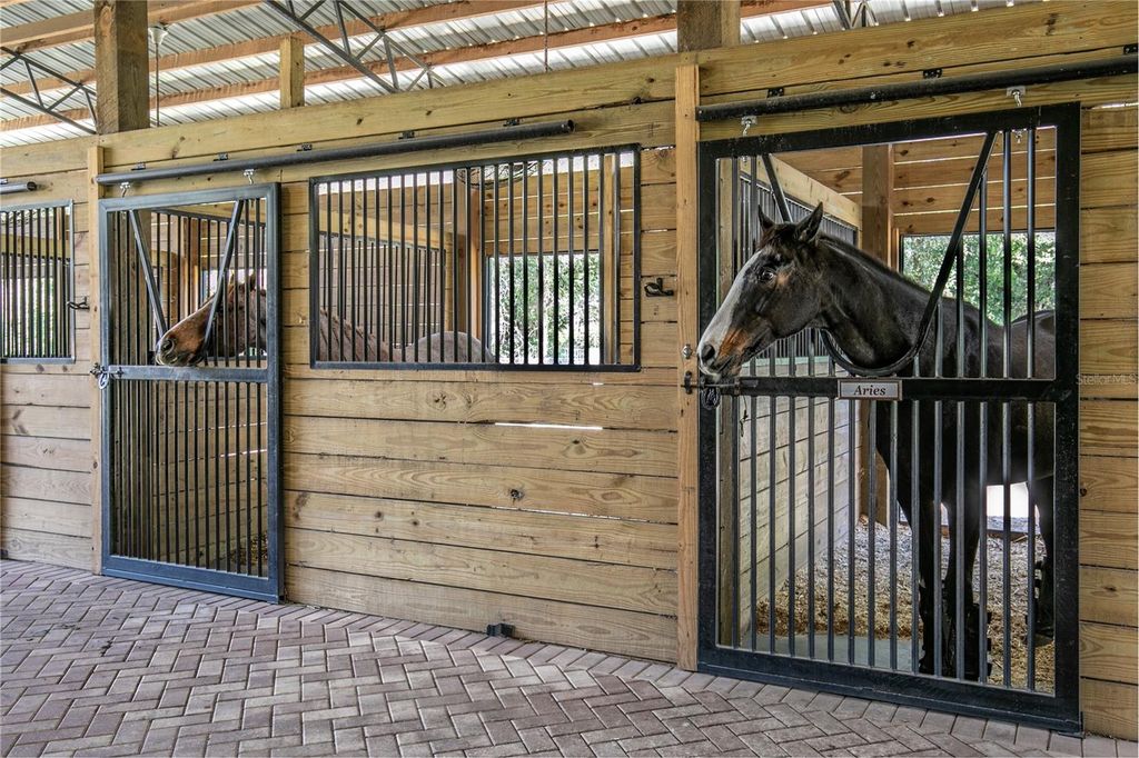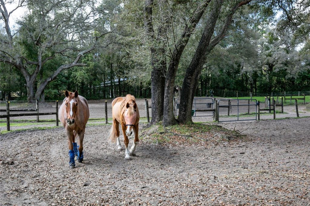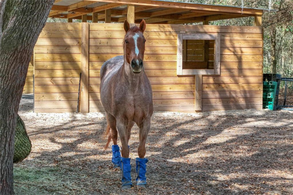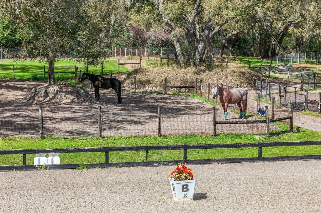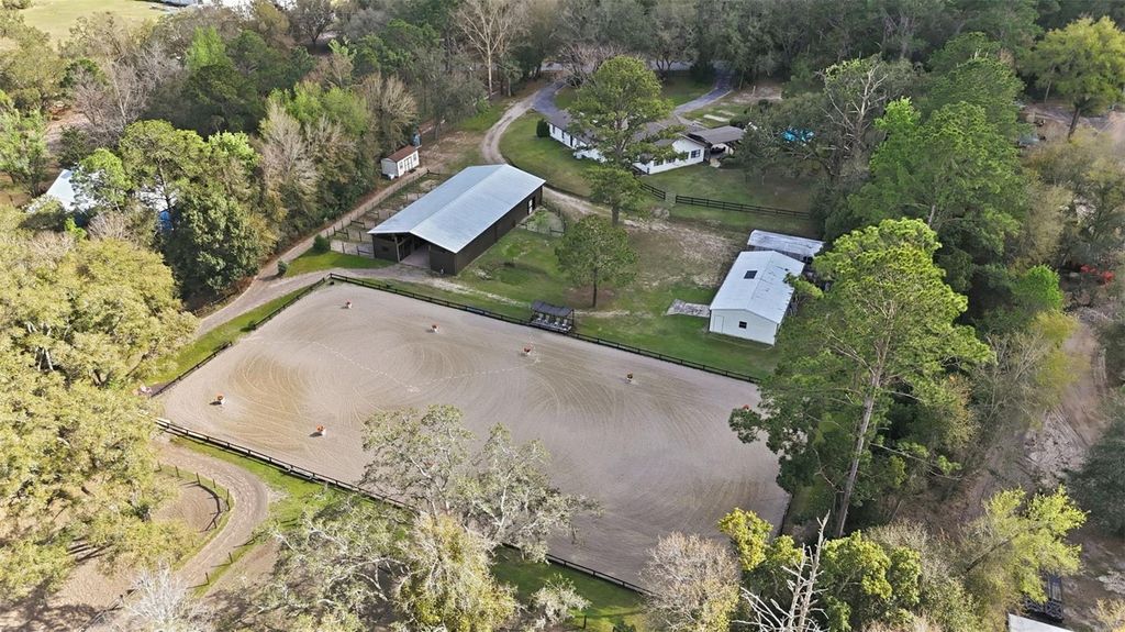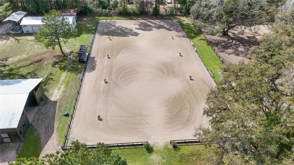 Exceptional design and thoughtful planning define this beautifully appointed equestrian property where well-equipped horse facilities and comfortable living spaces come together to create a truly turnkey horse estate. At the center of the property is a thoughtfully designed main barn built with both functionality and airflow in mind. A striking 16-foot pavered center aisle leads to eight spacious 12' x 12' stalls, each with attached run-ins that provide flexibility and excellent ventilation. The barn is equipped with oversized aisleway fans, automatic waterers, lighting and electrical outlets in every stall, two 12' x 12' wash racks, a feed room, and eight walk-in tack lockers for organized storage. An air-conditioned kitchenette with hot and cold water adds convenience for daily barn operations. The layout also allows the option to add an additional stall or expand hay and feed storage if desired. An additional two-stall barn with wash rack is located within one of the paddocks. The riding facilities are equally impressive. A full-size 100' x 200' laser-leveled competition dressage arena with fiber footing and irrigation provides a consistent surface ideal for schooling and training. A viewing stand with additional deck space overlooks the arena, offering a comfortable place to observe riding activity. Five shady paddocks with irrigation and no-climb fencing provide generous turnout space. A small trail loop winds through the back of the property, and designated areas are in place for manure composting and disposal. Additional improvements include a pole barn with 14-foot ceilings and adjacent parking pad providing excellent space for trailers, tractors, or equipment. The detached 50' x 25' garage/workshop features two roll-up doors and multiple power options including 120V 30-amp, 240V 50-amp, and 125V 30-amp service. Accessed through two electric gates, the residence offers privacy and a welcoming sense of arrival. The main home features four bedrooms, three bathrooms, and a dedicated office, along with a private one-bedroom, one-bath in-law suite with separate entrance, living room, and kitchenette. Stamped concrete floors run throughout the main living areas and are complemented by abundant natural light. The living room features a gas fireplace that creates a warm focal point for gathering. A spacious family room with built-in bench storage offers flexible space ideal for a media room, exercise area, or additional living space. The primary suite includes a walk-in closet and ensuite bath with garden tub. Bedrooms two and three share a Jack-and-Jill bathroom, while bedroom four is located near an additional full hallway bath. Outdoor living spaces include a raised garden area and a covered patio overlooking a tranquil goldfish pond that leads to the swimming pool, creating a peaceful setting for relaxing or entertaining. Located in an area known for its equestrian lifestyle, the property offers convenient access to riding trails in nearby Seminole State Forest and Ocala National Forest. It is also within comfortable driving distance of popular show grounds including Clarcona Horse Park, Grand Oaks, and the Florida Horse Park. Shopping, dining, and everyday conveniences are just minutes away, while Ocala, Orlando, area airports, and Florida's east coast beaches remain easily accessible.