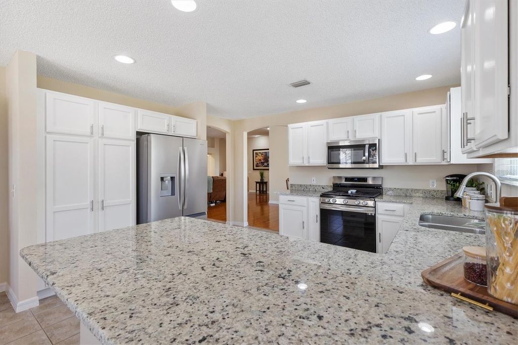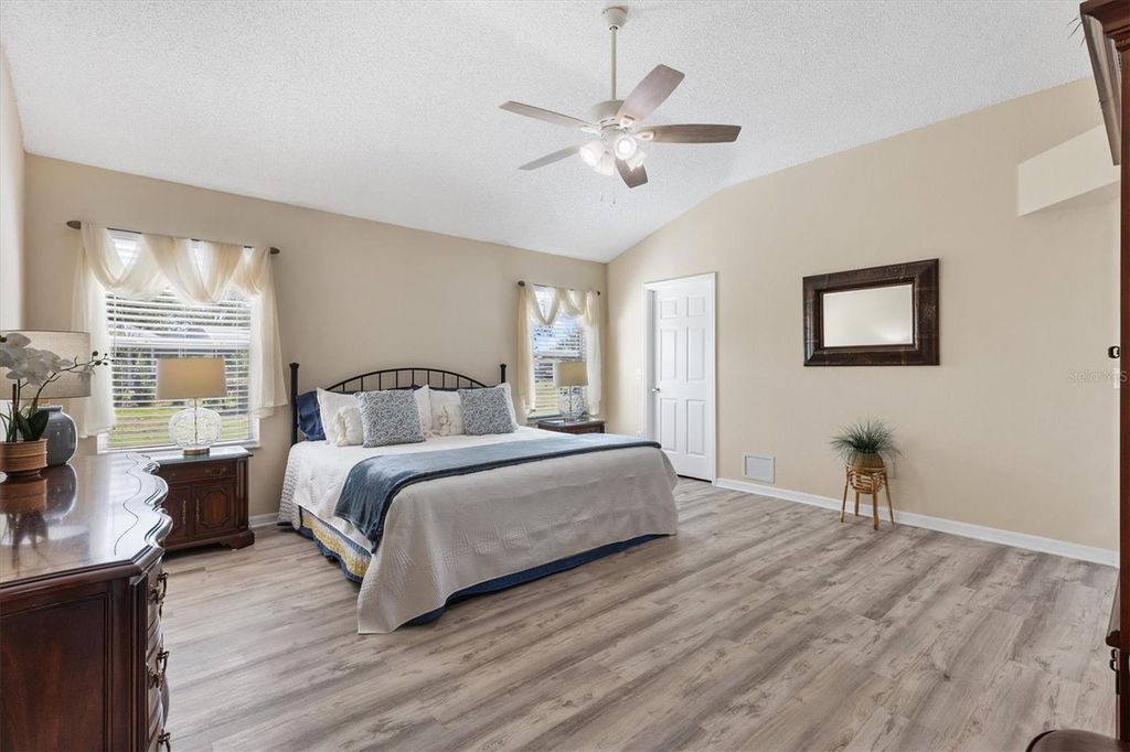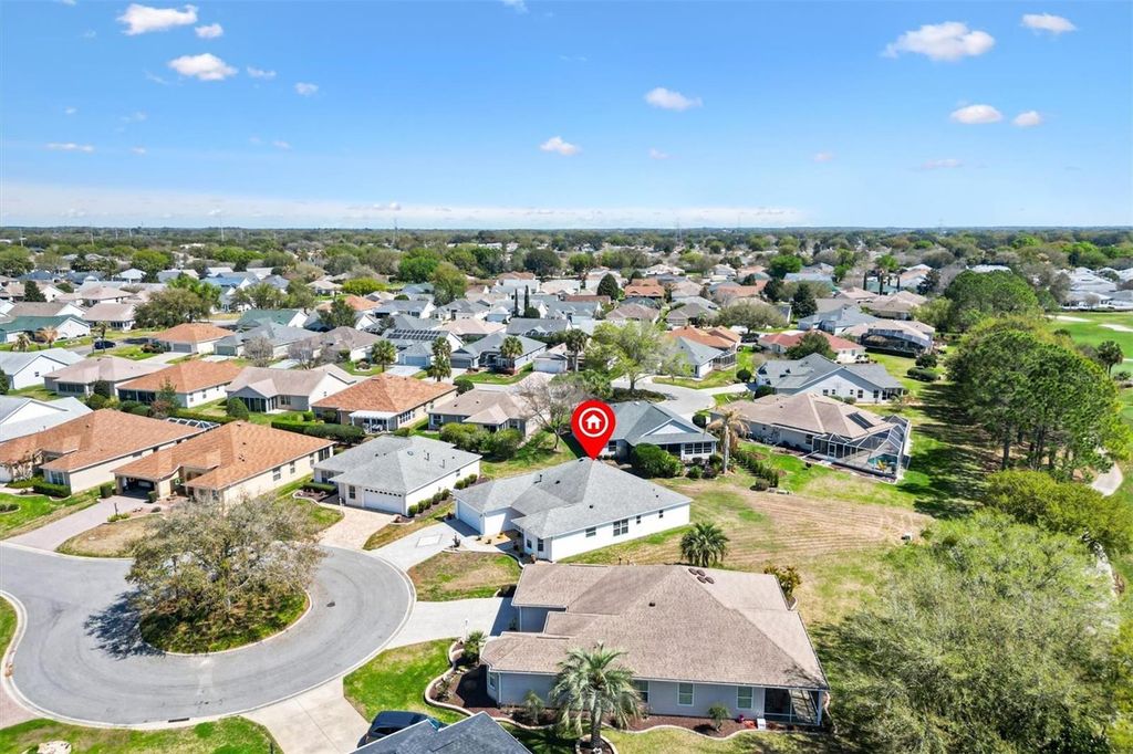 Designer Cypress | Golf & Water Front | Glenview Talley Ho Championship Course. Live the golfer's dream in this beautifully maintained Designer Cypress model ideally located in the sought-after Village of Piedmont, perfectly positioned on tee box #6 of the Glenview Talley Ho Championship Golf Course with peaceful golf and water views. Situated on an oversized private cul-de-sac lot, this home offers both privacy and stunning scenery with plenty of room to design your dream outdoor retreat "” even space for a future pool. Inside, the home showcases high ceilings, neutral designer tones, and a meticulously maintained interior that feels both elegant and welcoming. The eat-in kitchen with large bay window features granite countertops, light cabinetry, stainless steel appliances, a gas range, and a brand-new refrigerator, creating the perfect space for both everyday living and entertaining. Thoughtfully updated throughout, the home includes beautiful wood flooring in the living and dining areas, new luxury vinyl plank flooring in the bedrooms and bathrooms, and tile in the kitchen for easy maintenance. Both bathrooms have been tastefully updated with granite countertops, while the primary suite includes a bidet for added comfort. Step outside to the screened lanai where you can relax and take in sweeping golf course views and the expansive backyard, an ideal setting for morning coffee or evening sunsets. Additional highlights include: Roof replaced in 2020, A/C replaced in 2017, Meticulously organized garage with tool rack system and snap-tile protective flooring, Located on the excellent Glenview Talley Ho Championship Course, this home blends style, comfort, and the iconic Villages golf lifestyle into one exceptional property. Simply elegant. Impeccably maintained. Ready for its next owner to enjoy the best of The Villages. BOND is PAID. Furniture available.
