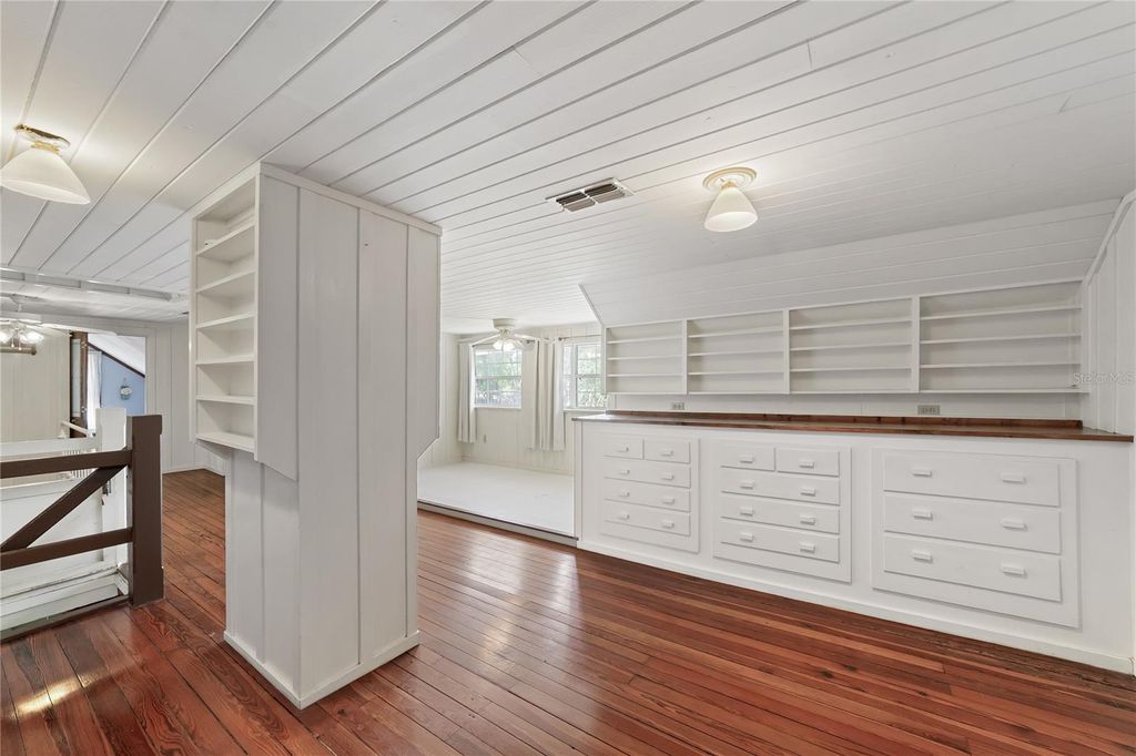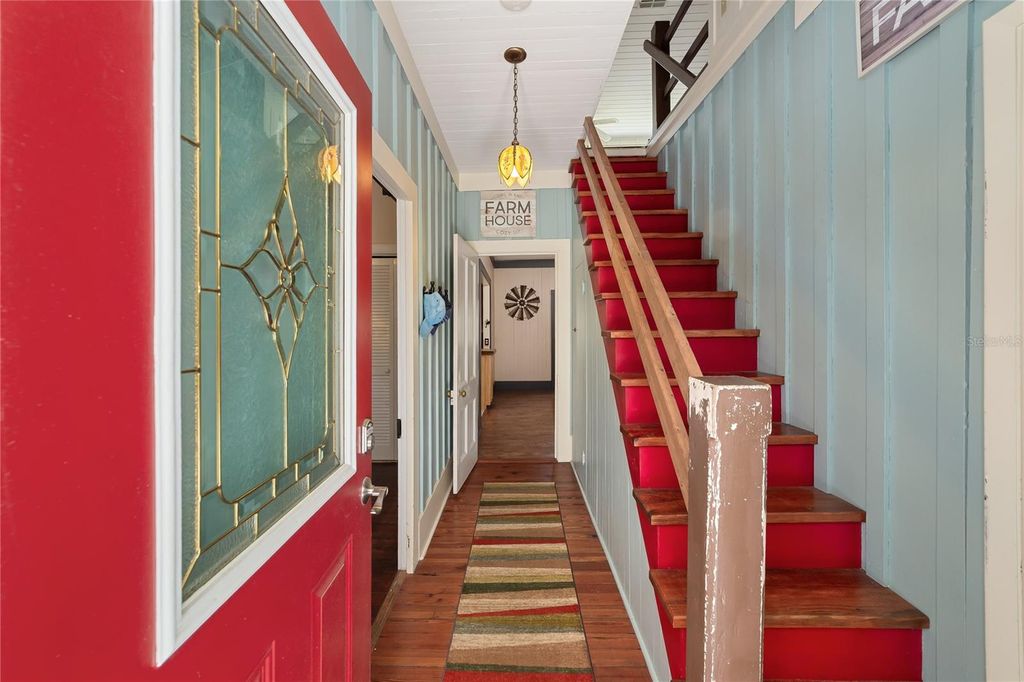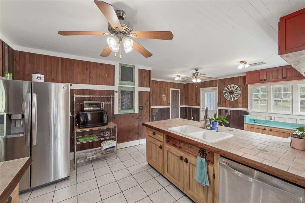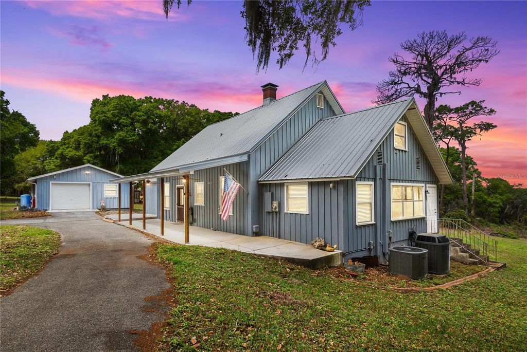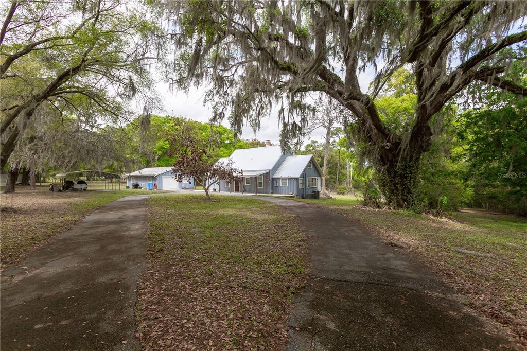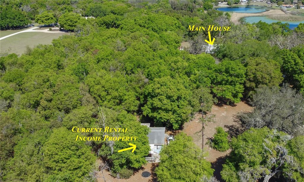 WATERFRONT PROPERTY! FARMHOUSE! Nestled on 6.74 acres with a beautiful view of Myrtle Lake, this unique property offers privacy and character in the heart of Fruitland Park. The historic main home, originally built in 1925, blends timeless charm with thoughtful updates with plenty of functional space. The main residence features 3 bedrooms and 3 bathrooms. There are two bedrooms downstairs with walk-in closets, shower tub combination and standalone shower. Inside you will find a spacious family room with a cozy wood-burning fireplace, multiple flooring types including wood, tile, vinyl and brick. Charming barn doors add rustic character throughout the home. This property offers abundant storage space, making it both practical and comfortable for everyday living. Recent updates include HVAC replacement in 2020, Tin roof in 2025, underground utilities, new plumbing pipes, providing peace of mind for future owners. Enjoy the outdoors from the front porch or back porch overlooking the expansive acreage and water view, which could be cleared to reach the water. Additional improvements include a detached garage with a washer and dryer, a bathroom, and a guest room, workspace or storage, along with a separate shed. Most of the property is fenced, providing flexibility for your pets, gardening or recreation. An opportunity like this is hard to find in Fruitland Park.