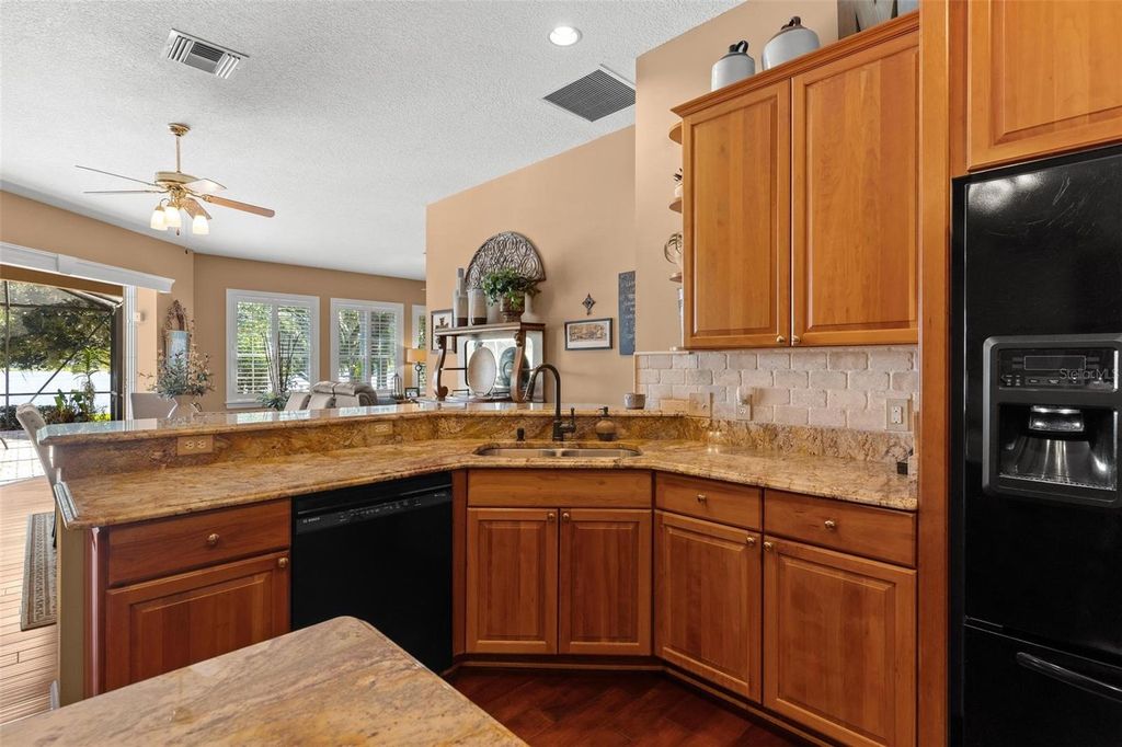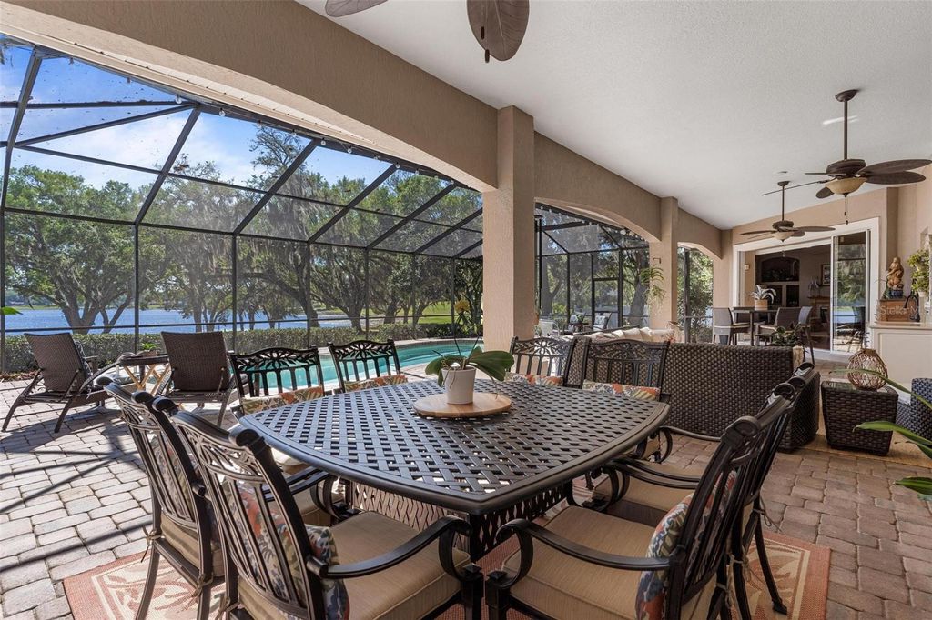 Wingspread POOL home on the LAKE! Welcome to one of Wingspread's most impressive waterfront residences"”custom built for its original owner and thoughtfully designed to capture both beauty and function. Tucked away on a peaceful 1.52 acre lot in a sought-after neighborhood, this home offers exceptional curb appeal with a long, picturesque circular driveway providing plenty of parking while maintaining a peaceful, set-back feel. Inside, you'll find nearly 3,900 square feet of living space with a layout that flows effortlessly from room to room. The home features three spacious bedrooms, each with its own en-suite bath, along with a convenient half bath for guests. A formal living room and dining room provide elegant entertaining spaces, while the heart of the home opens into a warm and inviting family room with a fireplace, seamlessly connected to the kitchen and casual dining area. The kitchen is beautifully finished with custom cabinetry, pull-out storage, a center island, breakfast bar, built-in desk area, and top-of-the-line appliances"”designed for both everyday living and hosting. Expansive sliding glass doors recede, blending indoor and outdoor living and drawing your eye to the stunning screened pool and lanai. With over 860 square feet of covered outdoor space, this area is ideal for entertaining, complete with paver decking, an outdoor counter entertaining area with cabinetry, refrigerator, wet bar, and peaceful lake views. The primary suite also enjoys direct access to the pool and offers generous closet space, a luxurious bath with a walk-in shower, garden tub, dual vanities, and a dedicated sit-down vanity area. Additional features include stunning wood flooring throughout, plantation shutters, and a private office or den perfect for working from home. For those needing exceptional storage or garage space, this property truly stands apart"”offering approximately 1,566 square feet of garage space with soaring 14-foot ceilings... ideal for an RV or boat. A full staircase leads to a 400+ square foot second-floor storage room, providing even more storage. Outdoors, the property continues to impress with a beautifully maintained yard, a 14-zone irrigation system fed by a separate well, and a fenced area for pets. A private boat dock completes the waterfront lifestyle, making it easy to enjoy everything this serene lakefront setting has to offer. This is a rare opportunity to own a truly custom, well-designed waterfront home in one of Fruitland Park's most desirable communities.