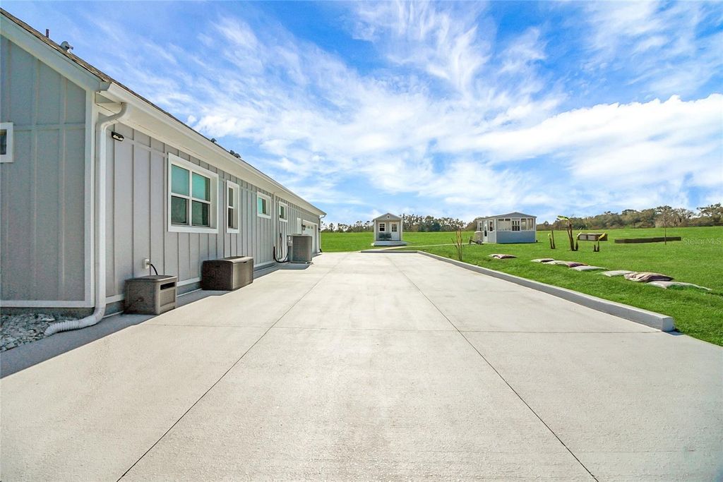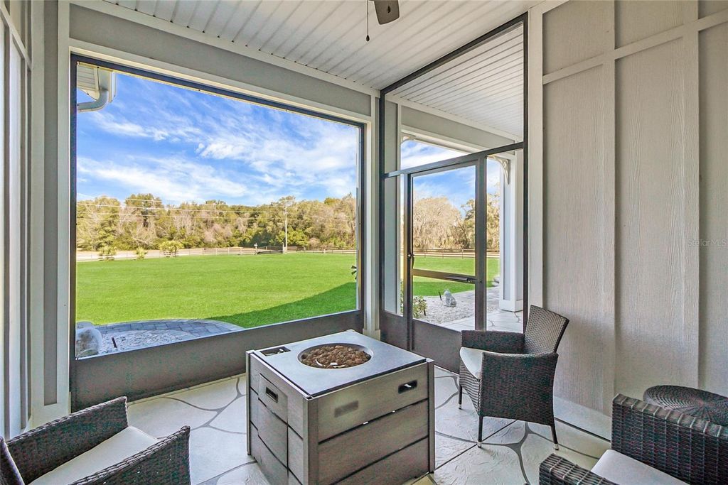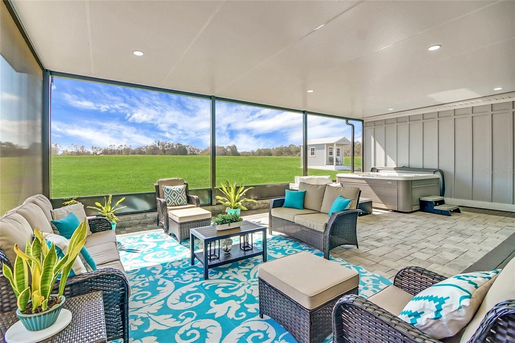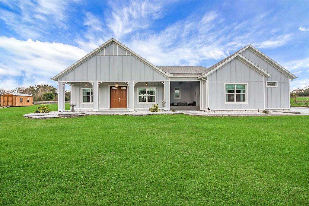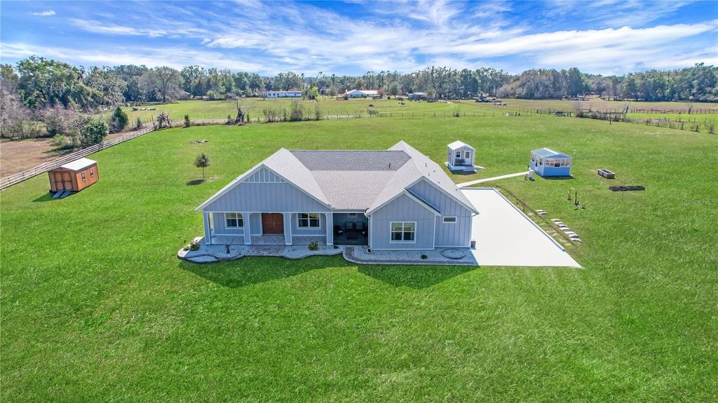 Experience country living at its finest in this stunning custom-built 2021 BLOCK home, finished with Hardie Board planks that create a modern farmhouse feel. Nestled on 5 fully fenced acres with an IRON solar powered gate providing a sense of privacy, this property offers the perfect blend of luxury, comfort, hobbies, and outdoor living. From the moment you arrive, the grand 8-foot double doors welcome you into an open and thoughtfully designed split floor plan featuring 10-foot ceilings, volume spaces, Ceramic wood-look tile flooring, 5-inch baseboards, and an abundance of natural light throughout. The inviting living room showcases an elegant porcelain tile electric fireplace, creating a perfect space to relax and unwind. The chef's kitchen is truly the heart of the home, offering an expansive breakfast bar with natural quartzite countertops, a farmhouse-style sink, a massive custom walk-in pantry, soft-close cabinetry, high-end fingerprint-resistant stainless steel appliances, recessed and pendant lighting, and a dedicated coffee bar area designed for both function and style. The luxurious primary suite provides a private retreat with a tray ceiling and its own porcelain tile fireplace, while the spa-inspired en suite bathroom features an oversized walk-in shower with multiple shower heads and bench seating, a freestanding whirlpool soaking tub, a bidet toilet, and an impressive California-style walk-in closet complete with built-ins and a sitting area. Just beyond the primary suite, you'll find a private office, an indoor laundry room, and a convenient half bath. Upstairs, a spacious bonus room offers endless possibilities, whether used as a media room, home gym, or additional guest space. The secondary bedrooms are generously sized and share a full bathroom with a tub and shower combination. Step outside and take in everything this property has to offer, including a charming covered front porch, a screened side porch, and an expansive lanai featuring a six-person hot tub"”perfect for entertaining or simply enjoying peaceful evenings. The outdoor space continues with a large paver patio, multiple custom built storage sheds including one with electricity, a greenhouse, and plenty of open land ready for your animals, horses, or recreational toys. This luxury home is full of opportunities including a possible Mini farm if that is your heart's desire, as there are already chickens in place producing eggs and the zoning allows for various other animals as well. The oversized garage is equally impressive, featuring epoxy flooring, a water softener system, a split A/C unit, and additional storage space. Built with spray foam insulation, the home is designed for energy efficiency, helping maintain cooler temperatures year-round. Ideally located just 10 minutes from Brownwood Town Square in The Villages, this property offers the serenity of country living with convenient access to shopping, dining, and entertainment. In addition, this home is situated in a country setting but has easy access to US HWY 301, Interstate 75 and Hwy 44. This one-of-a-kind homestead truly delivers space, luxury, and lifestyle all in one remarkable package. Schedule your private showing today and start living your best life.