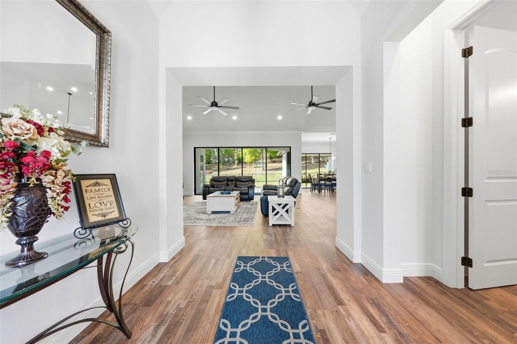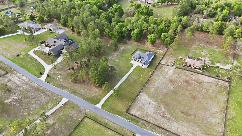 Luxury, space, and timeless design come together in this stunning custom residence located in the highly sought-after acreage community of Lakewood Ranches. Situated on 3.25 private acres, this exceptional 4-bedroom, 3.5-bath home offers the perfect blend of upscale living, thoughtful design, and peaceful surroundings, highlighted by striking copper roof accents that reflect the quality found throughout. From the moment you enter, the home impresses with vaulted ceilings, crown molding, and an open, light-filled layout designed for both everyday living and effortless entertaining. Three expansive sliding glass doors create a seamless connection between the interior living spaces and the outdoor entertaining area, filling the home with natural light and beautiful views of the property. The gourmet kitchen serves as the heart of the home and is designed to impress, featuring granite countertops, high-end soft-close cabinetry, an oversized island, premium appliances, wine cooler, double oven range with designer hood, and a spacious butler's pantry offering exceptional storage and prep space. The expansive primary suite provides a private retreat with bay windows overlooking the property. The spa-inspired ensuite bath features dual vanities with a dedicated vanity area, a large walk-in shower, and multiple storage closets, while the oversized walk-in closet provides abundant organization space. Additional interior features include a library or flex room, recessed lighting, custom accent walls, spacious walk-in closets, waterproof luxury vinyl plank flooring, custom blinds, low-E windows, blown-in insulation, and a well-designed laundry room with sink and floor drain. Outdoor living is equally impressive. The large covered patio with ceiling fans creates the perfect setting for relaxing or entertaining while enjoying the expansive acreage and peaceful surroundings. The property also includes an oversized two-car garage plus an additional side-entry garage, ideal for storage, recreational equipment, or a golf cart. An XL well system efficiently services the home and offers capacity for future additions such as a detached structure or additional amenities. Located in East Lake County, Lakewood Ranches offers the appeal of spacious acreage living while remaining convenient to nearby shopping, dining, and major roadways connecting to the greater Orlando area. The surrounding area is also known for its abundance of equestrian amenities and outdoor recreation opportunities, with nearby riding trails, training facilities, and horse-friendly parks providing opportunities for trail riding and equestrian activities throughout the region. Combined with the area's scenic landscapes and open spaces, this location offers a unique opportunity to enjoy both luxury living and a lifestyle connected to the outdoors. A rare opportunity to own a beautifully designed luxury home on acreage in one of East Lake County's most desirable communities.