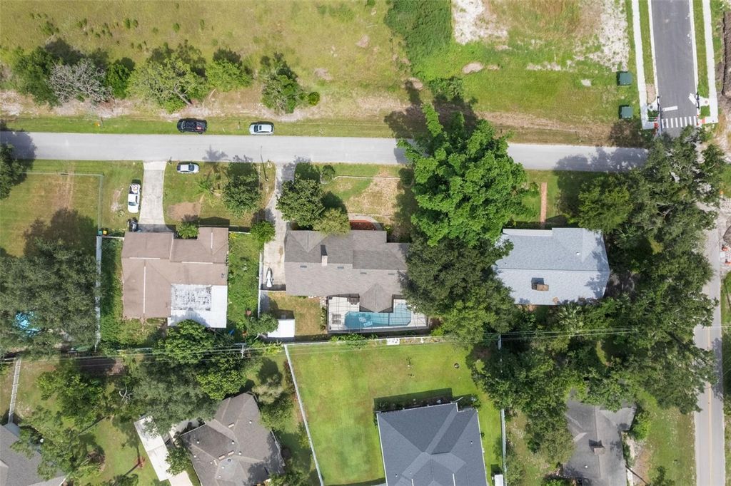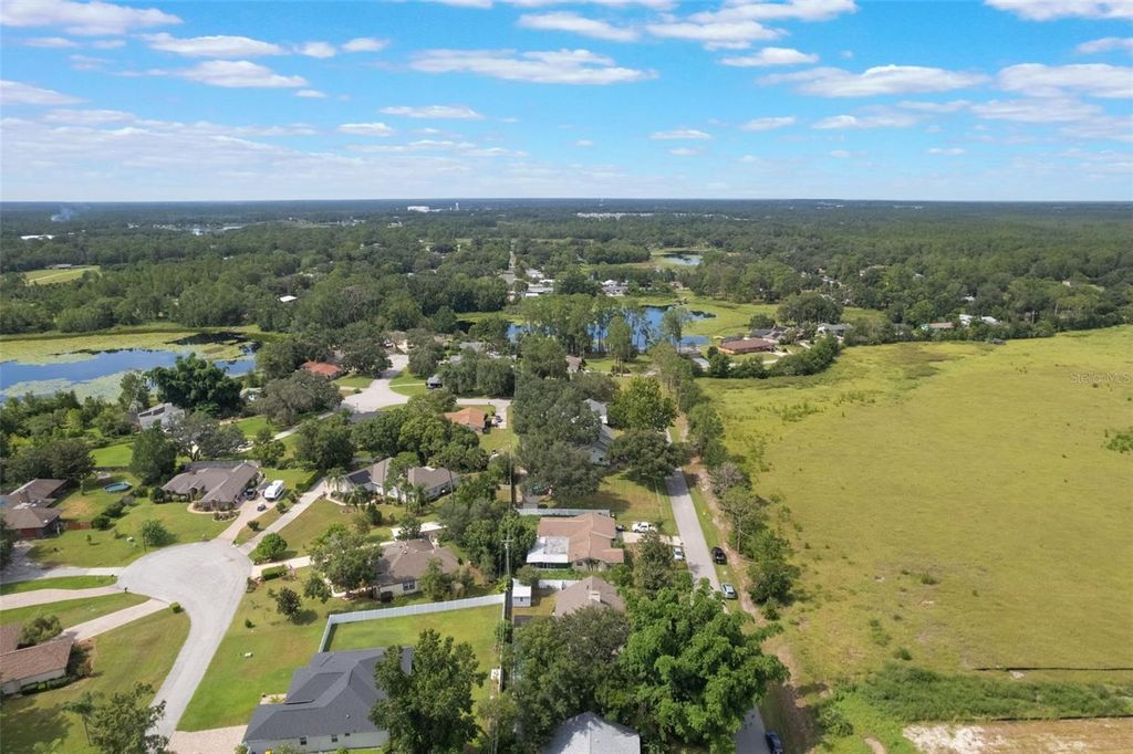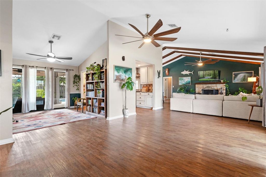 Welcome home to this beautifully updated 3-bedroom, 3-bathroom ranch-style retreat offering 2,207 square feet of living space on just over a quarter acre of land in Eustis! Nestled on a quiet street with no HOA, this property combines the best of country tranquility while providing proximity to everyday conveniences and the charm of nearby Mount Dora, Tavares, and Umatilla. As you step through the front entrance, you're greeted by an open floorplan with airy vaulted ceilings and wooden beams, an abundance of natural light provided by large floor to ceiling windows, and French doors that draw your eyes straight to the screened-in pool area, creating a seamless indoor-outdoor living experience. To your right, an inviting great room is centered around the cozy stone-faced, wood burning fireplace alongside sliding glass doors that lead you back to your large covered front porch. Just off of the great room you will find two dining areas, each with direct access to the pool deck and the completely renovated kitchen, a true chef's delight featuring granite countertops, a high-end gas range and oven, solid wood cabinets as well as a pass through to the dinette area, perfect for your entertaining needs. Step through the French doors to your own private oasis: a large screened-in pool deck with a refreshing swimming pool, covered lounging area with ceiling fan, and plenty of deck space to relax or entertain. Whether you're hosting guests or enjoying a quiet morning swim, this area is truly the heart of the home. After enjoying the pool, imagine sitting out front on the massive covered front porch. Another standout feature, with its stone veneer, tongue and groove ceilings, multiple ceiling fans, and peaceful views of the 770-acre Pine Meadows Conservation Area across the road. It's a perfect place to unwind at sunset, enjoy a good book, or sip your morning coffee with nature as your backdrop. Back inside, the left wing of the home features three spacious bedrooms all offering luxury vinyl flooring. The primary suite is privately situated at the rear of the home with direct access to the pool deck via a beautifully renovated ensuite bathroom. Just off the primary bedroom is a flexible guest bedroom that also works great as a home office. The third bedroom is generously sized and located near a full hall bathroom boasting double a vanity, perfect for guests or family members. On the opposite wing of the home is a third full bathroom, conveniently located just off the family room, leading to the oversized laundry room, which includes a utility sink, private entry/exit and plenty of cabinetry for additional storage. Outside, you'll appreciate the 2-car garage and extended driveway offering plenty of parking. The fully fenced backyard includes a large shed for storage, and the mature landscaping adds to the charm and privacy of the home. This home is the perfect blend of modern comfort and country charm with no HOA to limit your lifestyle. Don't miss your chance to call this Eustis gem your own and schedule your private tour today!