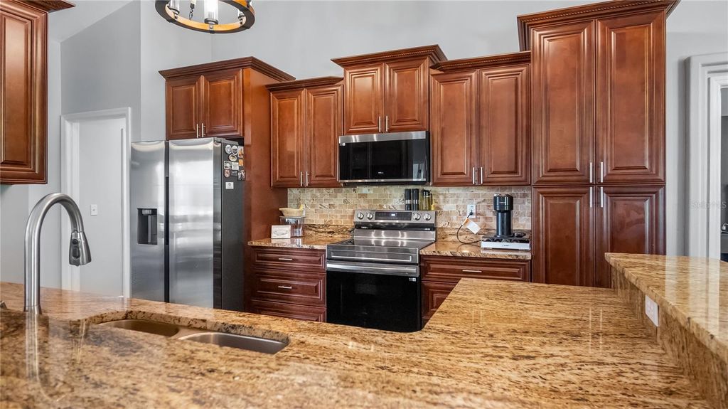 DIRECT frontage on the golf course! This 3 bedroom home PLUS den/office PLUS Florida room and extra room overlooking the rear yard and 13th fairway! Set on an oversized homesite at the end of a quiet cul-de-sac, this beautifully maintained residence offers over a third acre of land and sweeping fairway views. The setting delivers the privacy and open space that make golf course living so desirable, with no rear neighbors and peaceful vistas that stretch across the course. Inside this immaculate home, vaulted ceilings and an open, inviting floor plan create a light and spacious feel designed for comfortable everyday living and easy entertaining. The home features three bedrooms plus a dedicated office, along with two full bathrooms arranged in a practical split-bedroom layout that provides privacy for the primary suite. The kitchen was completely remodeled in 2022 and serves as the centerpiece of the home. Solid wood custom cabinetry, granite countertops, soft-close doors and drawers, and a GE stainless steel appliance package create a refined and highly functional space, all accented with elegant crown molding. The kitchen flows naturally into the main living areas where beautiful luxury vinyl plank flooring extends throughout the home's living spaces, offering both durability and style, while the bathrooms feature upgraded ceramic tile. The spacious primary suite enjoys peaceful golf course views and includes a generous walk-in closet along with a beautifully renovated en-suite bath featuring dual sinks, a garden tub, and a separate shower. Bedroom two has also been enhanced with a custom closet system, adding both organization and functionality. At the rear of the home, both the family room and the enormous enclosed Florida room capture unobstructed views of the golf course. The Florida room creates the perfect setting for morning coffee, relaxing afternoons, or entertaining while enjoying the tranquil fairway scenery. The bonus room off the primary suite would make a great hobby room, flex room or secondary office! Green Valley Country Club offers optional golf membership and a very low annual HOA. The location is very convenient, with quick access to Highways 50, 27, 19 and the Florida Turnpike, medical facilities, shopping, dining, and the newly revitalized Downtown Clermont area with live music, local shops and restaurants, breweries and wine shops, Farmers Market and community events. Orlando International Airport is 45 minutes away, Walt Disney World, Universal Studios, Sea World and large malls all within 45 minutes as well. Please see the interior/drone video but know that the true quality needs to be seen to be appreciated, so make your appointment now!
