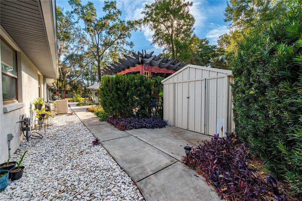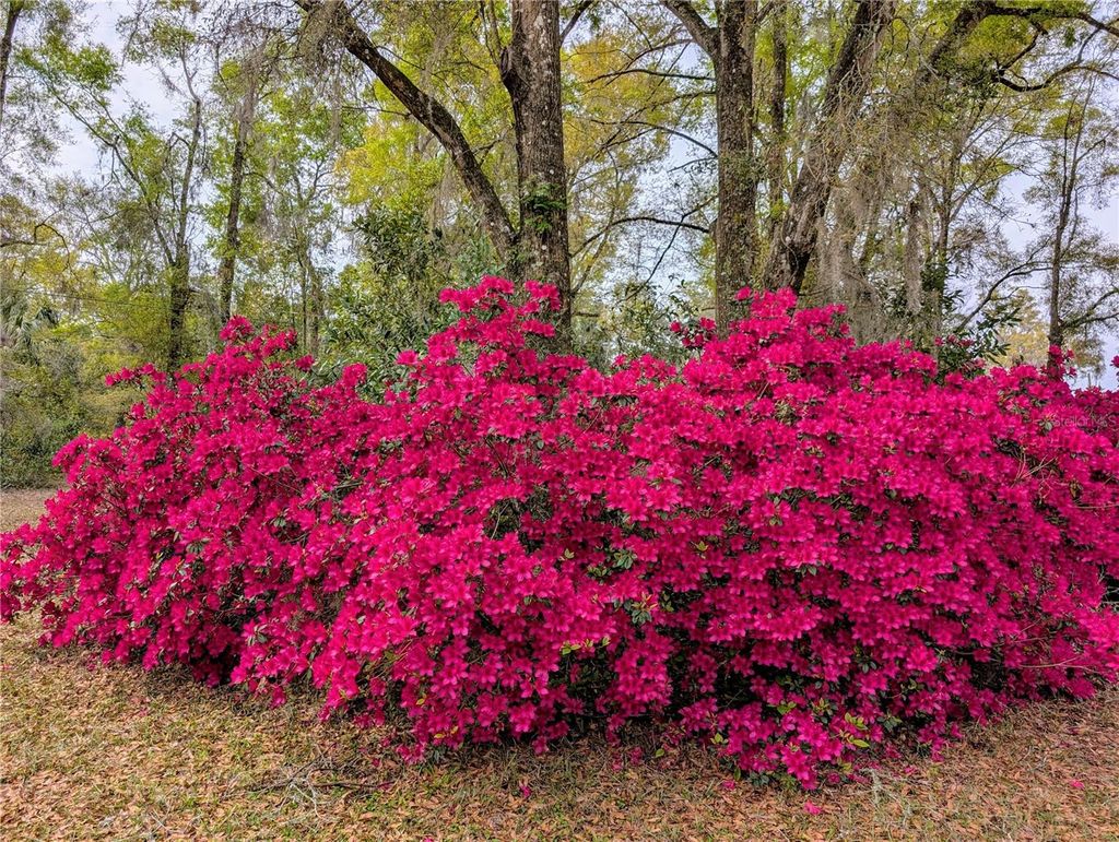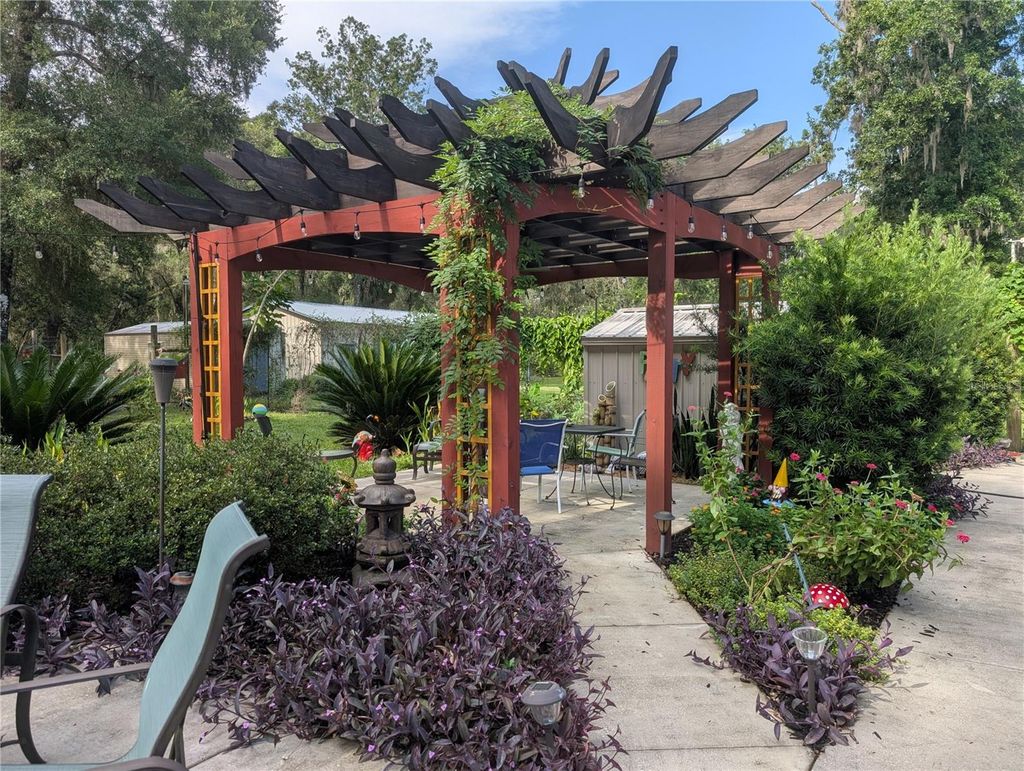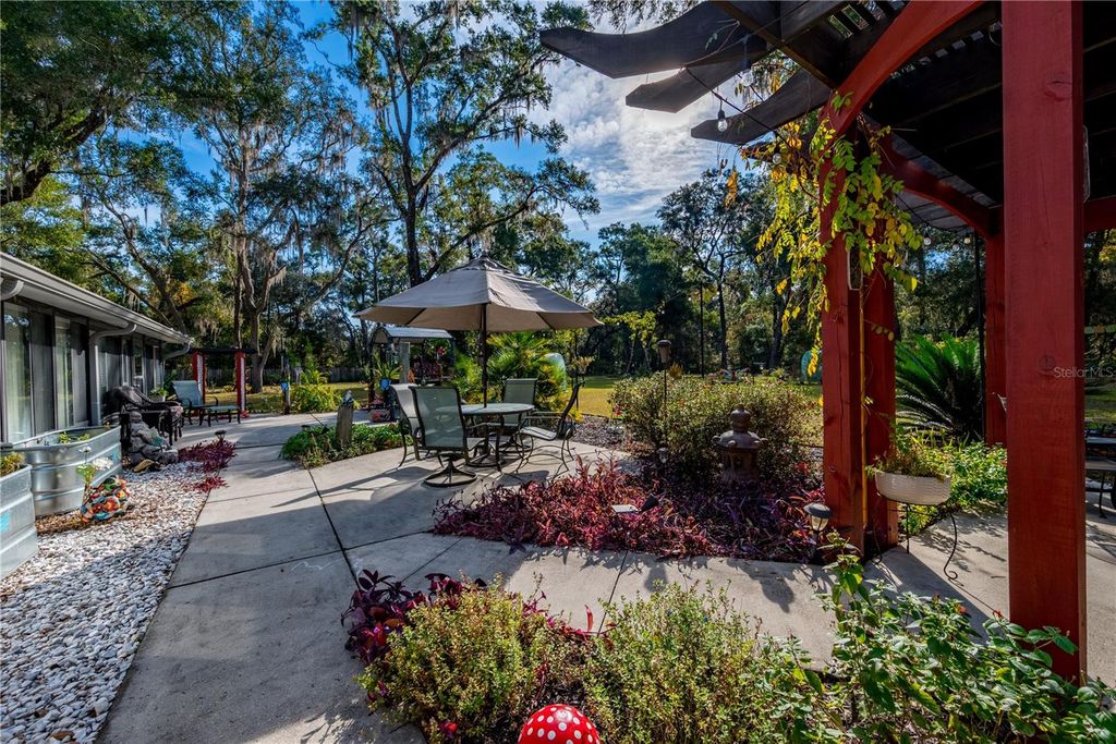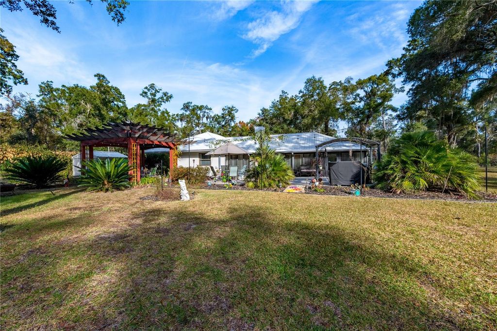 Beautiful custom 3BR/2BA concrete block stucco ranch home set on 10.3 acres, offering privacy, space, and comfortable living. Inside, a striking rock fireplace anchors the main living area, creating a warm and inviting atmosphere, and the master suite features large his and hers walk-in closets. The kitchen features a large walk-in kitchen pantry, double oven range and easy access to the dining room with built-in granite top buffet. Just off the dining area is a large sunlit Florida room, where half is open area and half features a beautiful custom-built wood and brass rail wet bar that seats 8-10. The expansive rear patio includes a gas grill supplied by a buried propane line from a large, buried propane tank (no portable propane tanks to refill!) as well as a custom-built pagoda-style pergola, adding an ideal outdoor entertaining space to the mix. Outside, the home features a 2-car attached garage, a 2-car carport, a large storage shed and a 3-car detached garage with workshop and concrete aprons front and back. A large parking apron and paved driveway provide ample space for vehicles, RVs and guests, and there is a dedicated RV hookup at the house for added convenience. A whole-house generator fueled by the same buried propane tank, automatically powering the entire home, including HVAC and appliances during outages, and seamlessly restoring service once power returns. Toward the back of the property, a plumbing and septic system separate from the main house is ideal for an RV, mother-in-law apartment or other future use. Approximately 5 acres surrounding the home are beautifully landscaped, creating a park-like setting with perennial gardens, secret garden walkways, a variety of mature trees, >150 Long Leaf Pine and Hickory tree seedlings, perennial flowers, as well as native flowering bushes and vines that attract butterflies and birds. A 3/4-acre back yard is fenced in 8 ft tall wire on 3 sides to keep deer out and pets in, and a 6 ft wood privacy fence on the remaining side to block the view of the nearest neighbor. A living privacy fence of resilient flowering trees and bushes that will reach 10-12 ft at maturity was planted in early 2025 to augment the wood fence, and includes Chaste and Flatwoods Plum trees, Ocala Anise, Slim Bottlebrush, Banana Bush, Ligustrum, Simpson's Stopper as well as two large clumping bamboo plantings. The remaining 5+ acres of property have been left relatively untouched, populated by a variety of native trees, including Cabbage Palm, Oaks, Hickories and Magnolias, with Bay Trees, Saw Palmettos, Beauty Berries and more in the underbrush, ensuring regular sightings of deer and turkey. Conveniently located just five minutes from town and close to schools, shopping a golf course, the Suwanee River and Manatee Springs State Park, the Gulf of Mexico, Cedar Key and easy access to Gainesville and Ocala. Don't miss the opportunity to see this one-of-a-kind property! Schedule your private showing today!