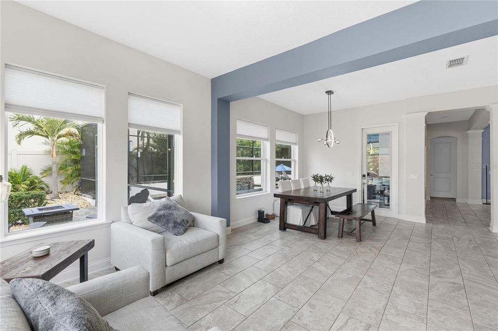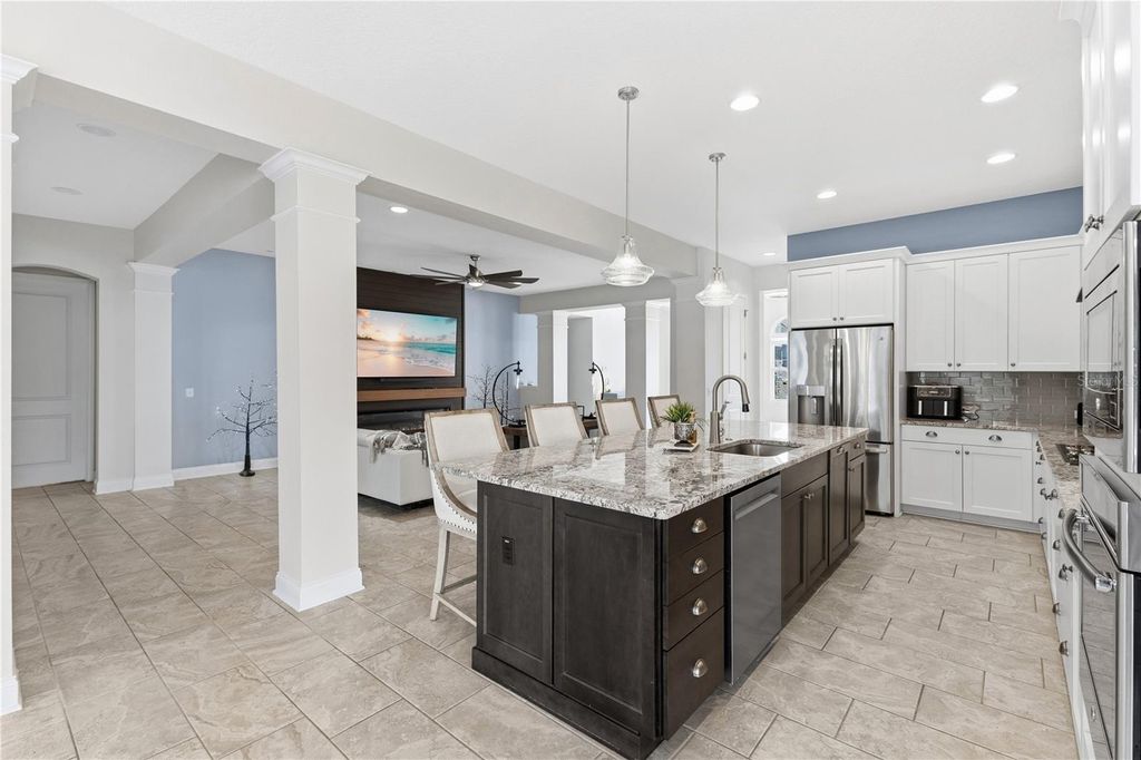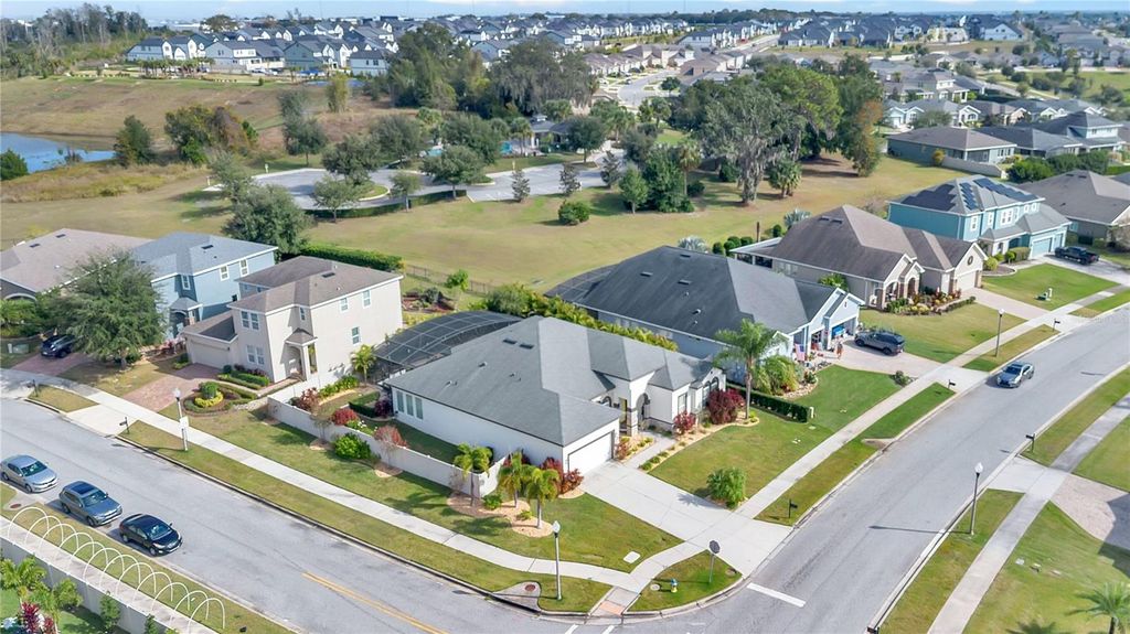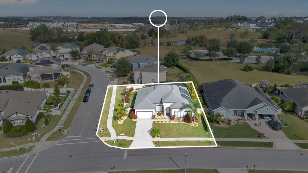 Exceptional one story pool home, perfectly situated on an oversized corner lot with views of Johns Lake. Thoughtfully designed open floor plan creates comfortable spaces for family lifestyle. Soaring ceilings and abundant natural light throughout. The elegant living room features a built-in fireplace, creating a warm and inviting atmosphere with tropical views of the pool lanai. The gourmet kitchen is a chef's dream, equipped with granite countertops, stainless steel appliances, and ample cabinetry. The expansive primary bedroom includes a luxurious ensuite bathroom with a super shower, double sinks, granite counters, and a spacious walk-in closet. The versatile bonus retreat area includes a 2nd bathroom and two additional bedrooms, offering a private area for family and guests. The outdoor space is truly the highlight, with a magnificent solar heated pool and outdoor patio. The home is conveniently located near shopping, dining, major highways, and top-rated schools. This home truly combines comfort, style, and convenience!