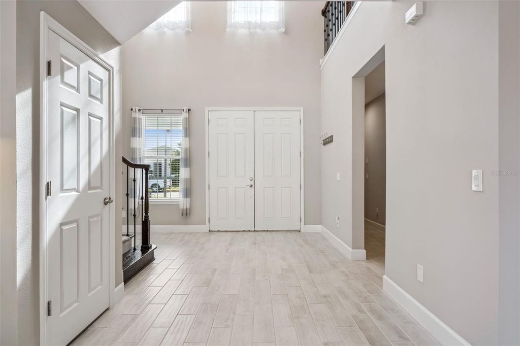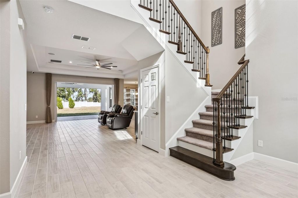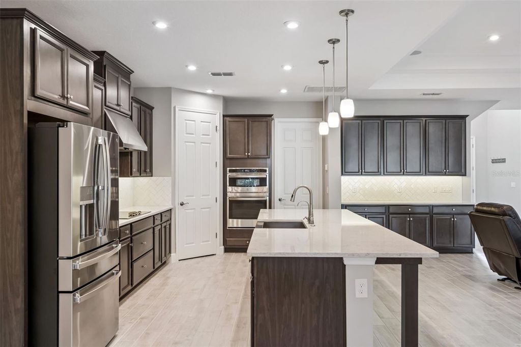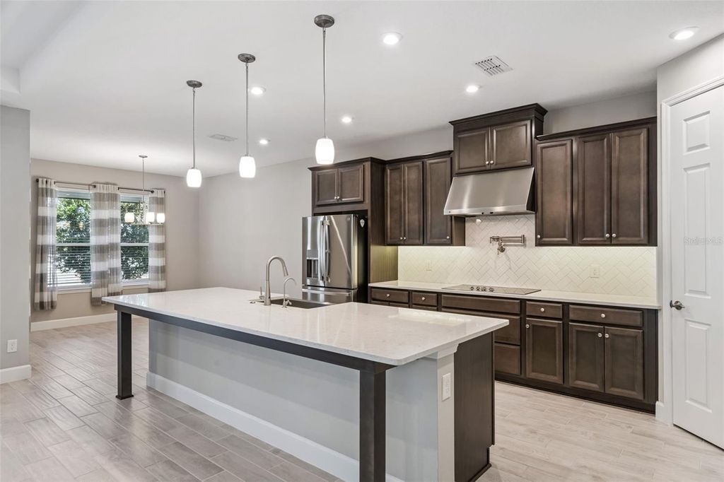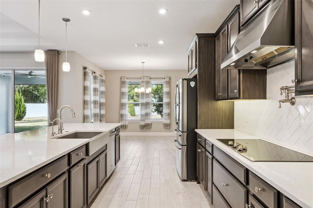 Welcome to this stunning two-story Tortola floor plan by Taylor Morrison, ideally located in the gated community of Lakeview Preserve in Winter Garden. Perfectly positioned on an oversized 75-foot-wide corner homesite with no rear neighbors, this home offers exceptional privacy, beautiful rear views, and a welcoming front porch that sets the tone from the moment you arrive. The elegant double-door entry opens to a dramatic two-story foyer featuring porcelain tile flooring and a staircase accented with open spindles and upgraded iron balusters. Throughout both the first and second floors, 9-foot ceilings and 8-foot doors enhance the home's open, airy feel and upscale architectural presence. This thoughtfully designed residence offers five bedrooms and four-and-a-half baths, including two private ensuite bedrooms, making it ideal for multigenerational living or hosting guests with comfort and privacy. The spacious family room impresses with a double tray ceiling, surround sound system, additional LED lighting, ceiling fans, and blinds, thoughtful upgrades that make this home truly move-in ready. Designed for those who love to cook and entertain, the gourmet kitchen is a showstopper, featuring rich dark wood-tone cabinetry beautifully contrasted by quartz countertops and a striking backsplash. Stainless steel appliances, a cooktop with pot filler, farmhouse sink, and an elegant island with three pendant lights complete the space. Abundant additional cabinetry and counter space provide excellent everyday functionality while serving perfectly as a buffet or servery for holiday gatherings and special occasions. Disappearing sliding glass doors open to the extended screened-in lanai, seamlessly blending indoor and outdoor living and creating the ideal setting to enjoy Florida's lifestyle year-round. In addition to the primary suite, the first floor offers a private ensuite bedroom, thoughtfully designed with its own full bath which is ideal for guests, extended family, multigenerational living, or a luxurious home office suite. The large primary suite, conveniently located on the first floor, features a tray ceiling and a spa-inspired bath with quartz countertops, framed mirrors, and a beautifully tiled shower with a built-in bench. Additional highlights include a built-in drop zone, a large laundry room with double sinks, and a three-car garage configuration consisting of a two-car garage plus a separate single-car garage, offering an abundance of garage parking and generous driveway space. Upstairs, the secondary bedrooms provide privacy, comfort, and versatility, including a second ensuite bedroom, making this home exceptionally well-suited for guests or family. Completing the upper level is a spacious game room or additional family room, offering flexible living space ideal for movie nights, a play area, or a casual retreat. Residents of Lakeview Preserve enjoy outstanding community amenities including a resort-style pool, park, playground, fitness center, and walking trails. This exceptional home delivers elegant design, thoughtful upgrades, flexible living spaces, and a beautiful setting within one of Winter Garden's most desirable gated communities. WELCOME HOME!