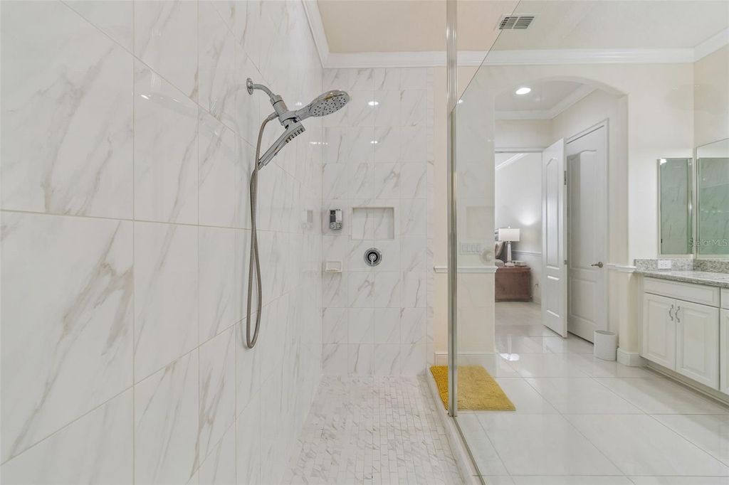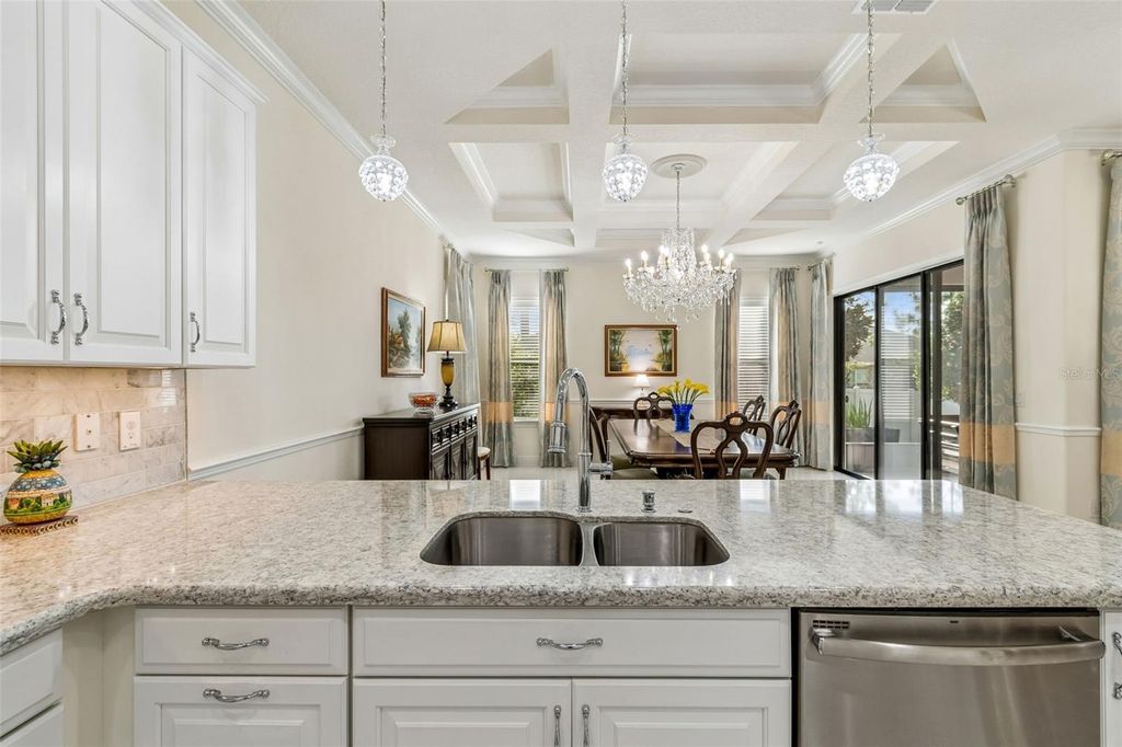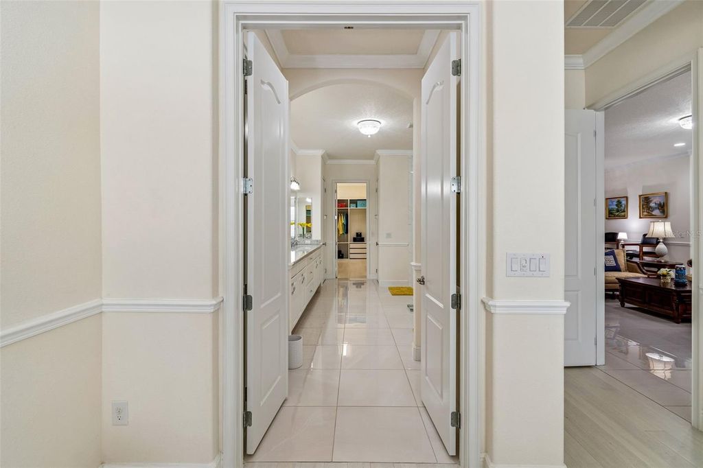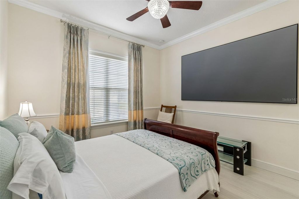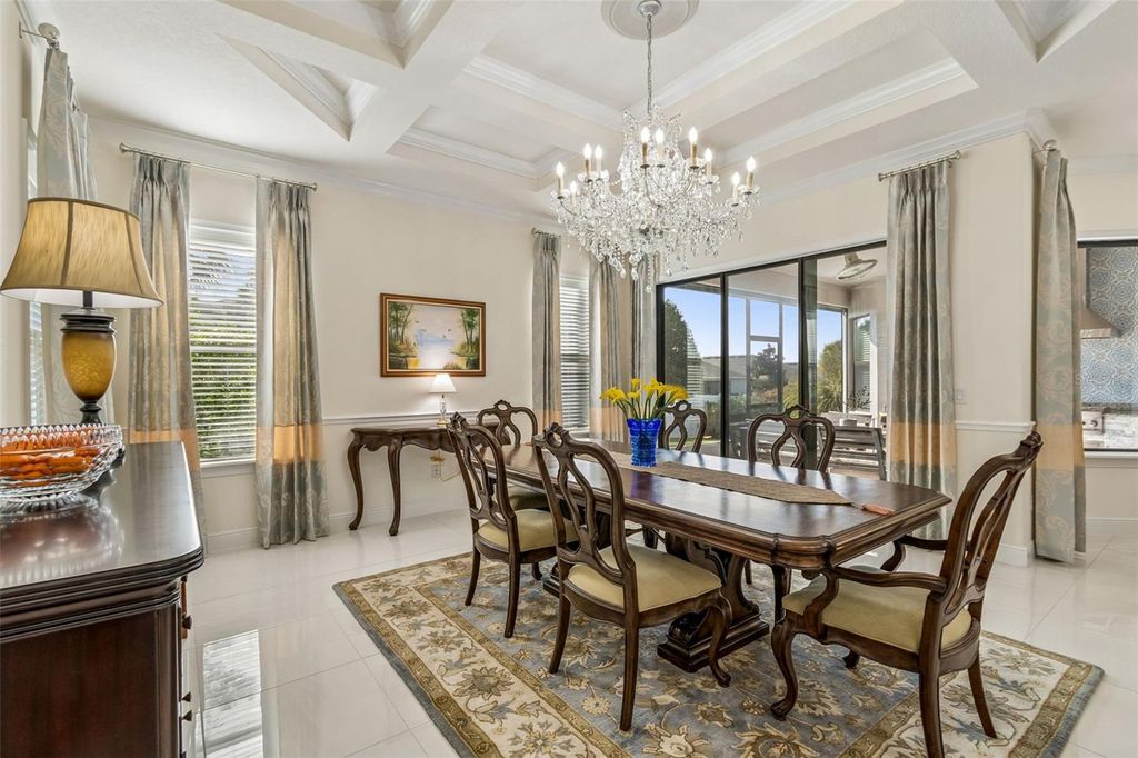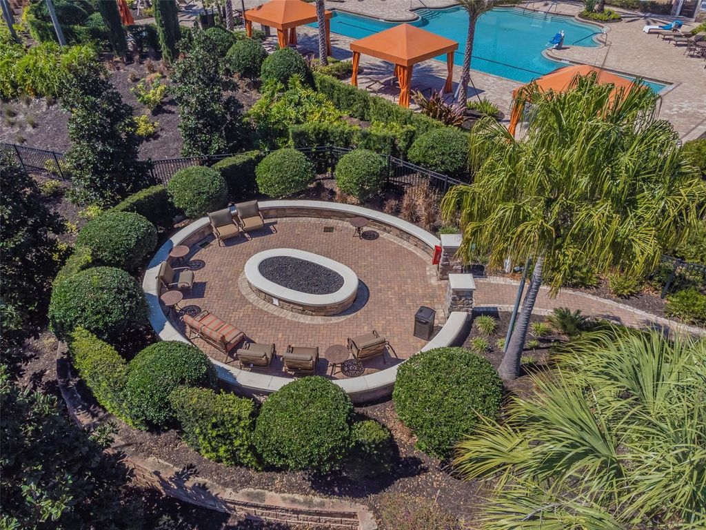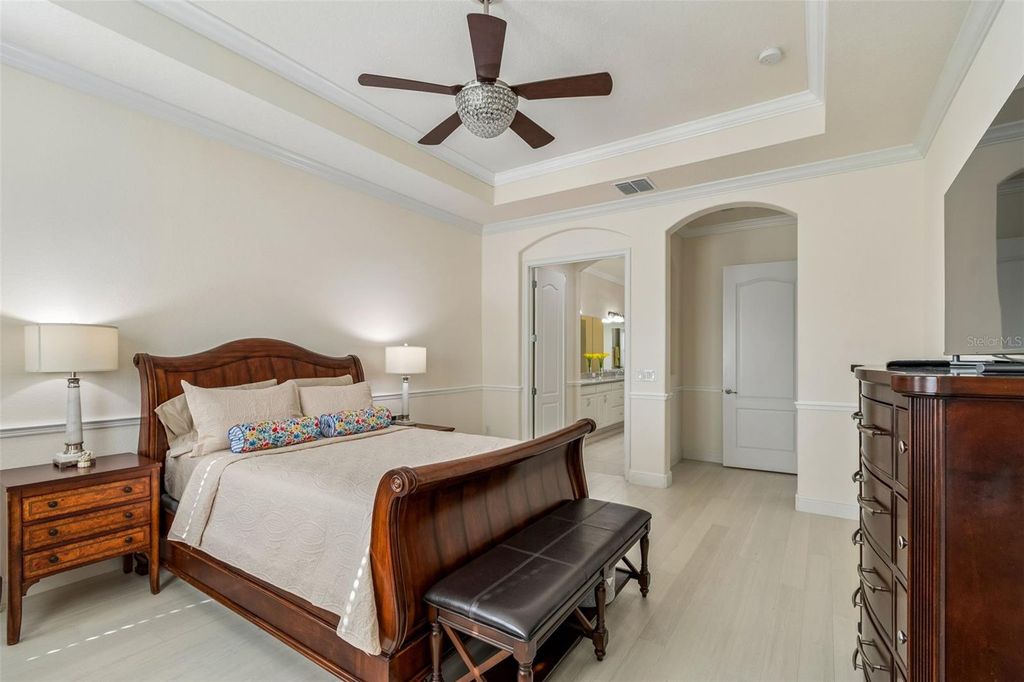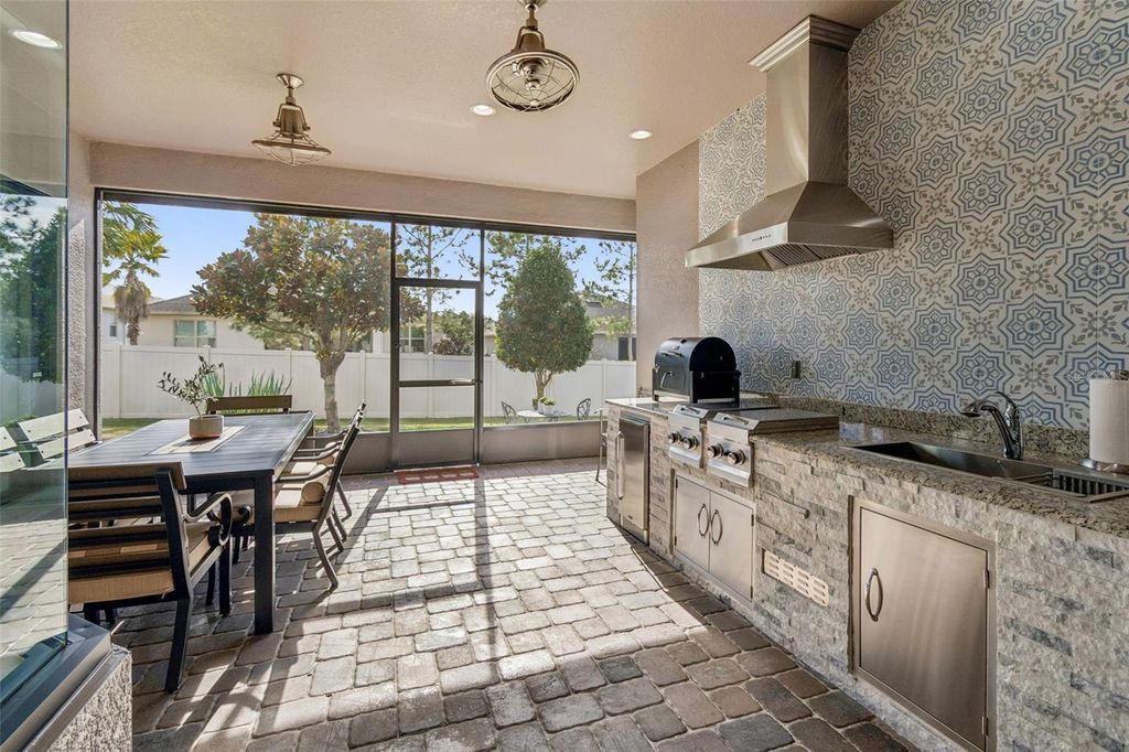 Prepare to be captivated by this meticulously upgraded masterpiece, where sophisticated luxury meets modern comfort at every turn. From the moment you arrive, the freshly painted exterior (2022), extended stonework, and charming gated courtyard set a tone of elegance that continues throughout the home. Inside, you are greeted by architectural grandeur featuring 8-foot doors, soaring coffered and tray ceilings, and an upgraded trim package with crown and chair molding that frames every room perfectly. The seamless flow of 20x20 porcelain tile leads you past a private office with elegant glass doors into the heart of the home: a gourmet kitchen boasting quartz countertops and an enhanced backsplash. No detail has been overlooked, from the sustainable bamboo floors in the bedrooms to the guest suite's private ensuite with a walk-in shower. Your master retreat is a sanctuary of its own, featuring a sun-drenched bay window, a massive closet with custom built-ins, and a luxurious super shower. The mechanical integrity of the home is just as impressive as its design, anchored by a brand-new HVAC (2025) with a lifetime warranty, a tankless water heater, and a whole-house water softener system for ultimate peace of mind. Functional luxury continues in the 3-car tandem garage, which features high-durability epoxy floors and insulated doors, while a built-in Wi-Fi extender ensures seamless connectivity throughout the property. Beyond the interior, your private tropical oasis awaits; a screened lanai with a privacy screen opens to a lush landscape of palm and fruit trees. Whether you're hosting at the upgraded outdoor kitchen or enjoying the added security of integrated floodlights and gutters, every inch of this home has been curated for a lifestyle of unparalleled quality. Life at Esplanade at Highland Ranch extends far beyond your front door, offering a resort-style experience centered around a well-appointed clubhouse designed for an active and social lifestyle. Residents enjoy access to a state-of-the-art fitness center, a multi-purpose room for gatherings, and dedicated spaces for cards and billiards. For relaxation, indulge in the on-site treatment room for massages or grab a morning cup of joe at the coffee bar. The outdoor amenities are equally spectacular, featuring a resort-style pool and spa, a resistance pool, and a cozy fire pit for evening conversations. Competitive spirits will thrive on the four pickleball courts, two bocce ball courts, and the tennis court, while those seeking serenity can explore the picturesque walking and biking trails, event lawn, and expansive park spaces that surround this premier active adult community.