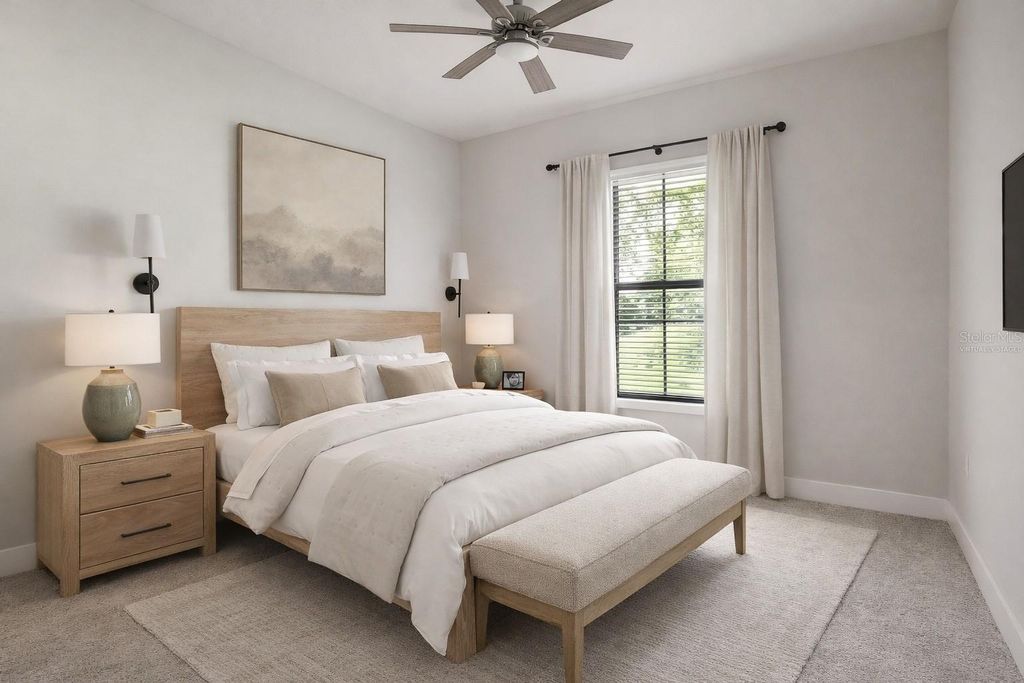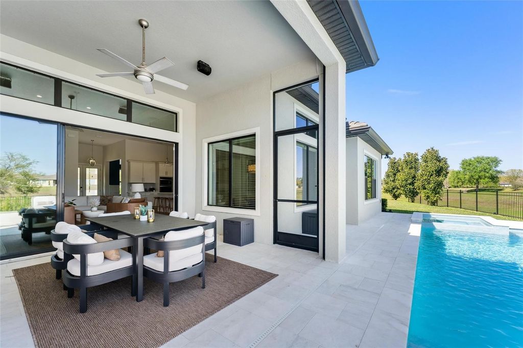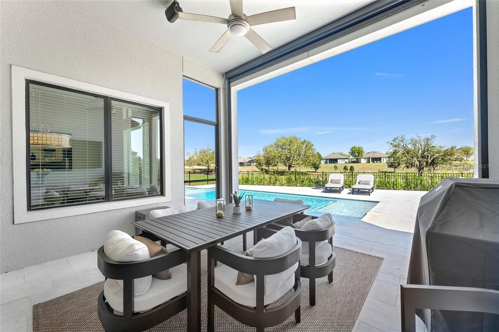 Welcome to this beautifully maintained home in the RedTail Golf Community of Sorrento, perfectly positioned on the golf course with no neighbors on one side, offering added privacy and peaceful green space views. This home features a comfortable and functional triple-split floor plan with four bedrooms, three full bathrooms, and a three-car side-entry garage, providing privacy and convenience with a full bathroom located within each separate bedroom area. As you enter, you are welcomed by high ceilings throughout, including 12-foot ceilings and a 14-foot tray ceiling in the main living area, creating a light, open, and airy feel. At the front of the home is a warm and inviting sitting room, currently styled with a bar, along with a separate dining space that feels both welcoming and versatile. The main living area brings together the family room, kitchen, and a spacious dinette in a seamless open-concept layout that overlooks the pool and golf course. This central space feels bright and comfortable, ideal for both everyday living and entertaining. The great room features an electric fireplace, custom built-ins, and sliding glass doors that fully open with transom windows above that have their own motorized shades, filling the space with natural light and highlighting the view. The kitchen offers 42-inch solid wood cabinets with soft-close features and custom shelving, a large island with pendant lighting, a walk-in pantry, and a full suite of stainless-steel appliances, including the refrigerator, cooktop, wall oven, microwave, dishwasher, and a vented hood to the exterior. The overall design is warm, neutral, and easy to personalize to any style. The primary suite is privately located and offers a calm and relaxing retreat, complete with a tray ceiling, spacious layout, and a large ensuite bathroom featuring a walk-in shower and separate soaking tub. On the opposite side of the home, you will find three additional bedrooms and two full bathrooms. One of the bedrooms overlooks the pool and golf course and would make a perfect office or flex space, offering both natural light and a peaceful setting. The outdoor space is designed for true Florida living, with a travertine deck, saltwater pool, and heated spa. The extended covered patio creates a comfortable outdoor living area and includes a motorized retractable screen. The backyard is fully fenced with black iron fencing and is pre-plumbed for a future outdoor kitchen, making it ideal for both relaxing and entertaining. Additional features include neutral, wood-look tile flooring throughout the main living areas, offering durability while blending seamlessly with any color palette or design style. The exterior features a tile roof, stone accents, and a brick paver driveway. The home is also equipped with a prewired Generac generator with an owned propane tank, a full security camera system, two Tesla chargers, an invisible fence system, surround sound wiring, and in-wall TV wiring in two bedrooms. The laundry room includes the washer and dryer, a utility sink, and built-in cabinetry for added convenience. The RedTail community offers a guard-gated entry along with amenities including a community pool, clubhouse with restaurant & bar, pro shop, tennis courts, fitness center, scenic surroundings with green space, sidewalks, and natural Florida landscapes and trees. Conveniently located with easy access to the 429 Expressway, Orlando International Airport, area attractions, and beaches.