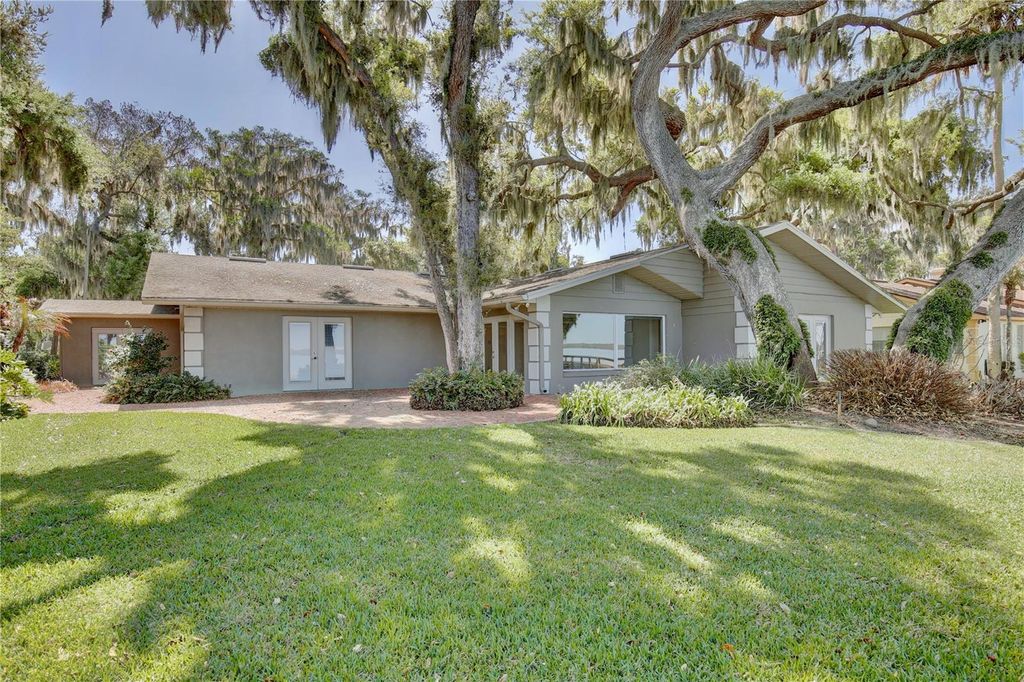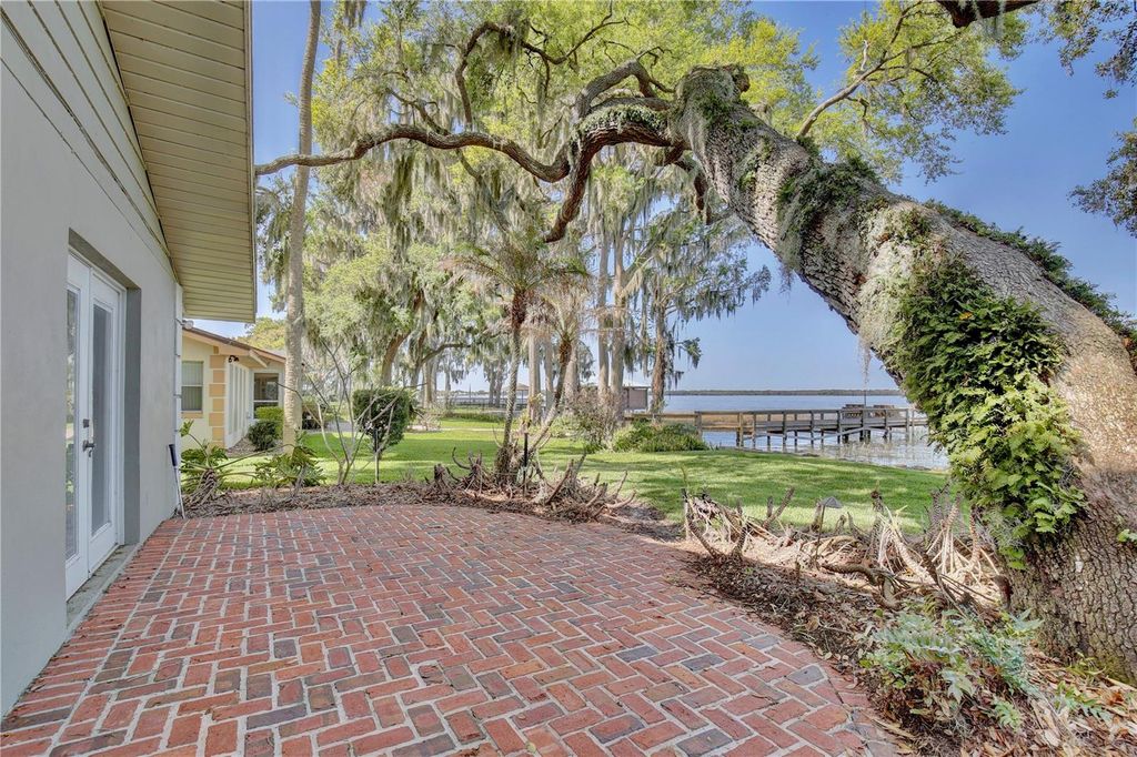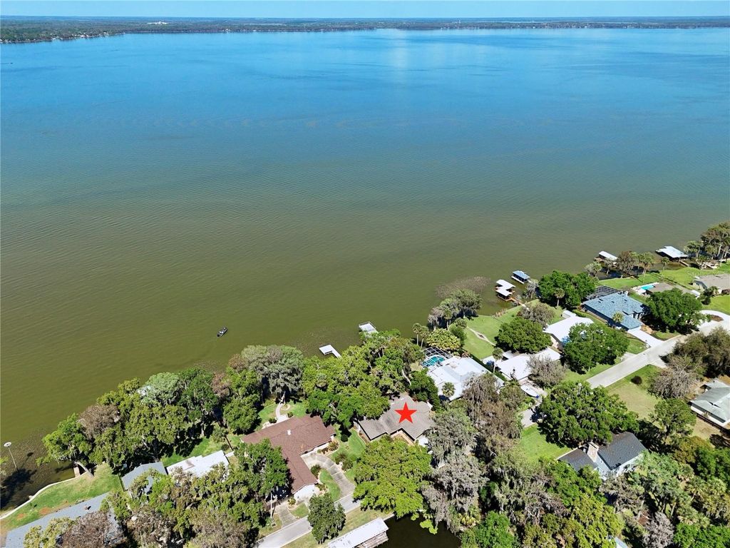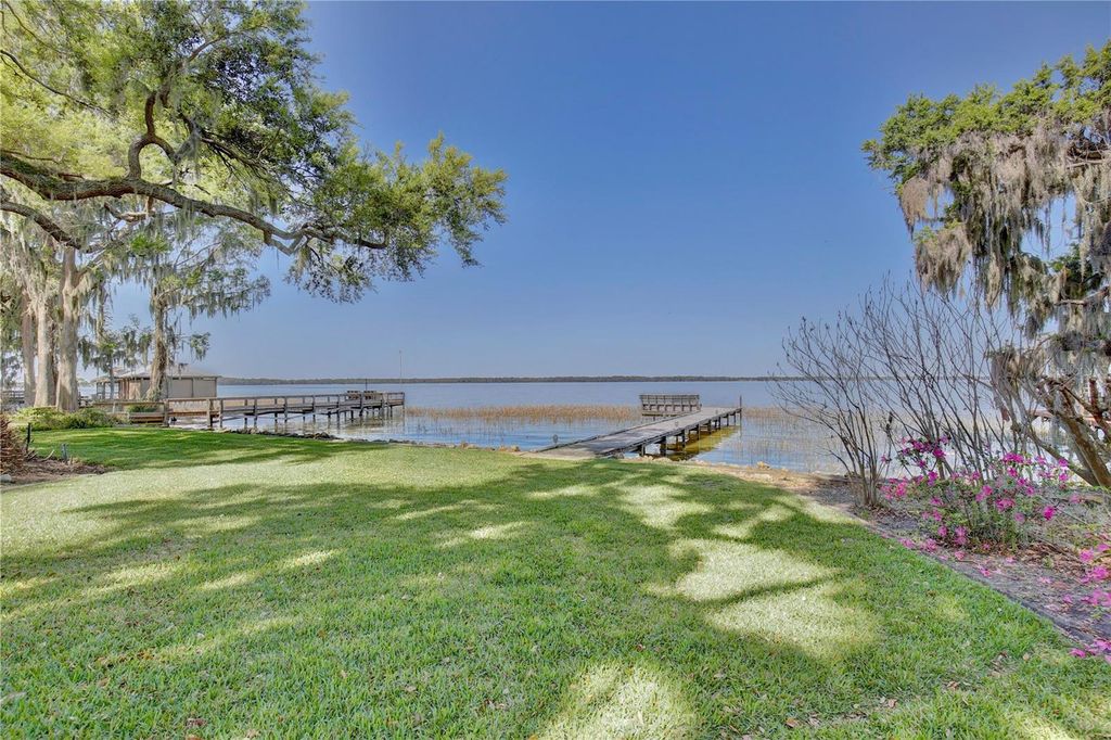Welcome to your lakeside sanctuary where elegance and tranquility meet! This stunning four bedroom, three bathroom waterfront house beckons with its private dock on the shores of Lake Eustis, offering a lifestyle of peaceful luxury. As you approach this remarkable home, you'll be greeted by a two car garage and paver pathway leading to a welcoming covered front porch, all framed by lush landscaping and beautiful old oak trees. The interior has neutral tones and bathed in natural light, highlighting tile floors, elegant trim work, and crown molding that adds to the charm. Entertain with ease in the living room, where a cozy fireplace is framed by custom built-ins providing stylish storage for your entertainment center. The family room, too, boasts an entertainment center flanked by custom cabinetry. Revel in the stunning views of the water that form the backdrop of the home's main spaces. The dining room has exquisite wallpaper, a radiant chandelier, and French doors that open to the side of the home and to a second outdoor patio, perfect for al fresco dining. The generously sized kitchen is a chef's dream with its abundant cabinet space, under-cabinet lighting, built in double ovens, custom fridge panels, and a custom range hood. Enjoy morning coffee in the breakfast nook adorned with chic bespoke wallpaper and a chandelier and French doors offering a tranquil lake view. The primary suite is a retreat with lake views through French doors, a walk in closet, and an en suite bath featuring a glass door shower. An adjoining bedroom, which could serve as a home office, showcases distinguished wood paneling. Two additional bedrooms offer versatility and comfort, one with French doors opening to the lake. One guest bathroom offers ample counter and cabinet space along with retro chic tile, wallpaper, and a tub/shower combo. The second guest bathroom provides a glass door shower and elegant touches including sconces and custom wallpaper. Outdoor living is at its finest with a brick patio overlooking Lake Eustis, a sprawling green lawn, and your own private dock. The property also has canal access across the street with a seawall. A perfect spot for fishing. It also provides extra parking area. This amazing location offers quick access to 441, downtown Tavares, and the charming boutiques of downtown Mount Dora and the 429 for easy access to the Orlando area. Don't miss the chance to experience this home's magnificence firsthand. View the 3D tour and schedule a showing to discover your dream home on the water!