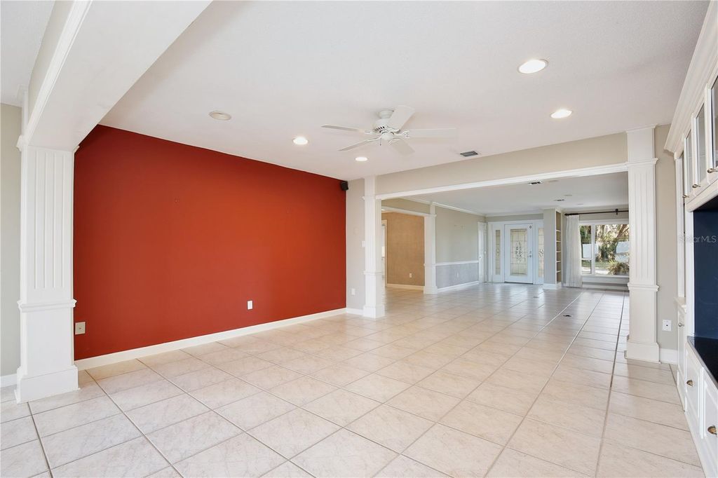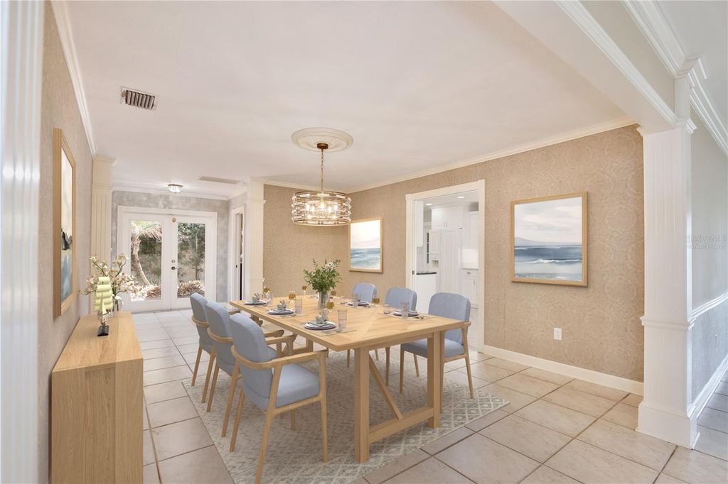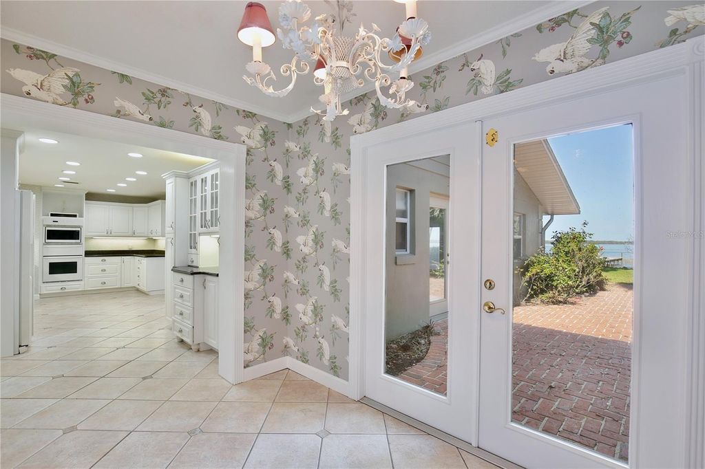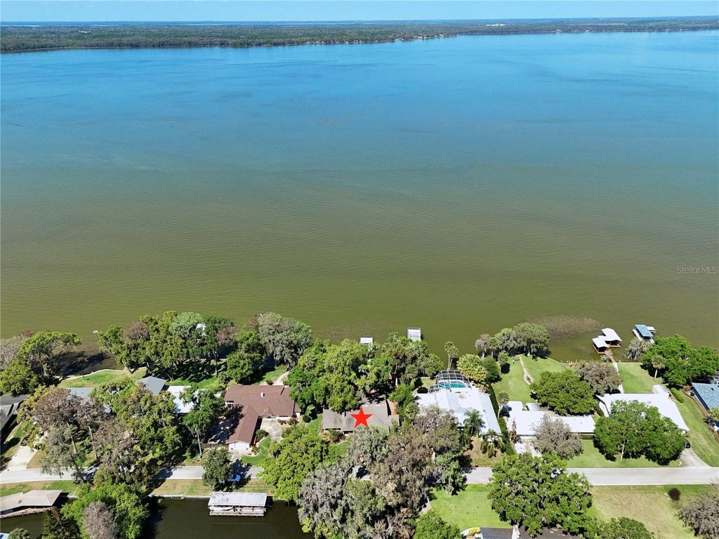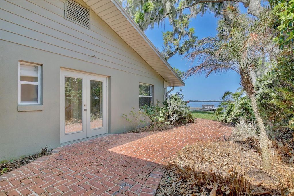 Welcome to your lakeside sanctuary where elegance and tranquility meet! This stunning four bedroom, three bathroom waterfront house beckons with its private dock on the shores of Lake Eustis, offering a lifestyle of peaceful luxury. As you approach this remarkable home, you'll be greeted by a two car garage and paver pathway leading to a welcoming covered front porch, all framed by lush landscaping and beautiful old oak trees. The interior has neutral tones and bathed in natural light, highlighting tile floors, elegant trim work, and crown molding that adds to the charm. Entertain with ease in the living room, where a cozy fireplace is framed by custom built-ins providing stylish storage for your entertainment center. The family room, too, boasts an entertainment center flanked by custom cabinetry. Revel in the stunning views of the water that form the backdrop of the home's main spaces. The dining room has exquisite wallpaper, a radiant chandelier, and French doors that open to the side of the home and to a second outdoor patio, perfect for al fresco dining. The generously sized kitchen is a chef's dream with its abundant cabinet space, under-cabinet lighting, built in double ovens, custom fridge panels, and a custom range hood. Enjoy morning coffee in the breakfast nook adorned with chic bespoke wallpaper and a chandelier and French doors offering a tranquil lake view. The primary suite is a retreat with lake views through French doors, a walk in closet, and an en suite bath featuring a glass door shower. An adjoining bedroom, which could serve as a home office, showcases distinguished wood paneling. Two additional bedrooms offer versatility and comfort, one with French doors opening to the lake. One guest bathroom offers ample counter and cabinet space along with retro chic tile, wallpaper, and a tub/shower combo. The second guest bathroom provides a glass door shower and elegant touches including sconces and custom wallpaper. Outdoor living is at its finest with a brick patio overlooking Lake Eustis, a sprawling green lawn, and your own private dock. The property also has canal access across the street with a seawall. A perfect spot for fishing. It also provides extra parking area. This amazing location offers quick access to 441, downtown Tavares, and the charming boutiques of downtown Mount Dora and the 429 for easy access to the Orlando area. Don't miss the chance to experience this home's magnificence firsthand. View the 3D tour and schedule a showing to discover your dream home on the water!