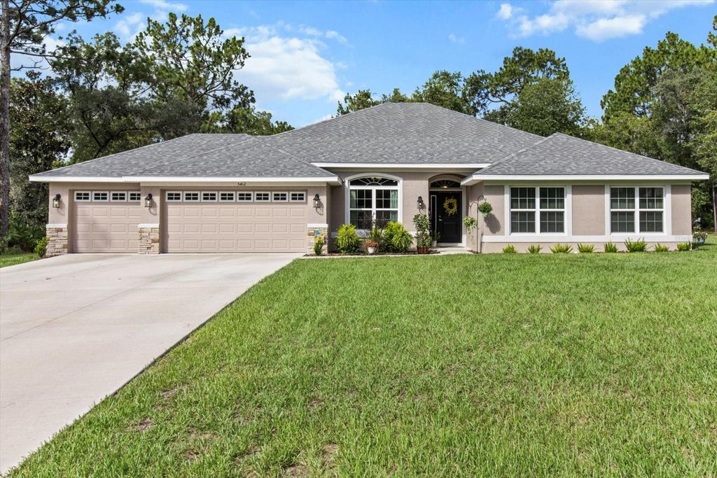 Short Sale. Better Than New in Pine Ridge - A Place You'll Love to Call Home! Step into this stunning 4 bedroom, 3 bathroom, 3 car garage home, thoughtfully designed and beautifully upgraded for effortless living. Cook and gather in the gourmet kitchen with sleek stainless luxury appliances, gleaming stone countertops, and timeless white cabinetry that brighten every meal. Feel the difference of elegant wood-look ceramic tile in wet areas, soaring tray ceilings, and graceful crown molding that add character and charm. The spacious owner's suite is your personal retreat, complete with a spa-inspired bath featuring a relaxing garden tub and a walk-in shower. Step outside to your peaceful 21x10 covered patio, where you can unwind and take in the natural green space beyond. The home's curb appeal shines with tasteful stone exterior accents and stylish garage doors that welcome you home with warmth and light. All nestled in a friendly equestrian community with scenic riding trails "” plus you'll be just moments from top medical facilities, shopping, and world-class outdoor adventures: kayaking winding rivers, fishing quiet coves, scalloping in crystal-clear waters, and so much more. Discover comfort, style, and the Florida lifestyle you've been dreaming of!