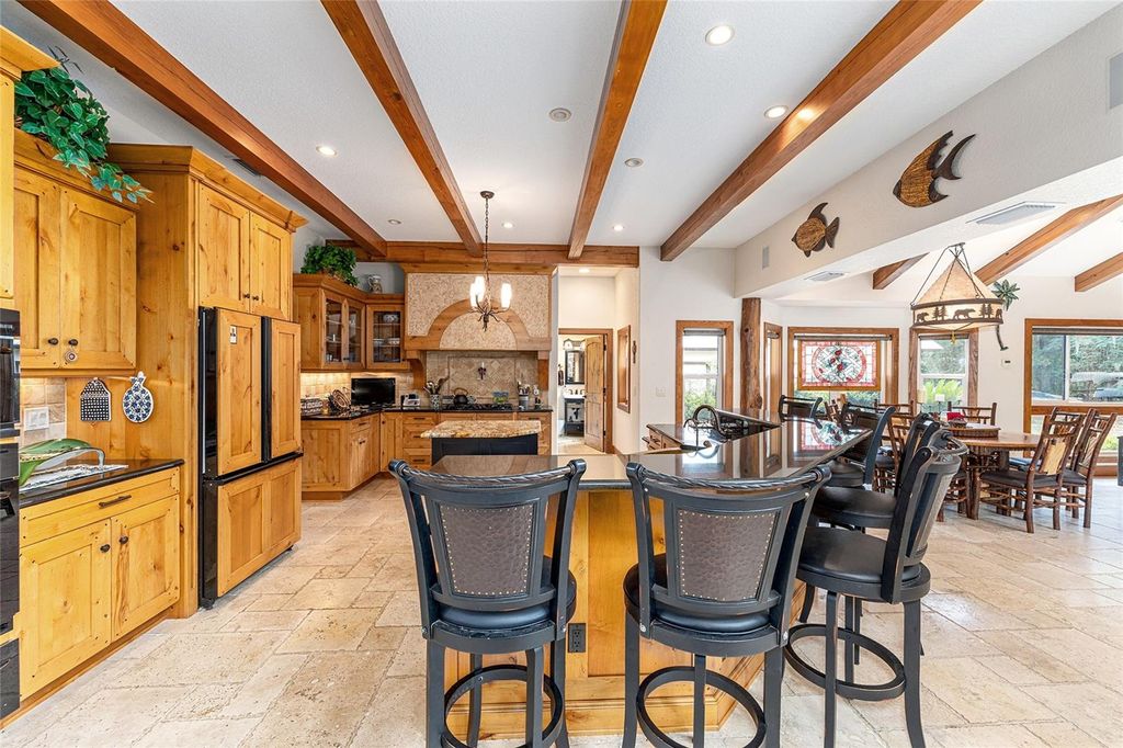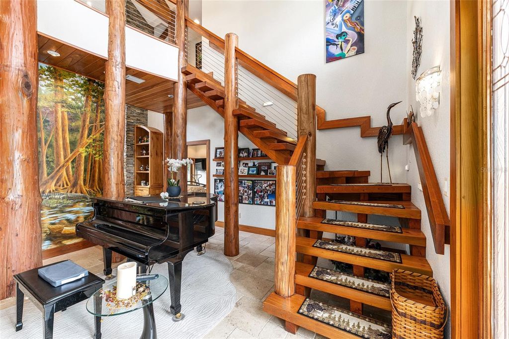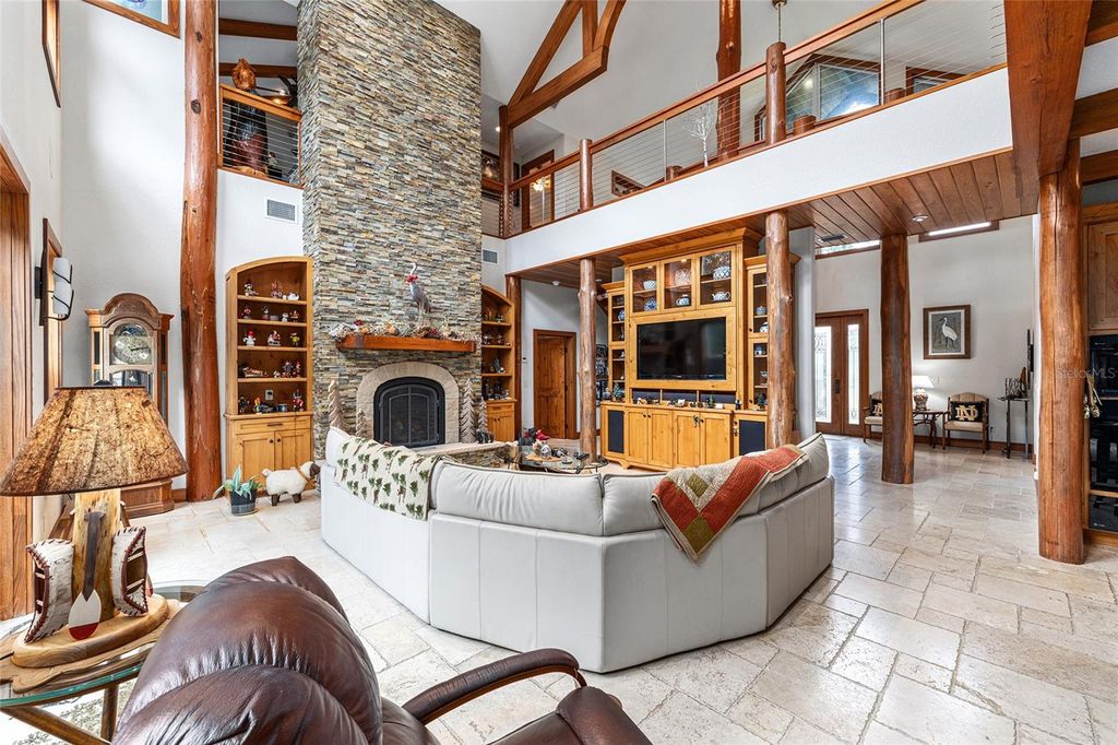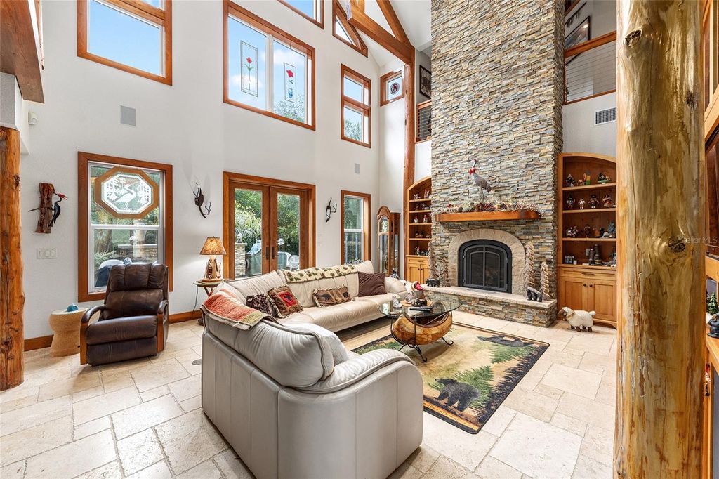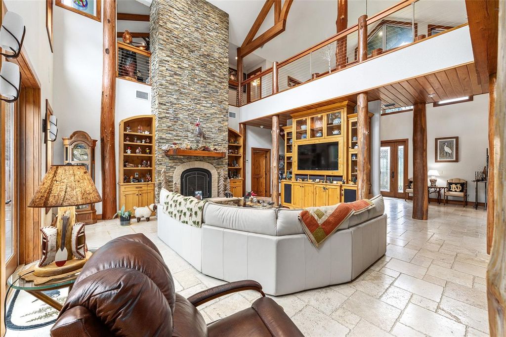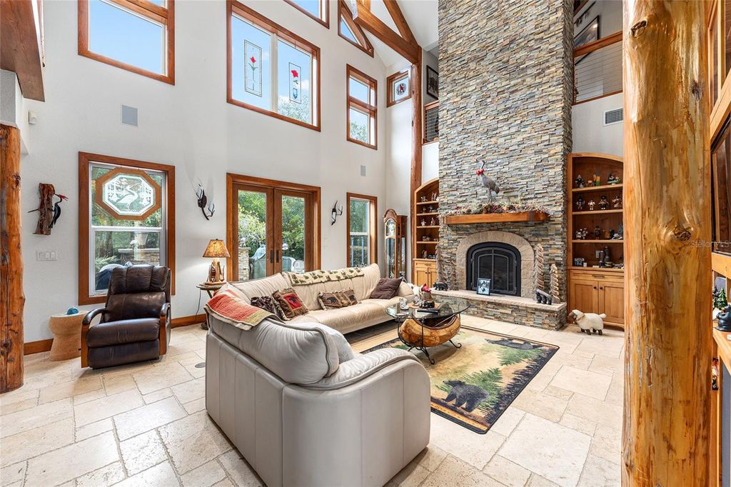 Assumable (approx $450k) VA loan at 2.25%... Welcome to the Manor House at Lake Kerr - a truly one-of-a-kind custom estate, artfully designed with exceptional craftsmanship, high-end finishes, and timeless architectural detail. From the grand entrance framed by dramatic cypress pillars to the intricate millwork and travertine flooring throughout, every element exudes quality and elegance. The main residence features 3 bedrooms"”potentially 4"”and 4.5 bathrooms. The expansive first-floor primary suite offers French doors opening to the rear terrace, a private sitting room with fireplace and dry bar with refrigerator, a spa-inspired bathroom with vanity area, and a generous dressing room. Upstairs, all bedrooms enjoy French doors that open to covered wood balconies. One spacious bedroom includes an ensuite bath, while another features an additional sleeping loft"”ideal for extra guests. A charming upstairs sitting room with its own fireplace connects to a Jack and Jill bathroom and could easily be converted into a fourth bedroom. The formal entry is nothing short of spectacular, where soaring cypress log pillars and a hand-painted mural make a memorable first impression. The great room features cathedral ceilings, a dramatic two-story dry-laid stone fireplace, and custom built-ins. An open-concept kitchen anchors the living space with a center island, breakfast bar, and a large butler's pantry"”equipped with two additional refrigerators and ample storage. Just off the kitchen, a sunken bar opens seamlessly to the outdoor entertainment terrace, complete with built-in grill, fire pit, and an electrical hookup for a future spa. The three-bay tandem garage is ideal for storing watercraft, ATVs, or other recreational gear. Above the garage, a versatile bunkhouse includes a full bath and kitchenette"”perfect for a gym, home theater, or guest suite. Set on 1.27 acres with panoramic views of Little Lake Kerr, (the main home recently appraised in July for $1m) the estate also includes two additional parcels: A 0.17-acre lot (parcel ID 10829-001-02) with approved plans for a guest house A 0.22-acre canal-front lot (parcel ID 10753-001-53)featuring a 2012 two-bedroom, two-bath manufactured home"”ready for interior updates and boathouse improvements. The boat ramp is situated next to the property on 242nd Ave. This exceptional property is a rare opportunity to own a refined lakeside retreat with room to grow, entertain, and enjoy the very best of Florida living.