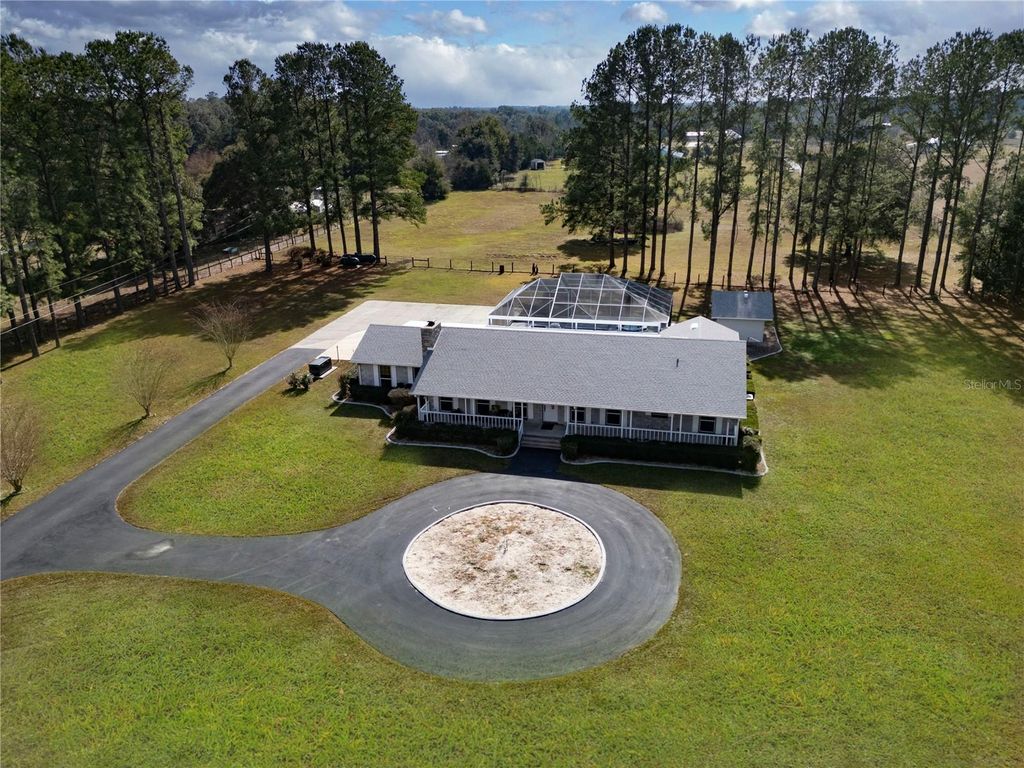 BRAND NEW ROOF!!! Beyond a stately, custom-designed gated entrance, a tree lined drive leads you into a property that feels like its own private world. Here, on 5.5 acres of high, dry pasture just outside the charming town of Williston, sits an immaculately maintained home built with the coveted strength and beauty of Ocala block. This is more than a house"”it's a sanctuary where every detail has been thoughtfully crafted. From the moment you step through the front door, you're welcomed by soaring ceilings and a light-filled open living space, anchored by a massive gas-fueled stone fireplace"”a striking centerpiece that's as inviting on cool evenings as it is stunning year-round. Framed by floor-to-ceiling windows that bring the outdoors in. Plantation shutters throughout offer both elegance and privacy. The kitchen is a culinary dream"”equipped with a gas range, wall-mounted oven, double sinks, expansive counters, a large island with a breakfast bar that invites slow mornings with coffee or lively gatherings with friends. The primary suite is a retreat unto itself"”massive in scale, yet intimate in feeling"”with direct access to the back porch and pool. The en suite bath offers a spa-like escape, featuring a large walk-in shower and a separate soaker tub perfect for long, quiet evenings. Step outside and the resort-like amenities unfold: an 8-foot-deep saltwater pool glistens in the Florida sun, paired with a heated spa for year-round enjoyment. A large covered back porch provides the perfect setting for entertaining, while a convenient pool bath makes hosting effortless. The land is as impressive as the home"”fully fenced and cross-fenced, with well-maintained pasture ideal for horses. The property's elevated position keeps it high and dry, and a whole-house generator with years' worth of fuel storage offers unmatched peace of mind. Despite its private, rural feel, the location couldn't be more ideal: just 19 miles to Gainesville, 23 miles to Ocala, and 45 miles to Cedar Key and the Gulf of Mexico. Here, you'll find a rare blend of seclusion and convenience. Pass through the gates, and you'll understand"”this is more than property. It's a legacy, ready for its next chapter.