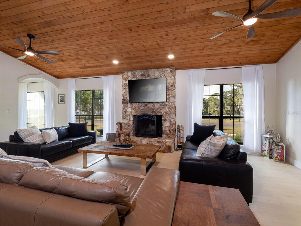 Located just 20 minutes from the World Equestrian Center, this exceptional 20-acre horse farm offers top-tier equestrian amenities paired with beautiful residential living. The property features a 9-stall concrete block center-aisle barn with 12x12 stalls, including a foaling stall, premium Stable Comfort mats, fans, and a fly spray system. Additional barn features include a hot/cold water wash stall, bathroom, tack and feed rooms, and a eurociser. A separate stallion barn offers two large stalls along with a three-bay workshop for equipment storage and added functionality. Expansive pastures with freshly painted fencing and landscaped grounds surround the farm, creating a serene and scenic setting. The custom-built, block 3-bedroom, 2-bathroom home sits at the heart of the property and features a fully renovated 2026 kitchen with all-new appliances, new flooring throughout the home, and updated modern LED lighting. The open floor plan offers soaring ceilings and a spacious great room with a cozy fireplace, while oversized windows provide panoramic pasture views and abundant natural light. A charming 1-bedroom, 1-bathroom block guest house completes the property, offering a kitchenette, laundry room, and large closet"”ideal for guests or farm staff. This farm presents a rare opportunity to enjoy refined rural living with professional-grade equestrian facilities in a prime Central Florida location.