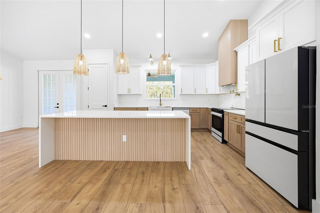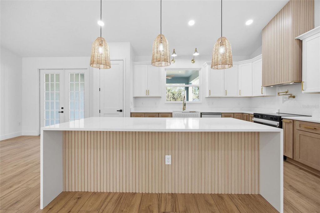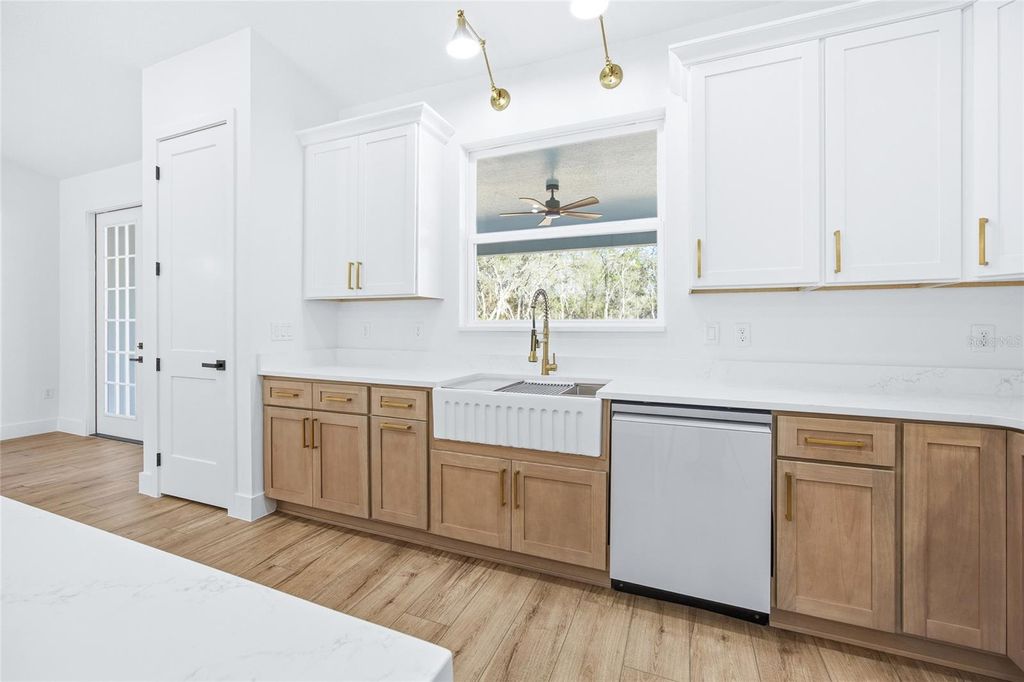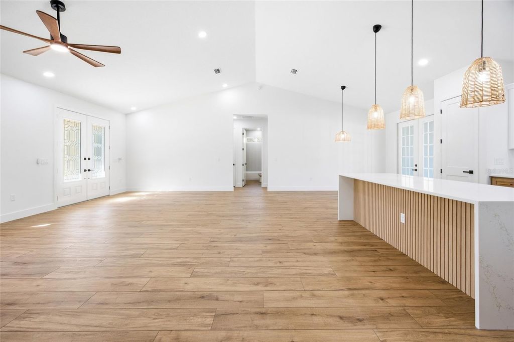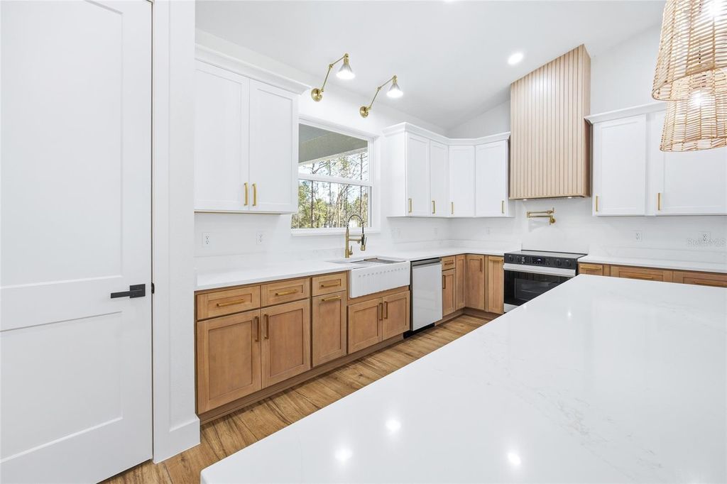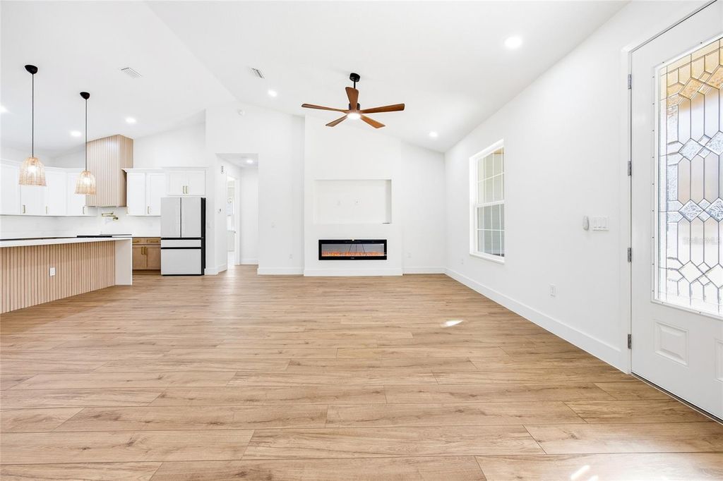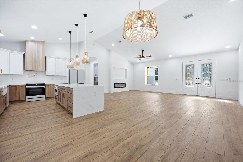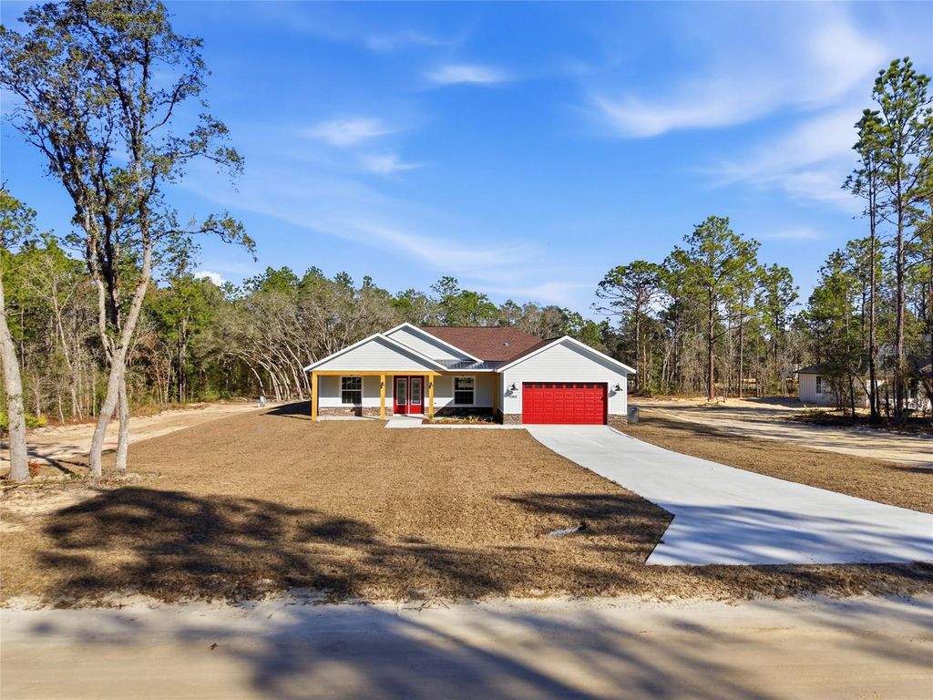 One or more photo(s) has been virtually staged. Under Construction. Welcome to this beautifully crafted farm-style new construction home, located in the heart of Rolling Hills. Situated on 1.10 acres, this 4-bedroom, 2-bath home with a 2-car garage blends modern comfort with classic farmhouse charm. Inside, enjoy high vaulted ceilings, an open-concept layout, waterproof laminate flooring, and a custom electric fireplace that anchors the living space. The kitchen is designed for everyday living and entertaining, featuring quartz countertops, a waterfall island with built-in drawer microwave, farmhouse sink, custom hood with exterior exhaust, pot filler, walk-in pantry, and premium appliances. French doors open to a covered lanai, creating easy indoor-outdoor living, while the large front porch and lanai offer peaceful space to relax. The primary suite includes a tray ceiling, walk-in closet, and a spa-style bath with dual vanities and a walk-in shower with built-in bench and frameless glass. Enjoy quiet country living just minutes from the World Equestrian Center, Rainbow Springs, and I-75. This home offers the perfect balance of space, quality, style, and convenience.