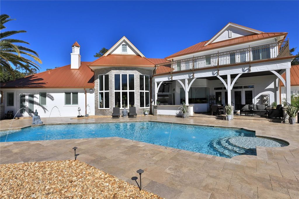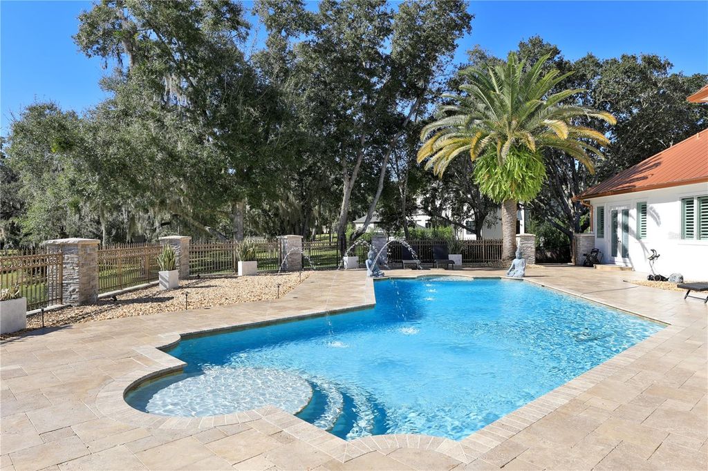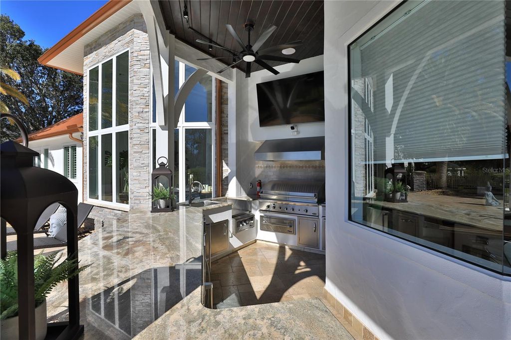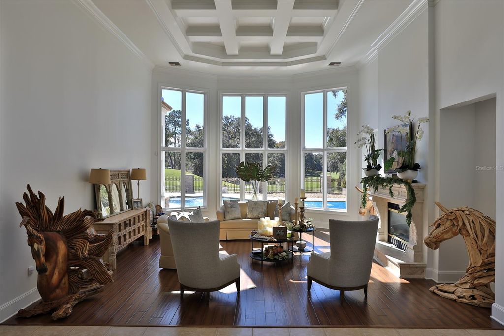 Welcome to a breathtaking estate in the Country Club of Ocala, where timeless architecture, modern elegance, and resort-style living come together in perfect harmony. Nestled along the rolling fairways of a unique, manicured golf-course community, this striking residence commands attention with its copper-toned metal rooflines, stone accents, and grand presence- an estate as beautiful as it is unforgettable. Inside, the home unfolds with soaring ceilings, abundant natural light, and sweeping golf views framed by dramatic floor-to-ceiling windows. The formal living room creates a showstopping first impression with its coffered ceilings, stately fireplace, and wide-open vistas that blur the line between indoors and out. The gourmet kitchen is designed for both beauty and function, featuring rich custom cabinetry, a massive entertaining island, double ovens, and warm gathering spaces that flow effortlessly into the family and dining areas. Every detail speaks to quality craftsmanship and comfort. This exceptional home offers 4 bedrooms and 5.5 baths, plus an office and a media room, ensuring ample space for both relaxation and productivity. A breezeway conveniently connects to the man cave, which includes a full bath and can easily be transformed into a mother-in-law suite, adding versatility to the layout. Step outdoors to your private retreat"”an expansive resort-style pool area surrounded by stone pavers, elegant fencing, and multiple lounging spaces. From sun-drenched patios to an inviting fire pit terrace, the setting offers unmatched views of the manicured greens and mature oaks that define the landscape. Outdoor living is elevated even further with a covered patio, upper-level terrace, and a full outdoor kitchen, ideal for hosting unforgettable gatherings. Set within one of the area's most desirable golf communities, this estate captures the essence of refined living"”grand, welcoming, and effortlessly impressive. From sunrise over the fairways to evenings by the pool, this home offers a lifestyle of privacy, elegance, and year-round enjoyment.