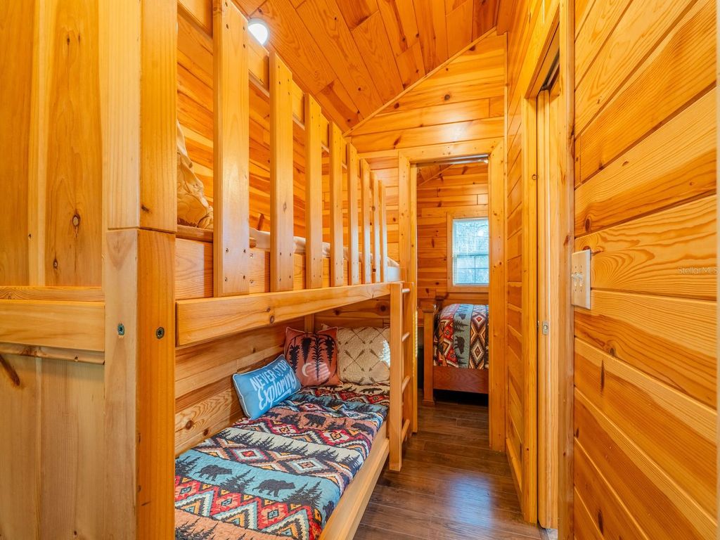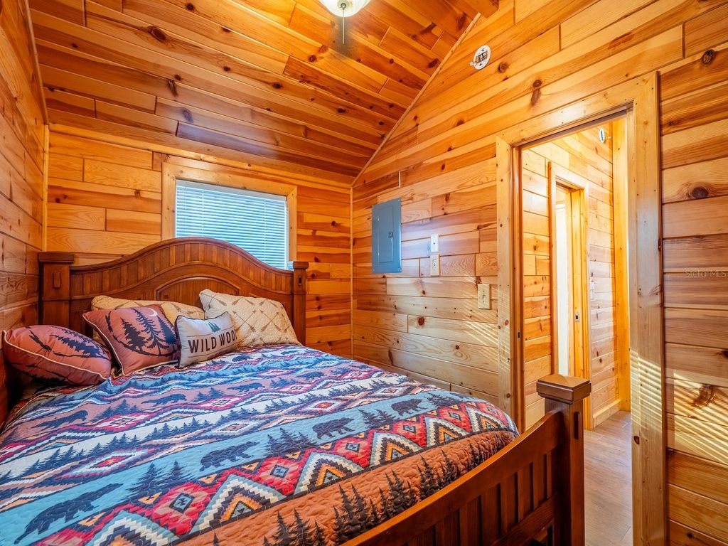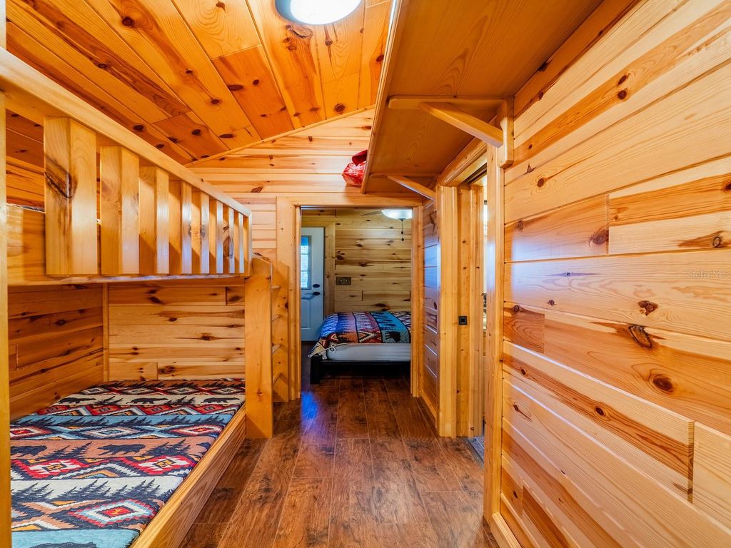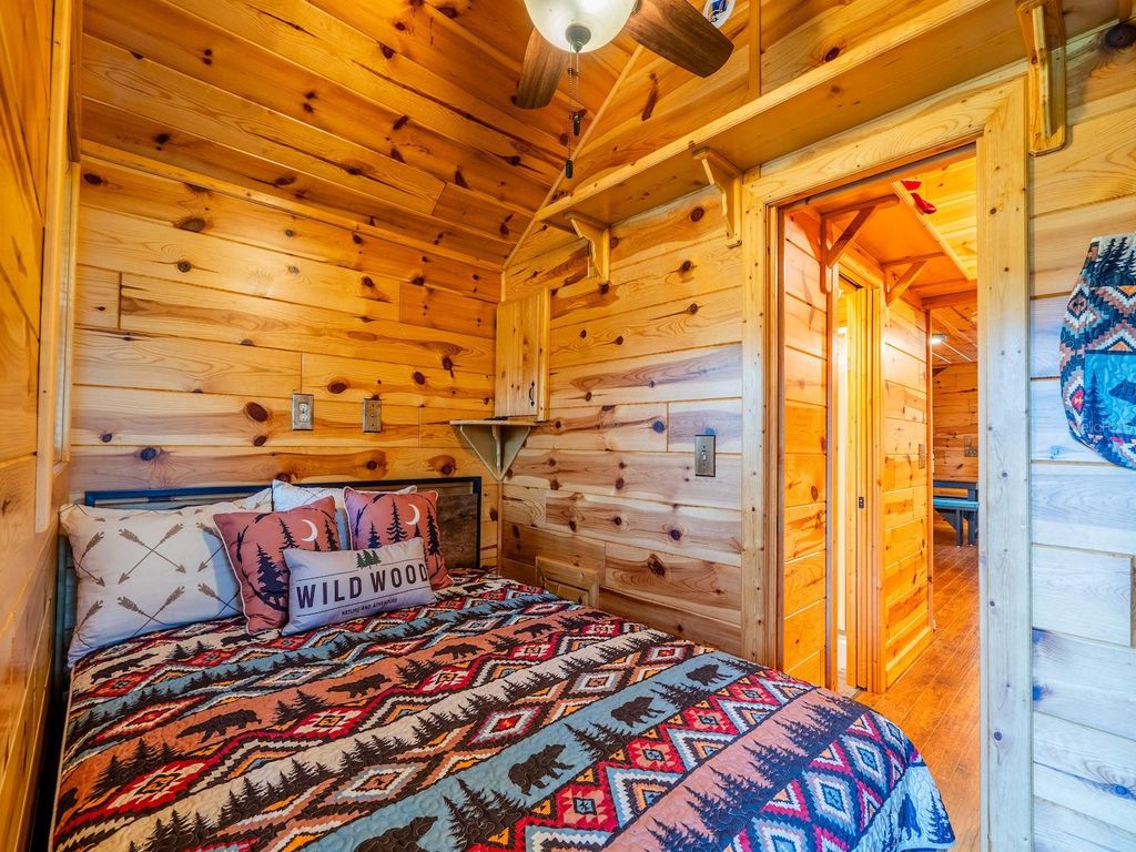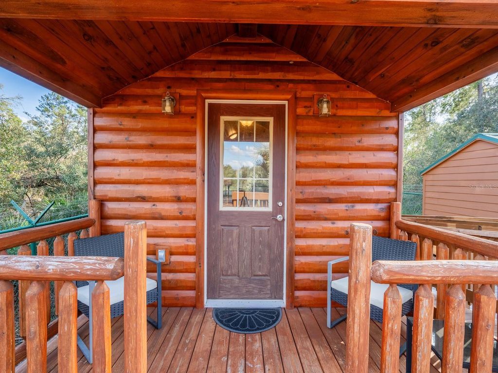 Private 25.83-acre forest retreat located in the heart of the Ocala National Forest, bordering State of Florida land, touching Grass Lake, and offering scenic views and access to Grassy Lake/Lake Eaton. This secluded estate provides exceptional privacy while remaining conveniently located in the Silver Springs community and Ocala Metropolitan area. Ideal for a private retreat, multi-generational compound or homestead, the property blends resort-style amenities with extensive outdoor recreation. The property features six fully furnished cabins, five completed in 2022 and a cabin in the woods completed in 2024. Cabin 1 (Main Cabin) offers 2 bedrooms and 2 baths in a split floor plan (approx. 844 SF) with vinyl and laminate flooring, full kitchen with wood cabinets and hard-surface countertops, and a 24'x20' deck overlooking the pond with paver parking. Cabin 2 includes 2 bedrooms, 1 bath with loft sleeping area (approx. 385 SF), full kitchen with wood cabinets and solid-surface countertops, hall bunk beds, and front and rear decks overlooking the pond. Cabin 3 features 2 bedrooms, 1 bath with loft sleeping area, full kitchen with wood cabinets and solid-surface countertops, hall bunk beds, fireplace, laundry, and decks overlooking the pond. Cabin 4 offers 1 bedroom, 1 bath with hall bunk beds (approx. 297 SF), wood cabinets, Formica countertops, and a 12'x15' front deck with wheelchair ramp overlooking the Rainbow playground system. Cabin 5 features 2 bedrooms and 2 baths in a split floor plan (approx. 742 SF) with laminate flooring, full kitchen with wood cabinets and hard-surface countertops, laundry, a 16'x16' deck overlooking the pond, and rear paver patio with forest views. Cabin 6 is a cozy woodland cabin with loft bedroom, 1 bath, open floor plan (approx. 340 SF), compact kitchen with range and oven, compact refrigerator, and screened front porch overlooking the woods. At the center of the property is a 2,240 SF tiki hut designed for entertaining, featuring a fully equipped outdoor kitchen with gas burners, granite countertops, a 13'x10' enclosed prep kitchen, storage, large screen TV, lounge seating, oversized fans, and bright lighting. Additional amenities include an above-ground pool, massive Rainbow playground system, and a private pond with liner, stocked fish, and automatic feeders ideal for fishing or paddle boating. A paver gathering area with wood-burning fire pit, beach-style area, and kids' cottage overlooks the pond. Approximately four acres of the main resort area are enclosed with 8' chain-link fencing with concrete footers and barbed wire topping, and extensive gravel, pavers, and artificial turf provide low-maintenance living. Outdoor features include miles of custom trails for ATVs, four-wheelers, or horseback riding, direct access to Ocala National Forest trails, scenic lake views from the rear of the property, and a private tiki-style shooting range with leaning/loading table and seating. The property is farm and homestead ready with electrified fenced area including building for goats, covered are, two chicken coops, fruit trees, garden areas with some irrigation, and electric fencing. Additional improvements include an 11'x25' building previously used as a private gym, three shipping containers for storage, and a seventh prepped home site ready for future expansion. Schedule your private tour today! You will not be disappointed!!!