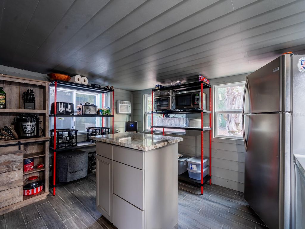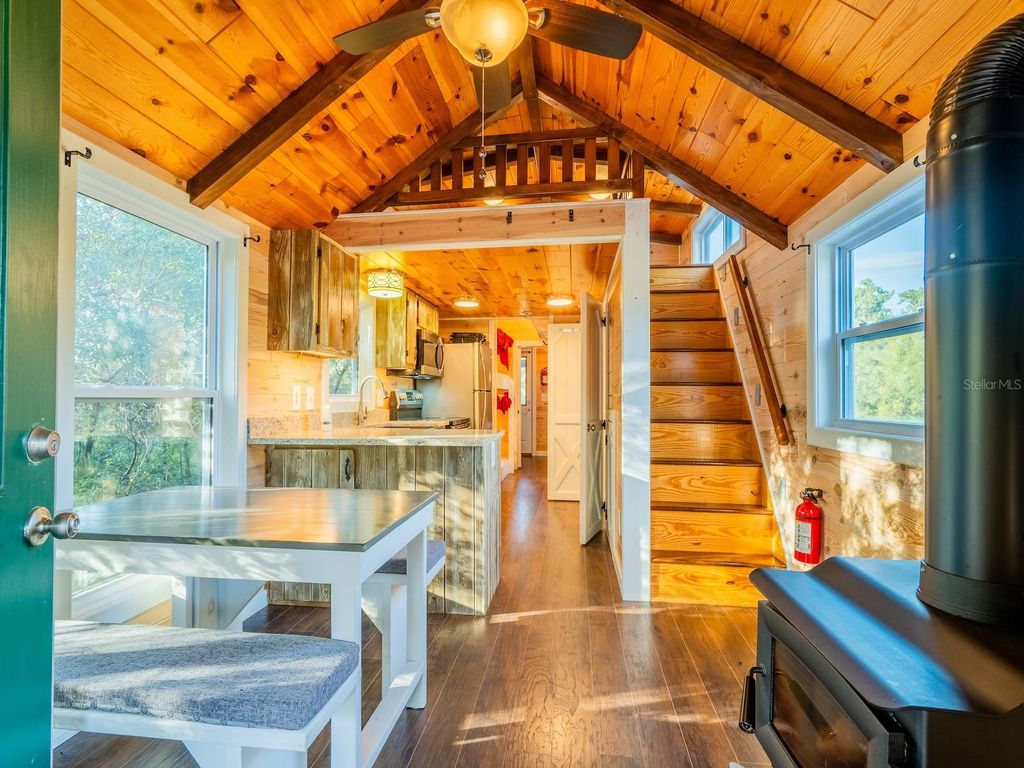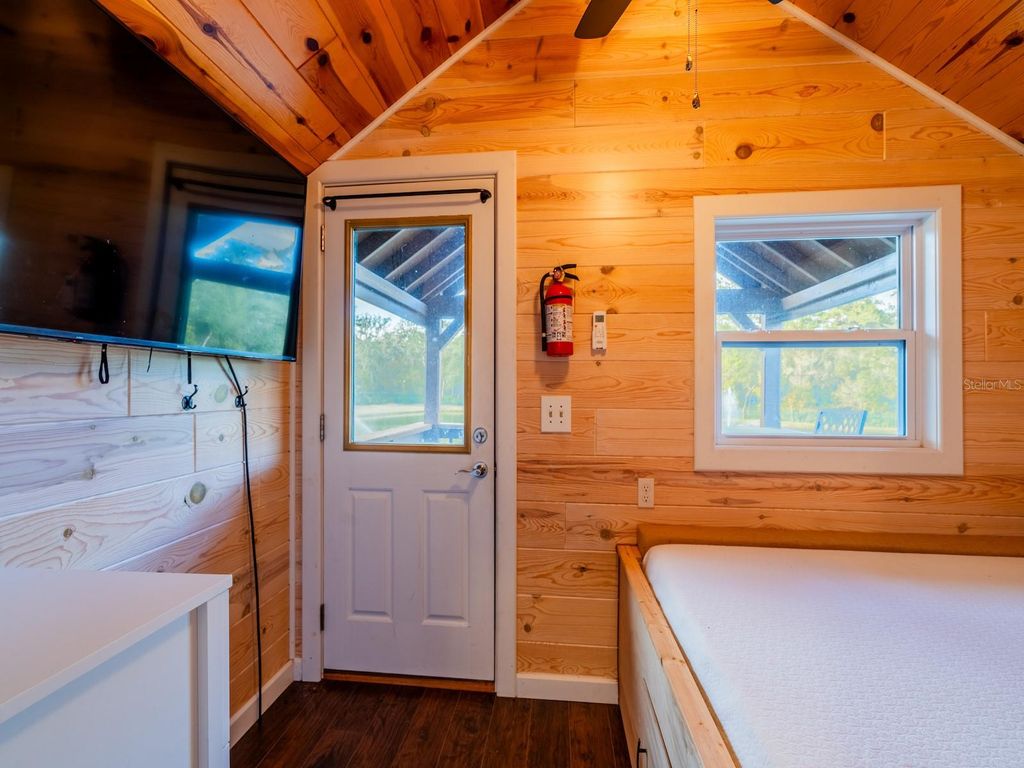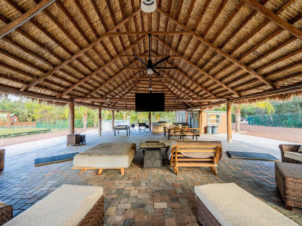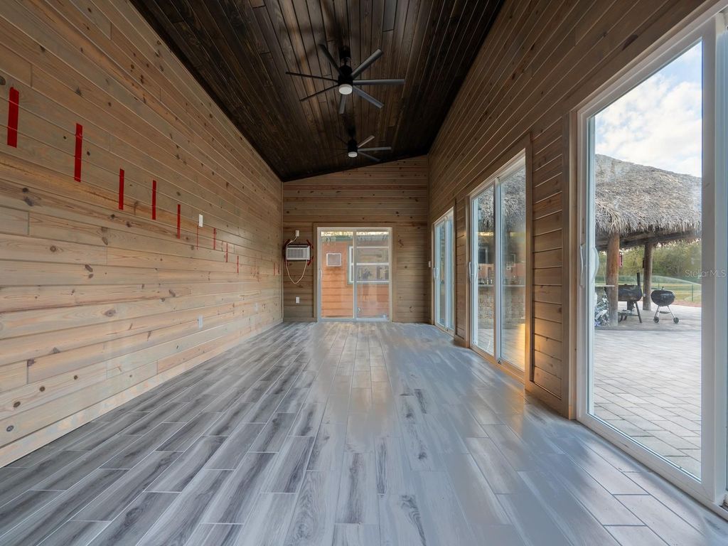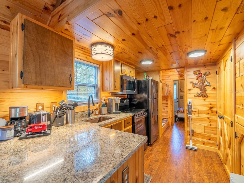 Private 25.83-acre forest retreat located in the heart of the Ocala National Forest, bordering State of Florida land, touching Grass Lake, and offering scenic views and access to Grassy Lake/Lake Eaton. This secluded estate provides exceptional privacy while remaining conveniently located in the Silver Springs community and Ocala Metropolitan area. Ideal for a private retreat, multi-generational compound or homestead, the property blends resort-style amenities with extensive outdoor recreation. The property features six fully furnished cabins, five completed in 2022 and a cabin in the woods completed in 2024. Cabin 1 (Main Cabin) offers 2 bedrooms and 2 baths in a split floor plan (approx. 844 SF) with vinyl and laminate flooring, full kitchen with wood cabinets and hard-surface countertops, and a 24'x20' deck overlooking the pond with paver parking. Cabin 2 includes 2 bedrooms, 1 bath with loft sleeping area (approx. 385 SF), full kitchen with wood cabinets and solid-surface countertops, hall bunk beds, and front and rear decks overlooking the pond. Cabin 3 features 2 bedrooms, 1 bath with loft sleeping area, full kitchen with wood cabinets and solid-surface countertops, hall bunk beds, fireplace, laundry, and decks overlooking the pond. Cabin 4 offers 1 bedroom, 1 bath with hall bunk beds (approx. 297 SF), wood cabinets, Formica countertops, and a 12'x15' front deck with wheelchair ramp overlooking the Rainbow playground system. Cabin 5 features 2 bedrooms and 2 baths in a split floor plan (approx. 742 SF) with laminate flooring, full kitchen with wood cabinets and hard-surface countertops, laundry, a 16'x16' deck overlooking the pond, and rear paver patio with forest views. Cabin 6 is a cozy woodland cabin with loft bedroom, 1 bath, open floor plan (approx. 340 SF), compact kitchen with range and oven, compact refrigerator, and screened front porch overlooking the woods. At the center of the property is a 2,240 SF tiki hut designed for entertaining, featuring a fully equipped outdoor kitchen with gas burners, granite countertops, a 13'x10' enclosed prep kitchen, storage, large screen TV, lounge seating, oversized fans, and bright lighting. Additional amenities include an above-ground pool, massive Rainbow playground system, and a private pond with liner, stocked fish, and automatic feeders ideal for fishing or paddle boating. A paver gathering area with wood-burning fire pit, beach-style area, and kids' cottage overlooks the pond. Approximately four acres of the main resort area are enclosed with 8' chain-link fencing with concrete footers and barbed wire topping, and extensive gravel, pavers, and artificial turf provide low-maintenance living. Outdoor features include miles of custom trails for ATVs, four-wheelers, or horseback riding, direct access to Ocala National Forest trails, scenic lake views from the rear of the property, and a private tiki-style shooting range with leaning/loading table and seating. The property is farm and homestead ready with electrified fenced area including building for goats, covered are, two chicken coops, fruit trees, garden areas with some irrigation, and electric fencing. Additional improvements include an 11'x25' building previously used as a private gym, three shipping containers for storage, and a seventh prepped home site ready for future expansion. Schedule your private tour today! You will not be disappointed!!!