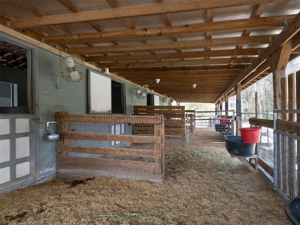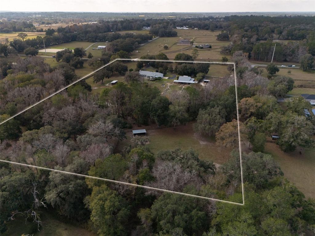 Ideally located just 3 minutes from Golden Ocala Country Club and less than 10 minutes from the World Equestrian Center, this exceptional horse farm is tucked along a quiet, peaceful road, offering both privacy and convenient access to Ocala's premier equestrian venues. The 12-acre property is fully fenced and cross-fenced with partial electric fencing and features beautiful mature oak trees, magnolias, and manicured landscaping throughout. A circular driveway welcomes you to the property, while a stocked pond and quiet stream add charm to the land. The residence offers 3 bedrooms and 2.5 bathrooms with high ceilings and an inviting layout. The main bedroom is carpeted and offers fitted wood wardrobes, cabinets, and a desk, along with a walk-in closet, while the main bathroom features a large whirlpool tub, a spacious walk-in shower, and marble composite countertops with dual sinks. A separate office provides a quiet workspace, and both the living room and the breakfast/lounge area feature wood-burning fireplaces with custom hearths and mantels. French doors open to a peaceful lanai, completing the home's comfortable flow. The equestrian facilities are thoughtfully laid out and designed for everyday ease, offering a total of 13 stalls across the property. The barn includes 3 stalls and 4 substantial covered open stalls, all equipped with fans and automatic waterers, with stalls opening directly to fenced paddocks. Many paddocks are also fitted with automatic waterers. The barn further features an air-conditioned tack room, full bathroom, feed room, storage room with work area, and a wash rack with hot water. 3 separate 2-stall horse shelters include grooming areas and automatic waterers. Additional amenities include a bridle path, round pen, large concrete shavings bin, RV hookup, and a generator capable of powering both the home and barn. This property presents a rare opportunity to enjoy private, turnkey equestrian living in one of Ocala's most desirable locations, where peaceful surroundings meet proximity to world-class equestrian destinations.